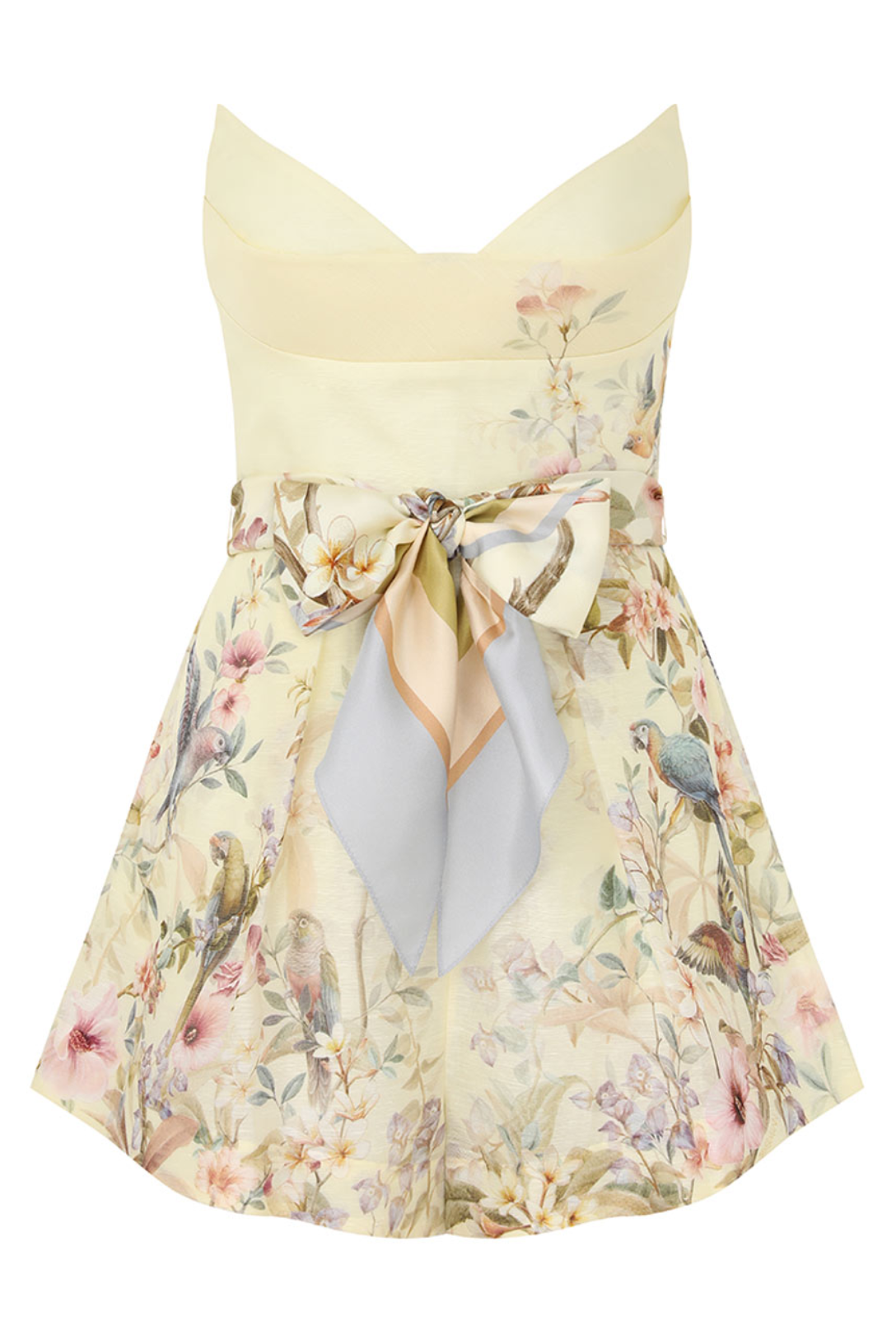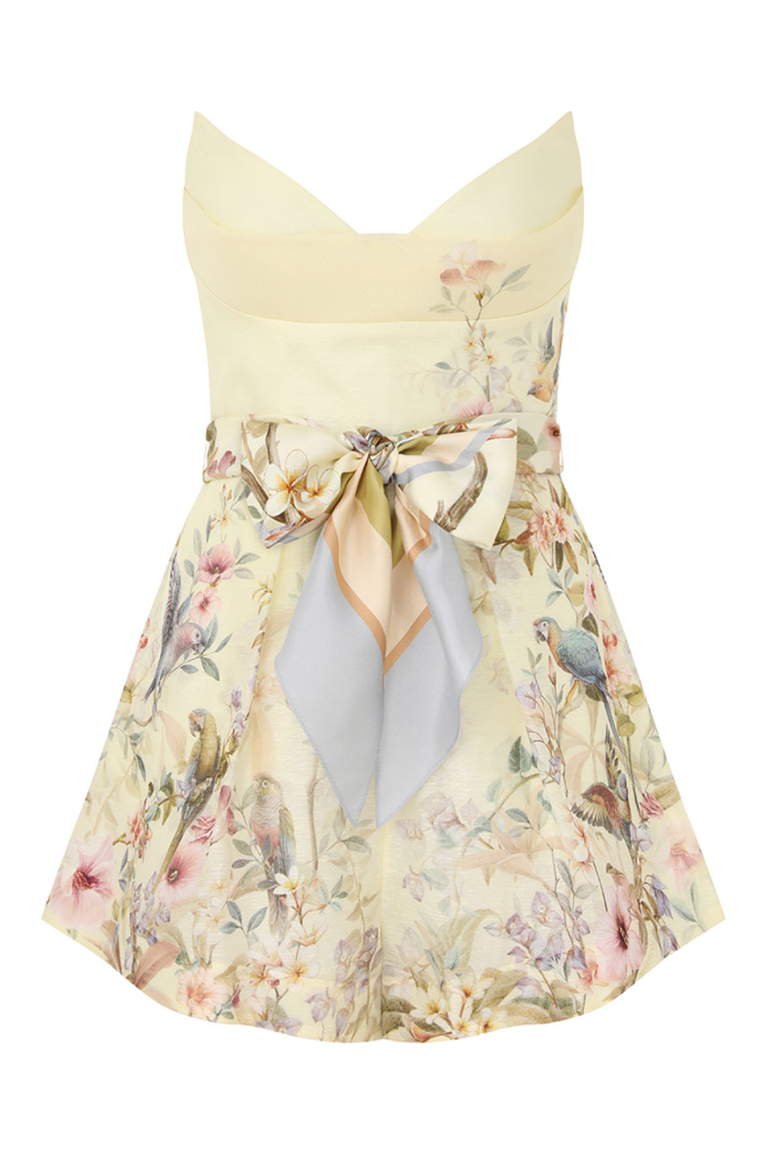 The Rebellion Fitted Playsuit in Lemon Aviary from Zimmermann's Cruise 2026 Collection, Twisted Romance. A silk-linen playsuit featuring a plunging V-neckline, invisible zip closure, finished with a flared hem.