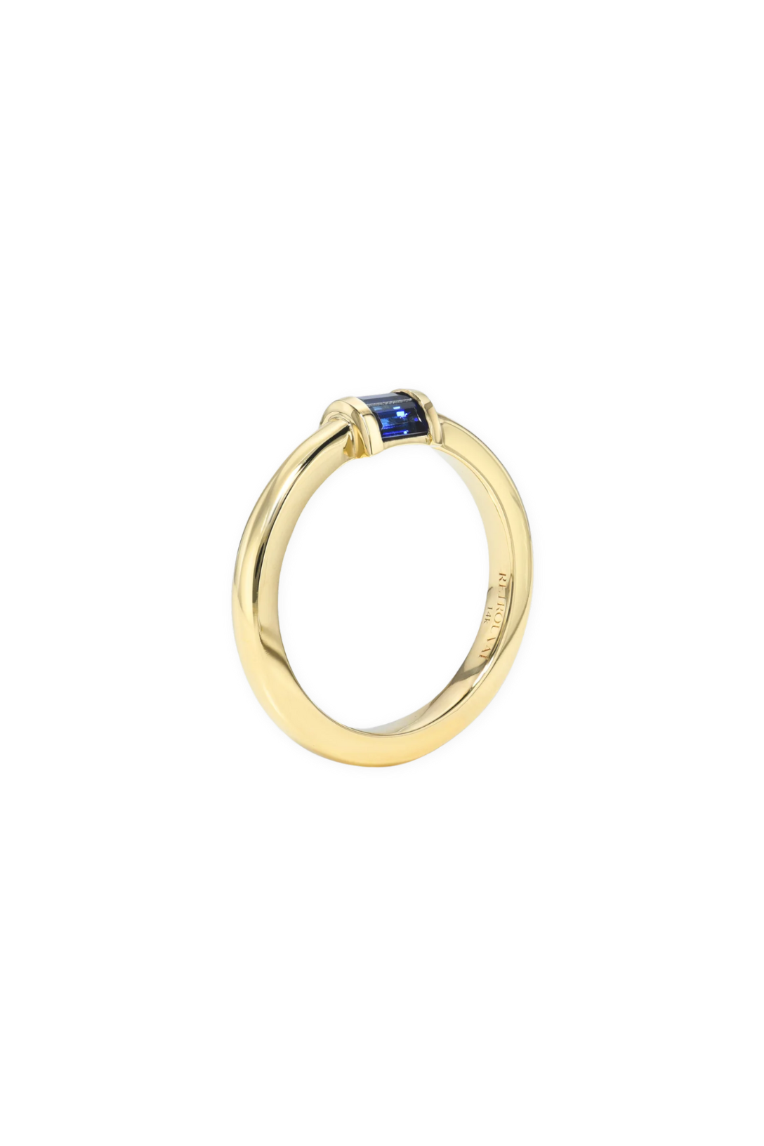 Polished 14K Yellow Gold ring with a 3 baguette barrel of Sapphires totaling .50cts.