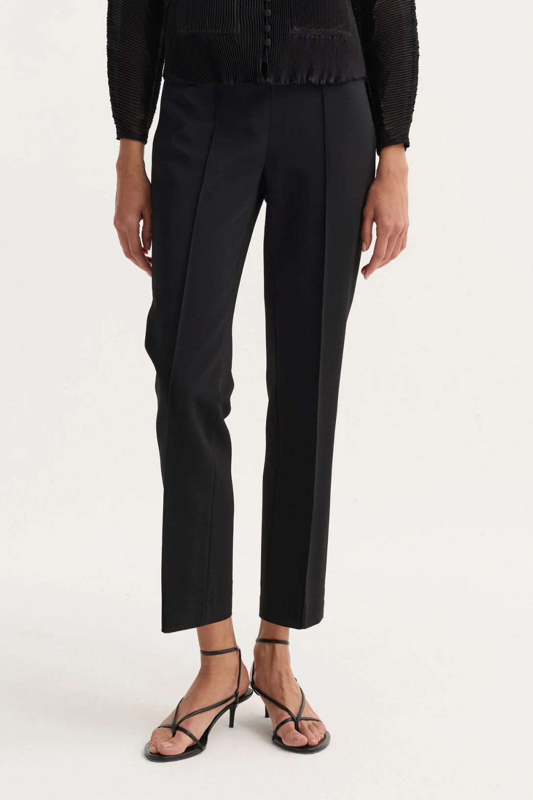 - Straight narrow leg, ankle length, high-rise fit