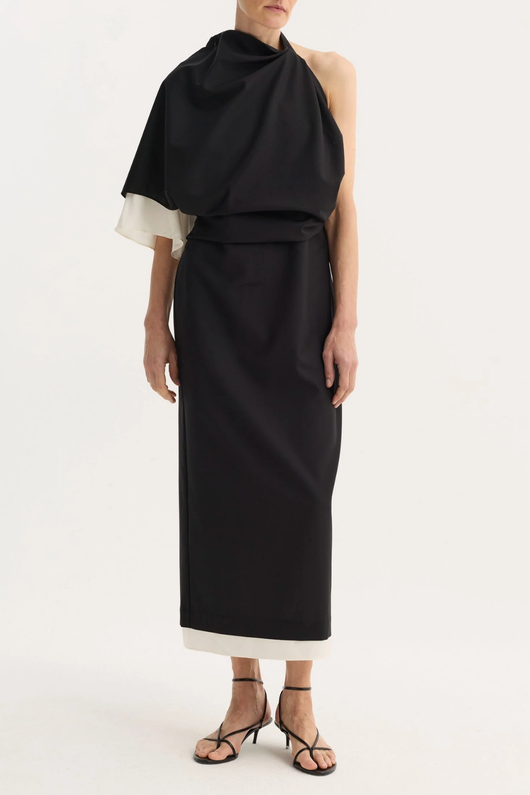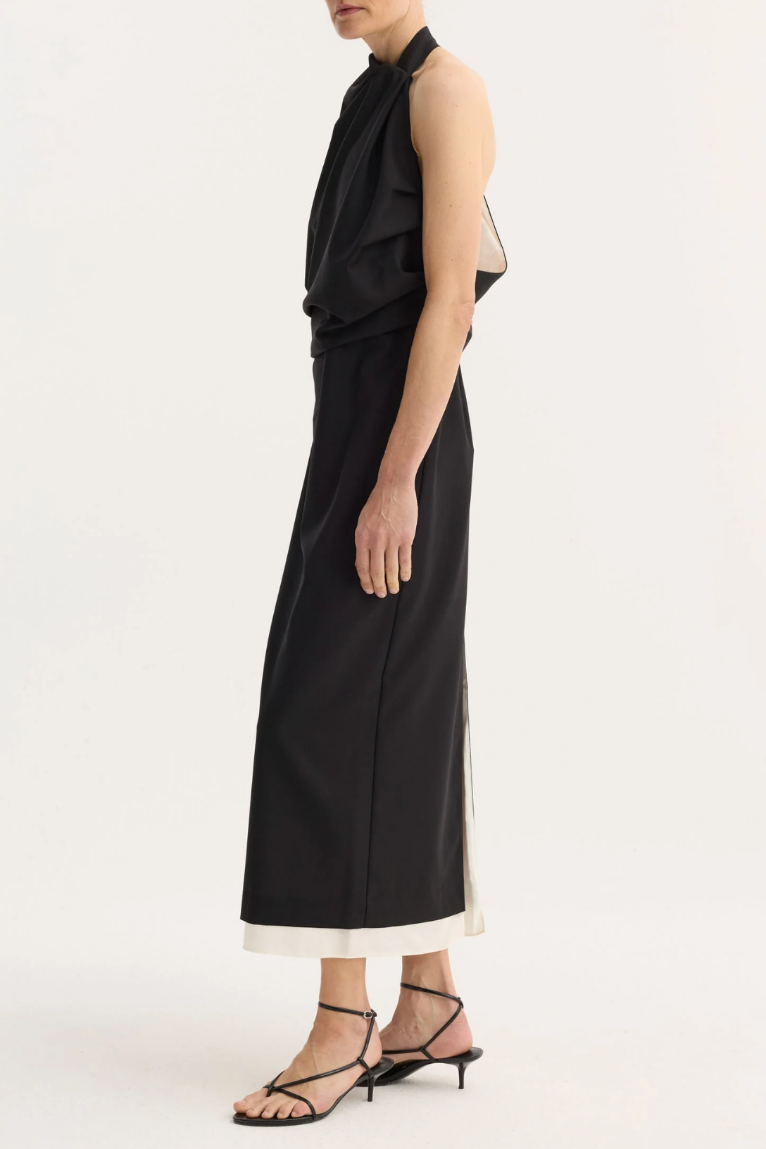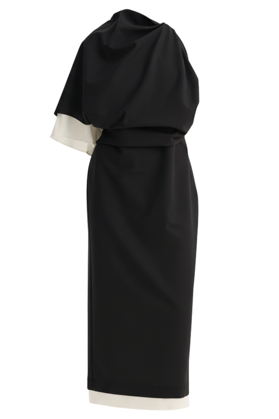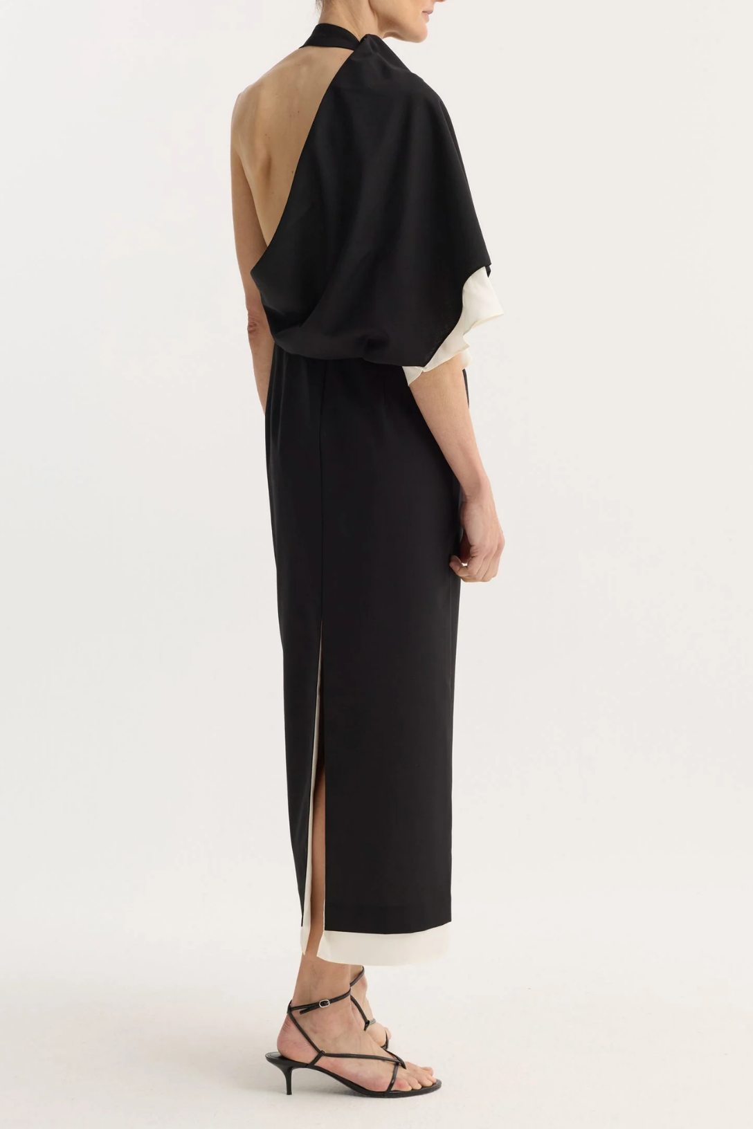 A draped dress that wraps around the body to define the waist. Designed with an open back and a single sleeve, finished with a contrasting silk insert. A back slit adds ease of movement.