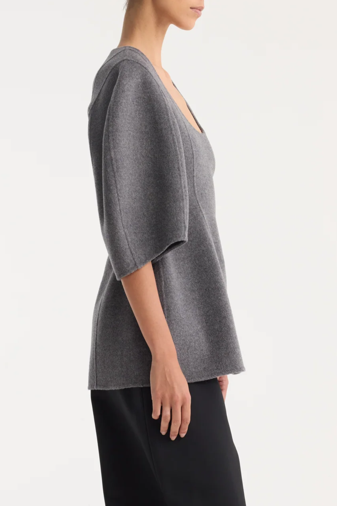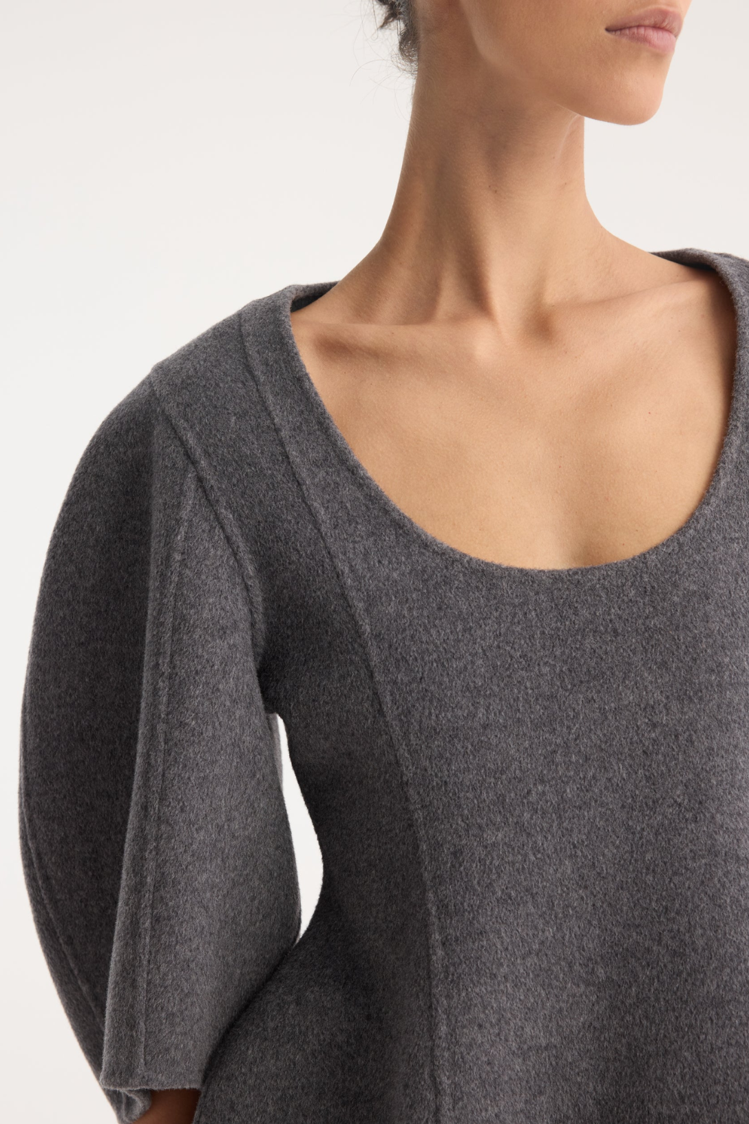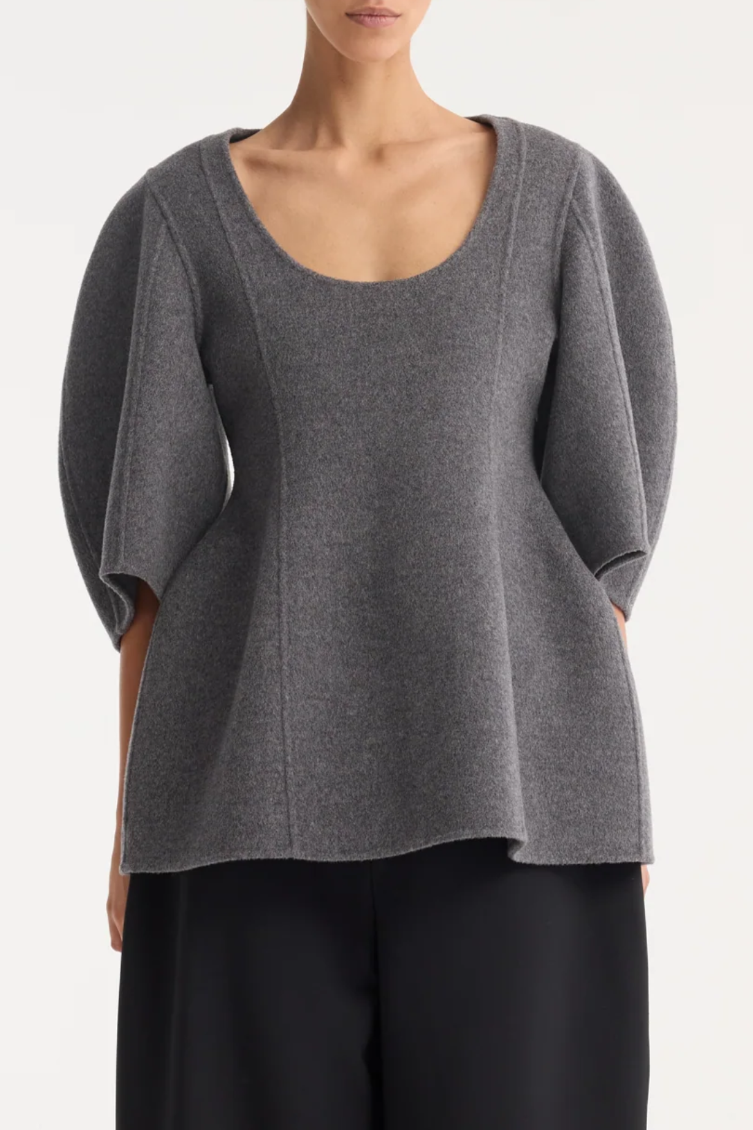 Crafted from a luxurious wool-cashmere blend the sculptural top features a dramatic deep scooped neckline and voluminous balloon sleeves cut to elbow length. The structured peplum flares gently from the waist, creating a feminine architectural form.