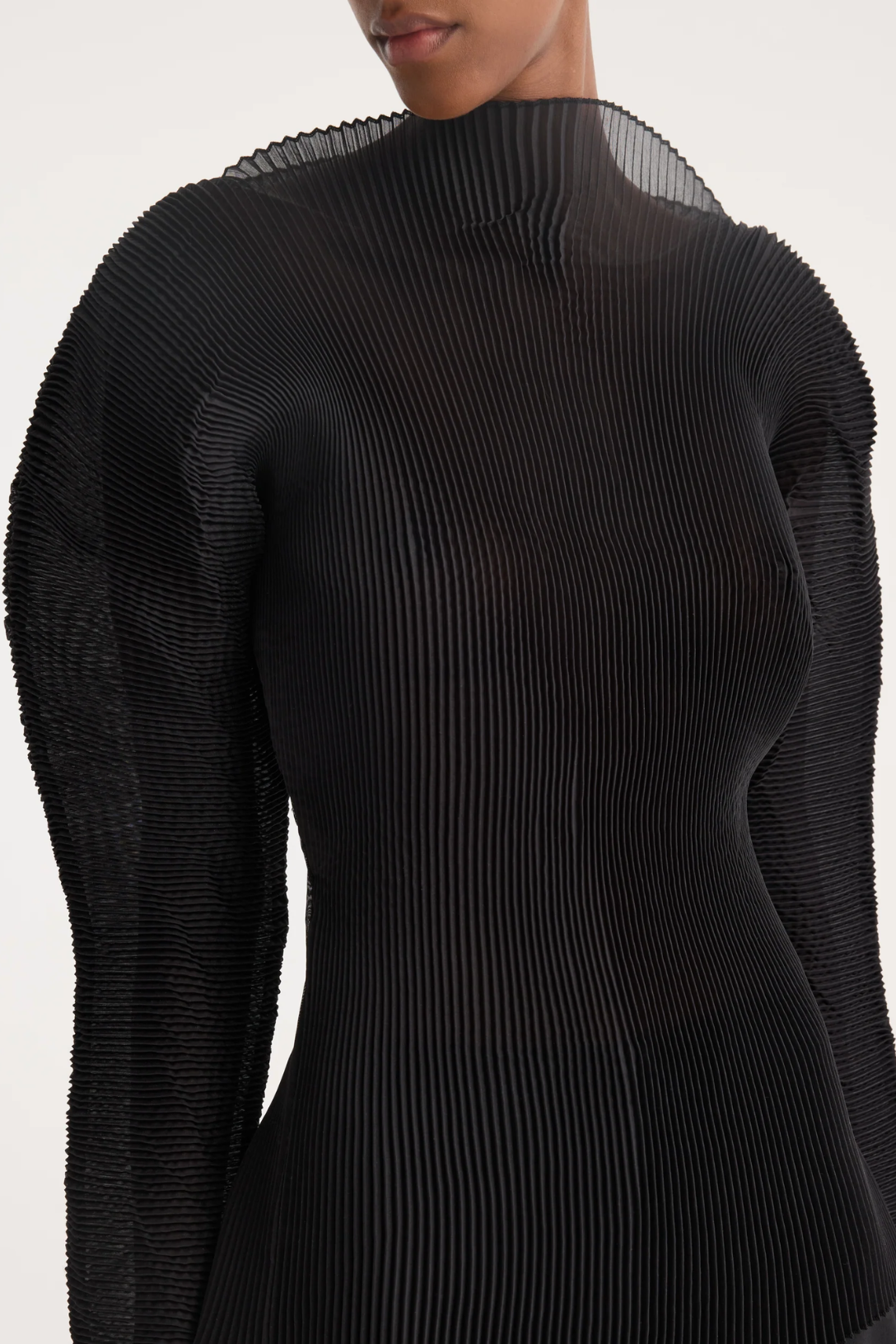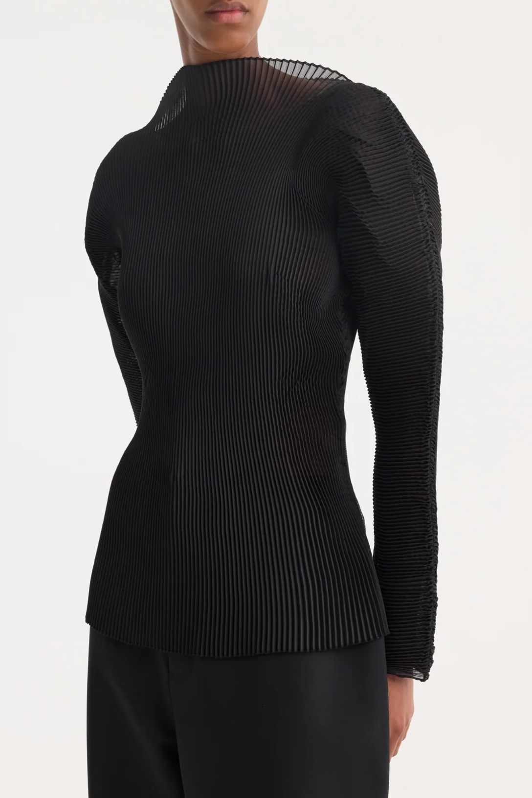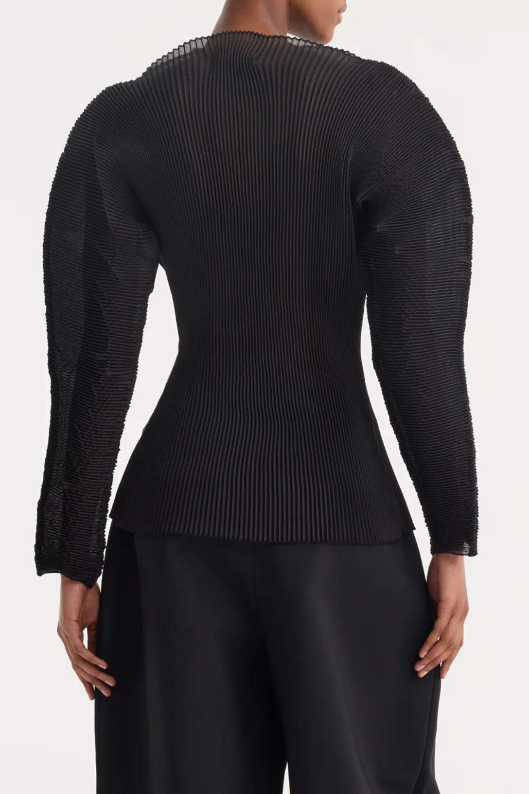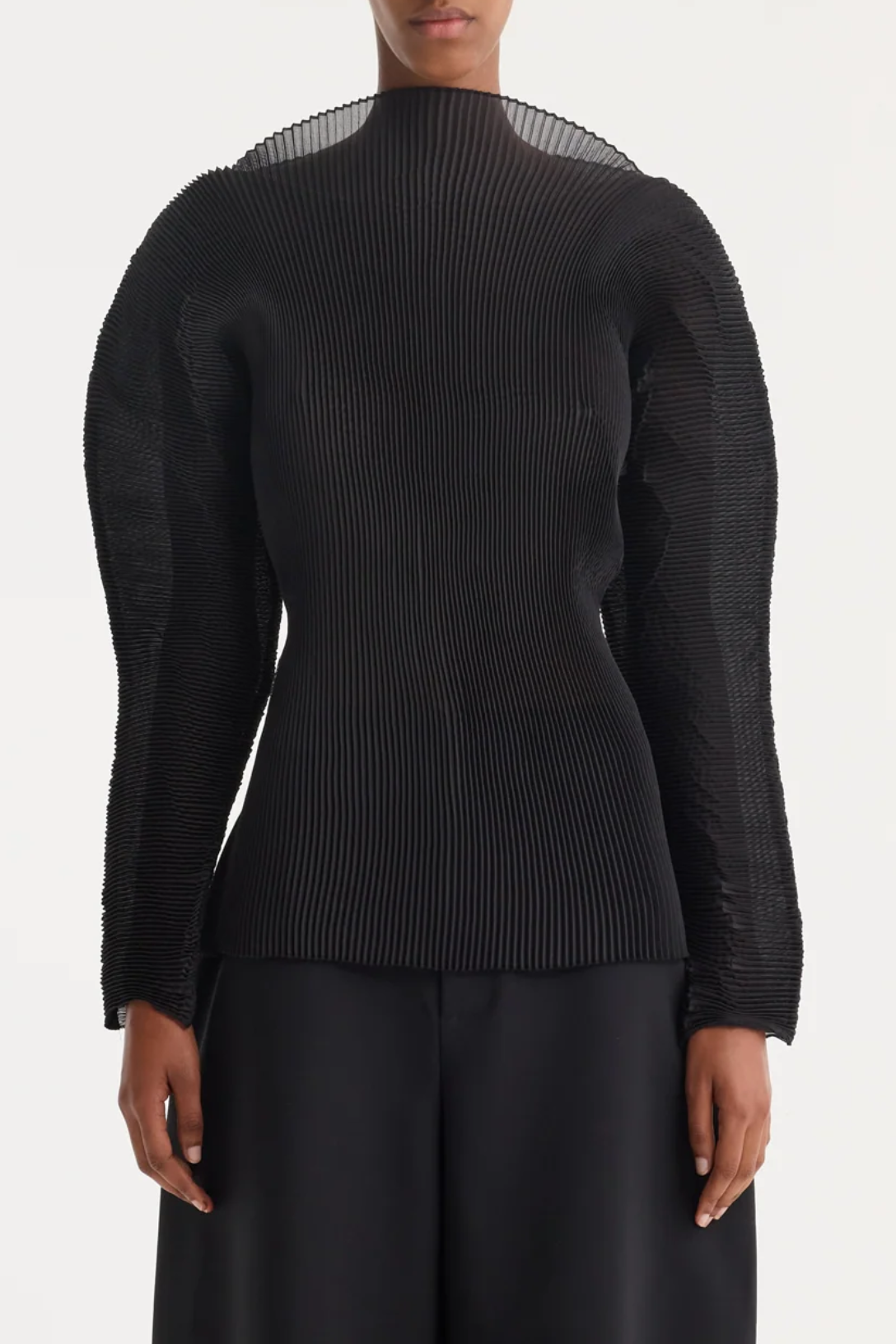 A striking sculptural silhouette crafted from semi-transparent plissé. This architectural top flows effortlessly around the body with rounded shapes extending into long, voluminous sleeves. A refined piece perfect for your elevated occasional wear.
