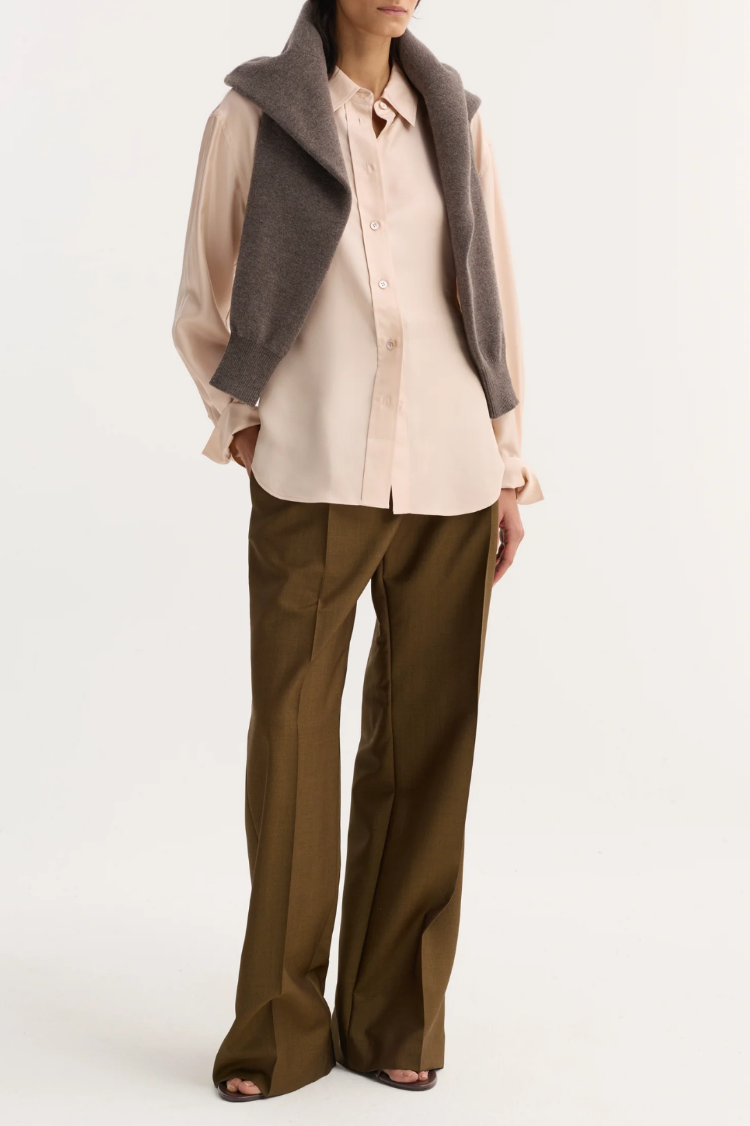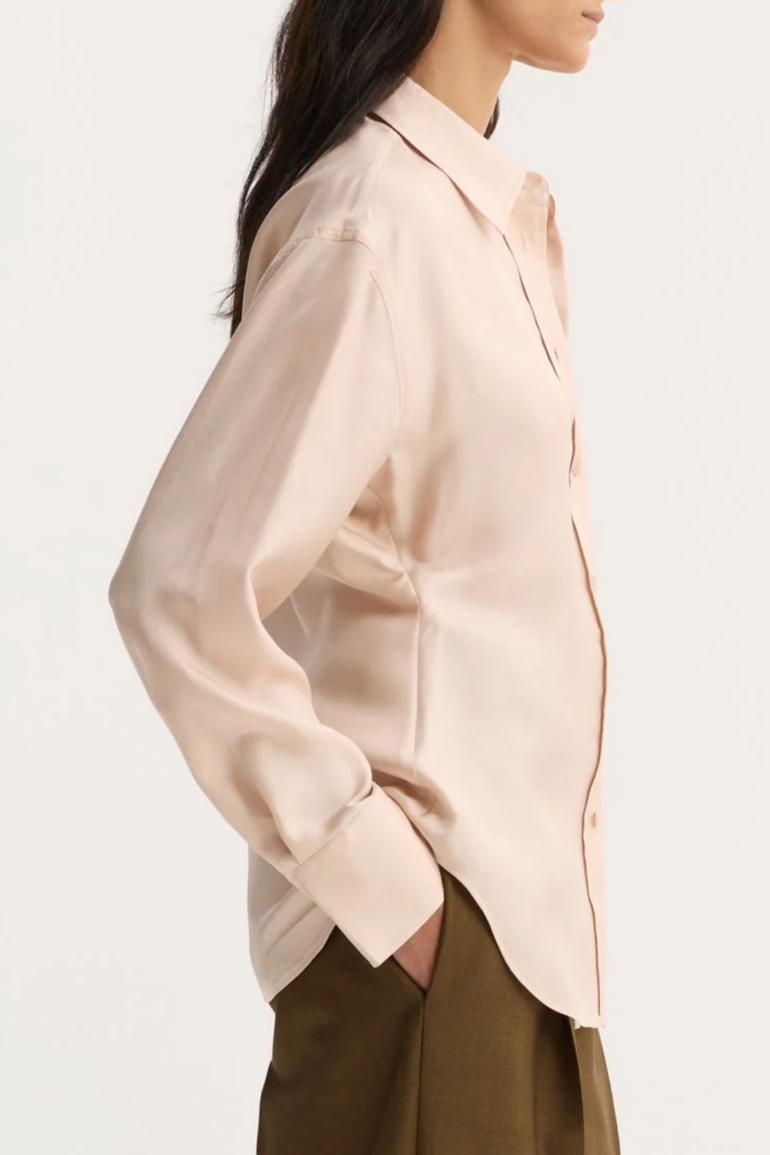 A button-down shaped shirt in a relaxed hourglass silhouette, crafted from fluid rose silk. Finished with a rounded hem, it brings soft structure and refined ease to everyday dressing.