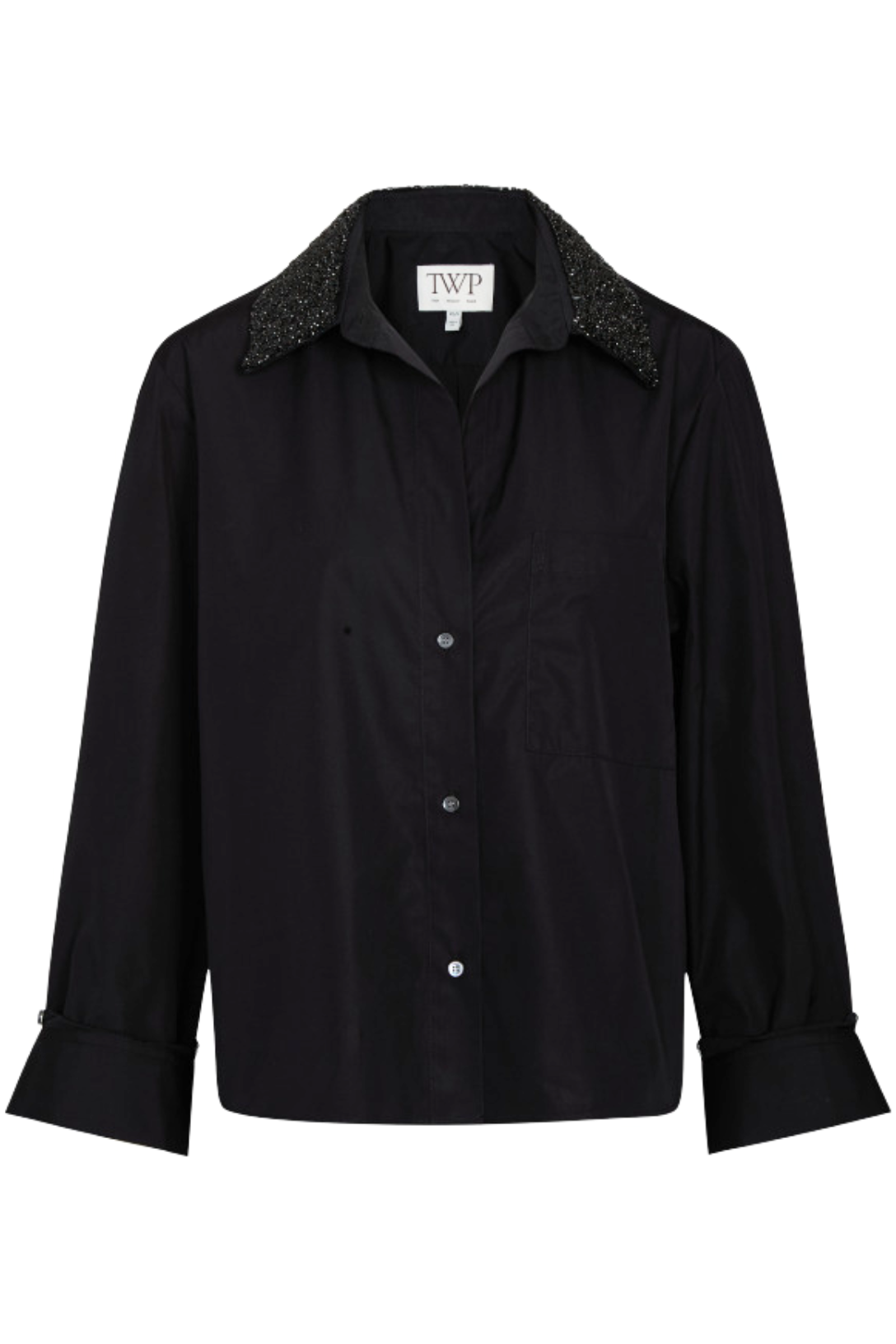 Cropped shirt in cotton poplin embellished with a sparkling prong-set crystal collar. Fabric is more structured poplin with a smooth texture and crisp hand feel. The Dude shirt has a relaxed fit. Complete with a spread collar, button-up placket, and chest patch pocket.