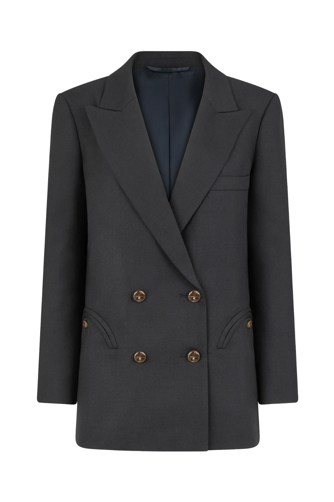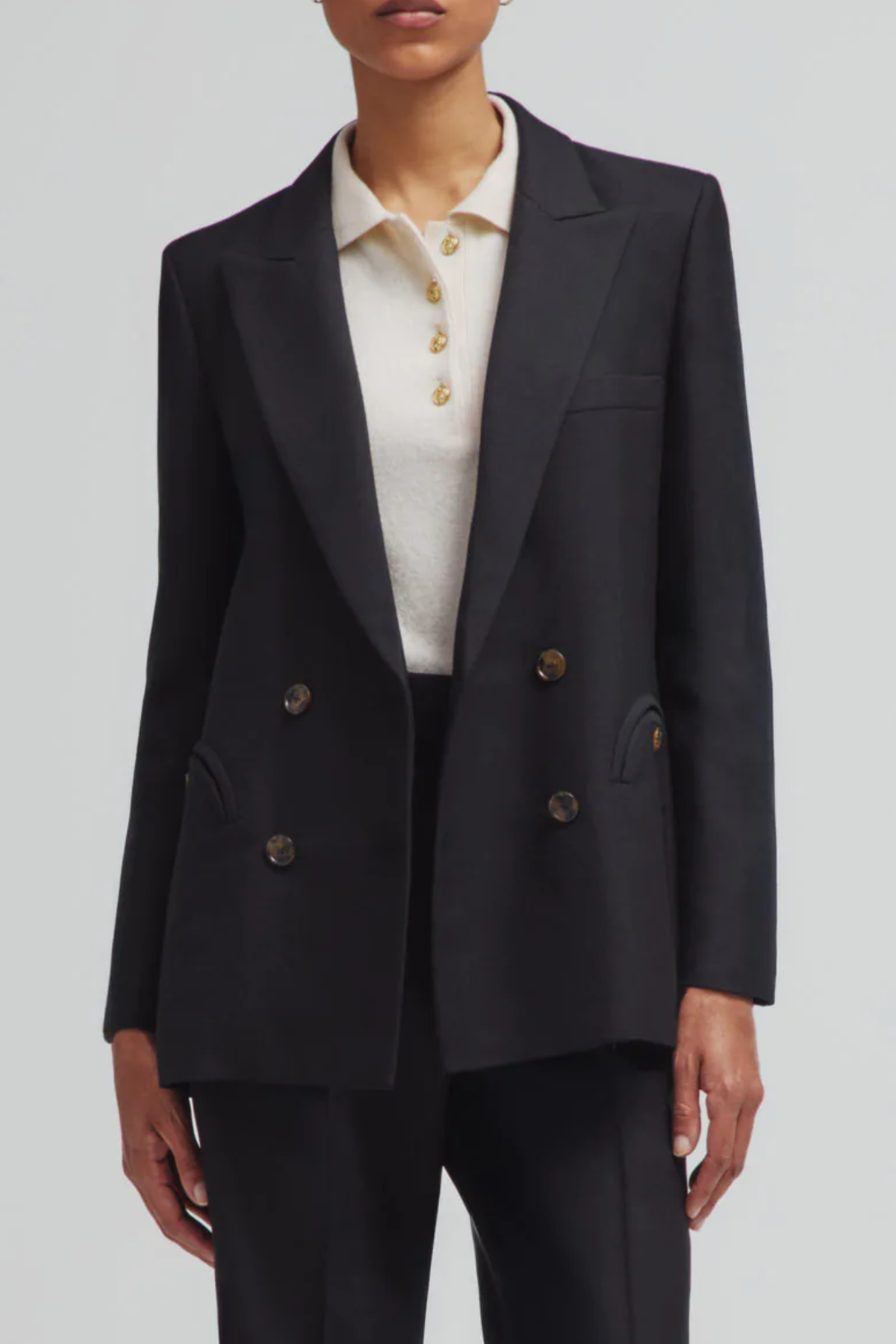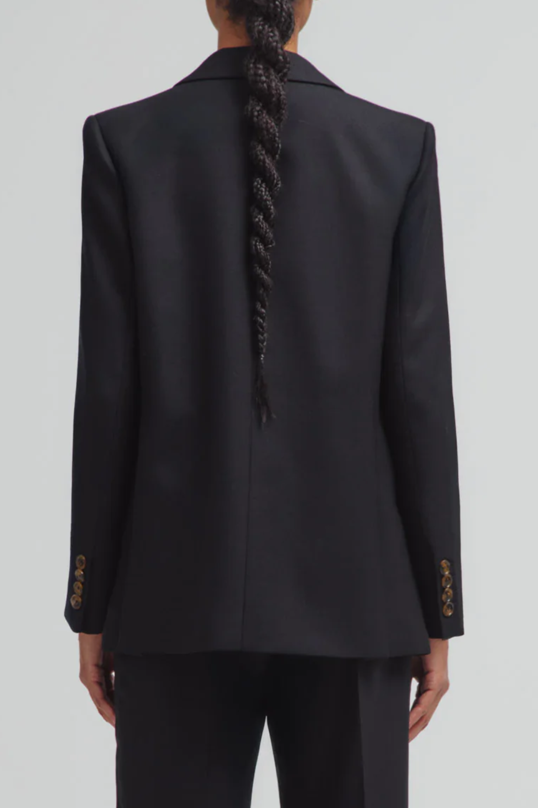 In BLAZÉ's boxy Evernight fit, the 'Alcanara Black' blazer crafted from light virgin-wool twill transitions seamlessly from office to evening, year-round. Featuring sharp shoulders, a relaxed oversized fit, and glossy brown buttons for a subtle finishing touch.