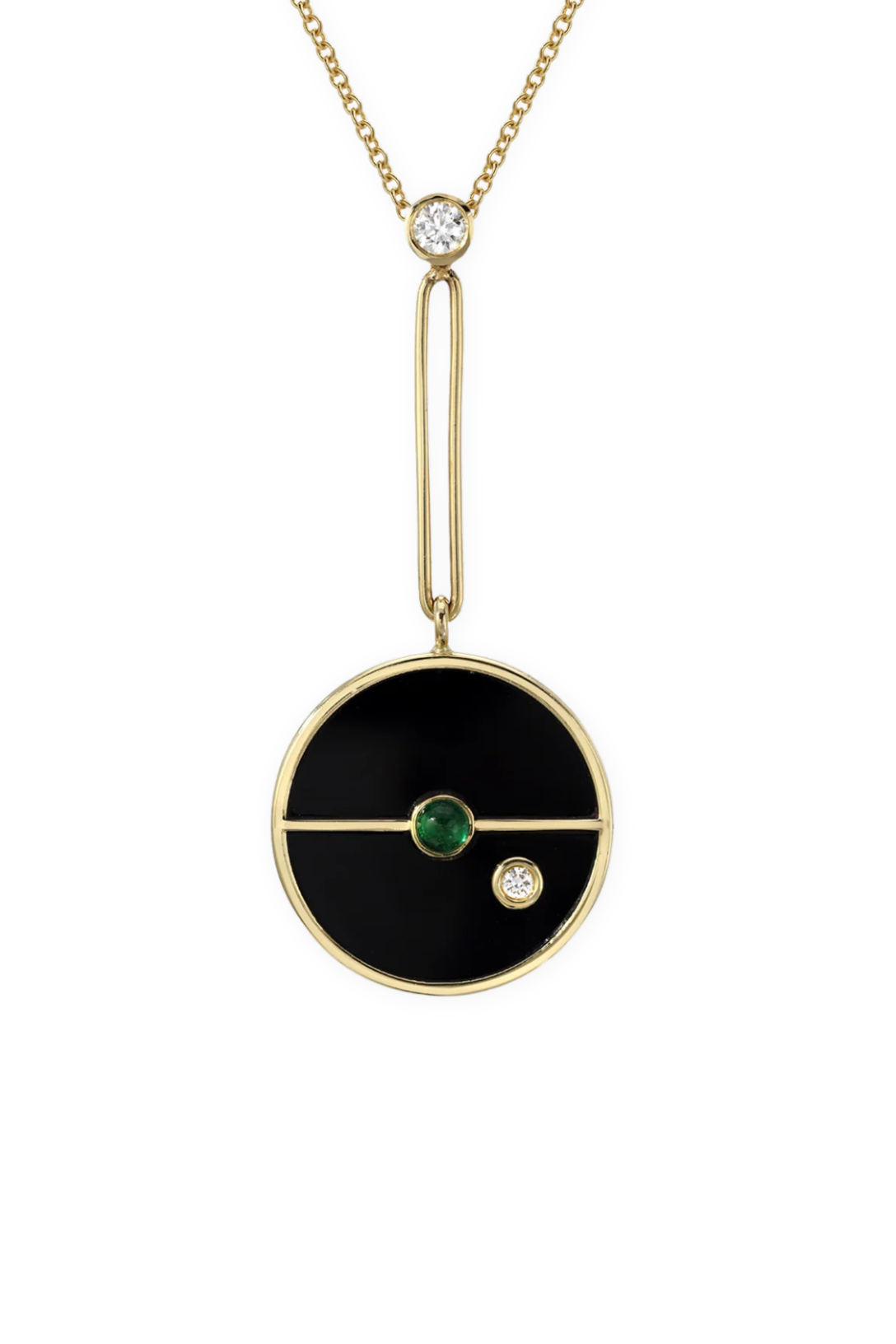 - Black Onyx inlay set in 14K Yellow Gold with 0.12ct white diamonds and 0.10ct emerald