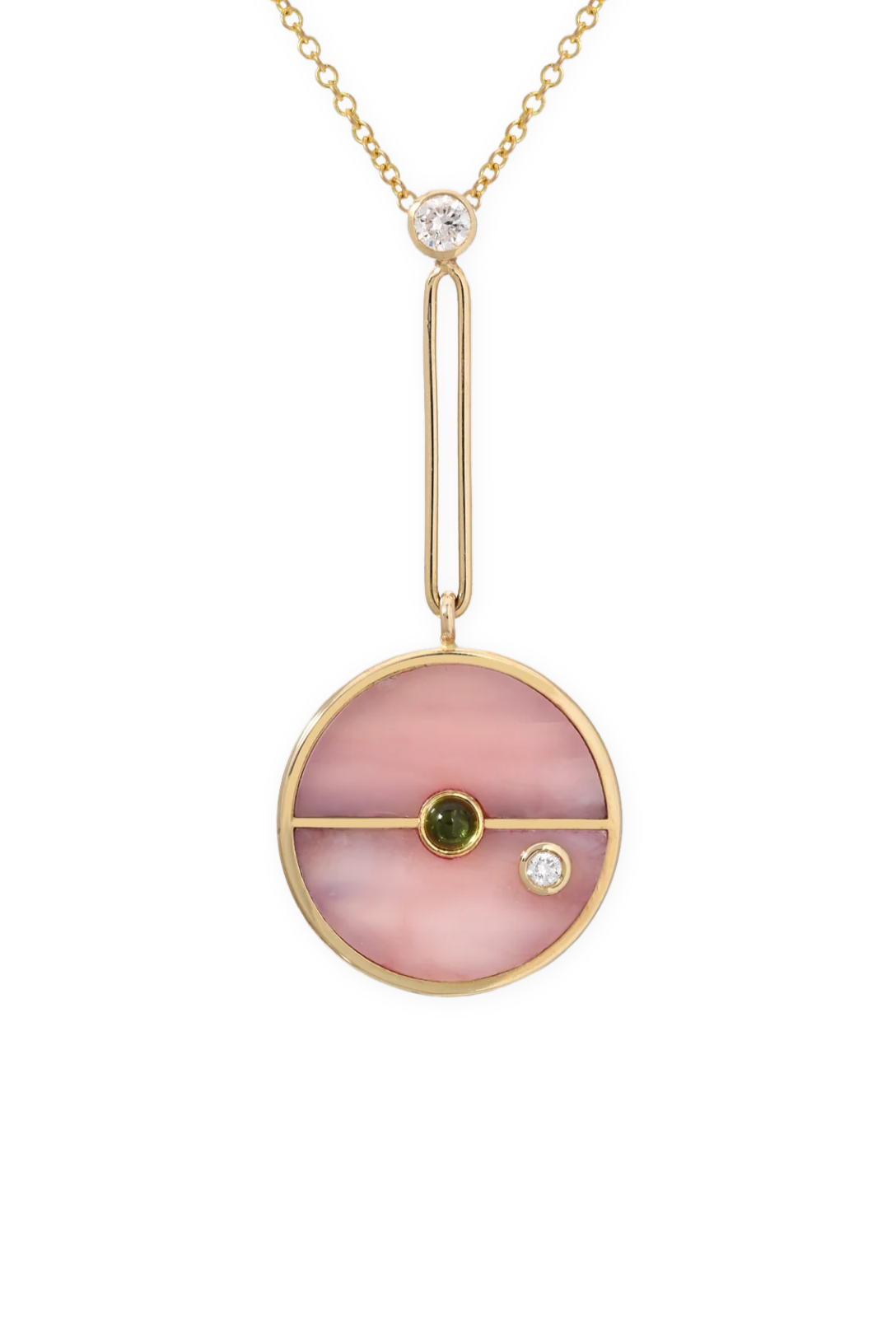 - Pink Opal inlay set in 14K Yellow Gold with 0.12ct white diamonds and 0.10ct green tourmaline