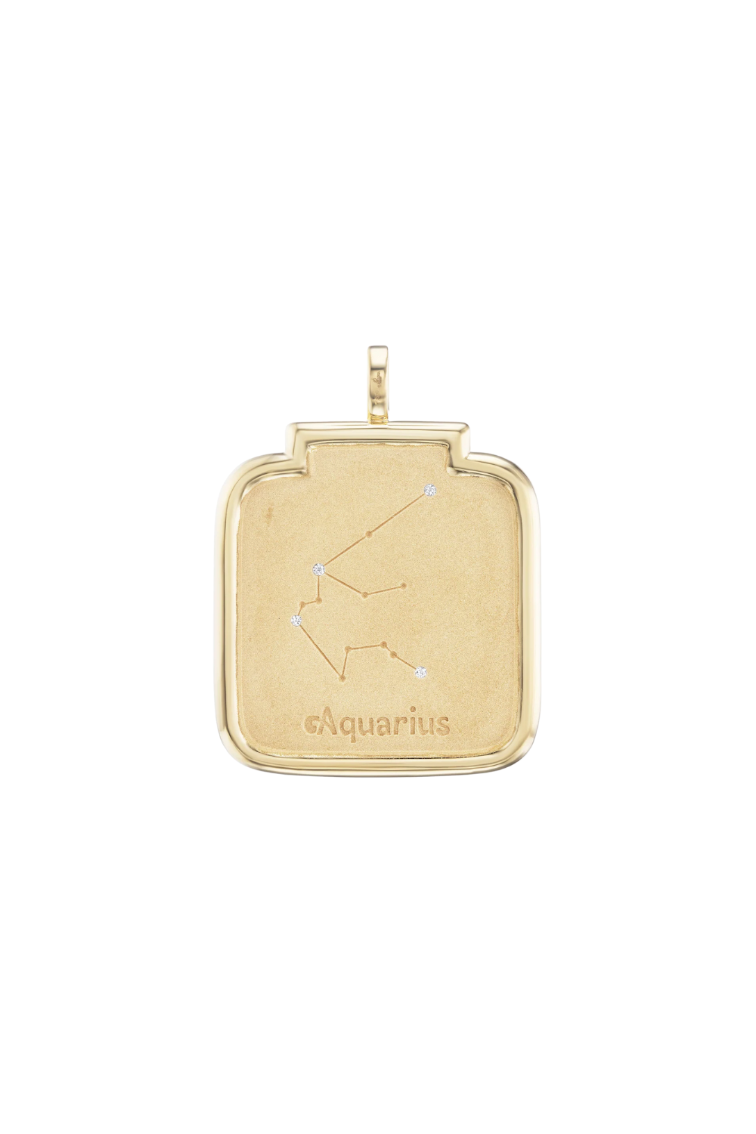 Handcrafted in 18K Yellow Gold with 0.20 cttw G-H/SI diamonds, this pendant features pouring water, representing the Aquarius zodiac, pictured on the front. On the reverse, the magic continues with an engraved constellation, featuring diamonds in the place of stars, offering a subtle yet captivating representation of the night sky. This personal talisman invites you to carry both your astrological identity and the cosmic forces that shape your destiny.