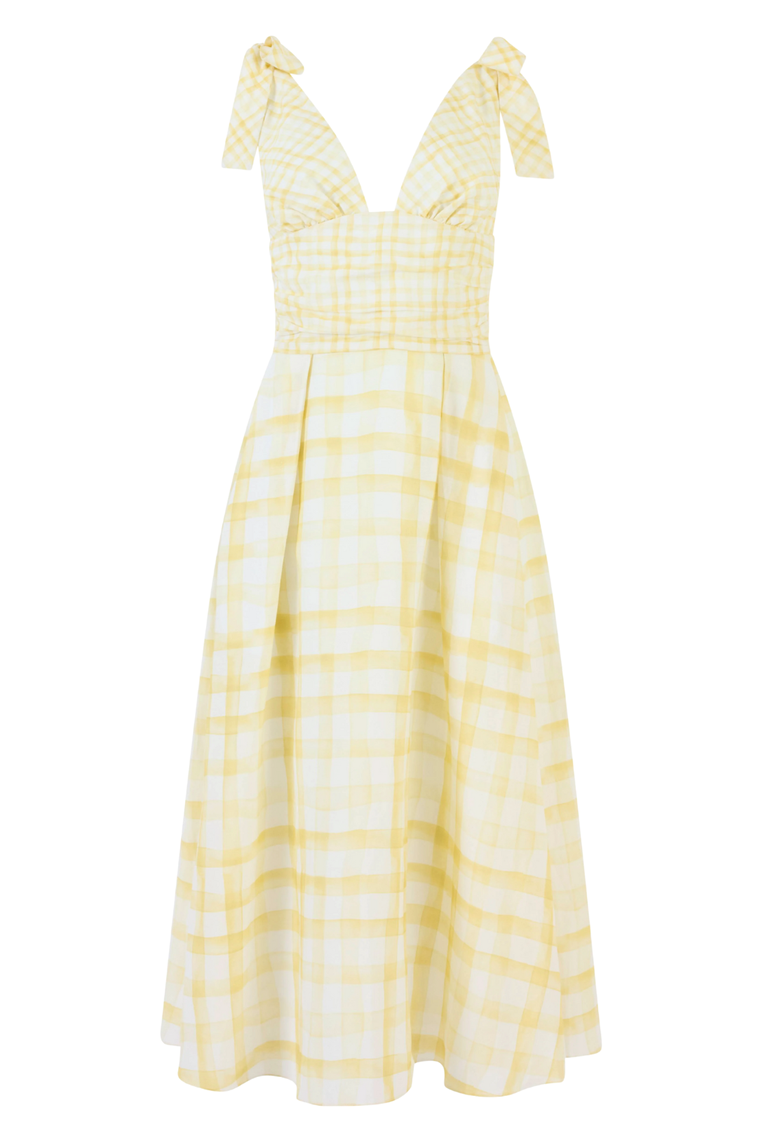 The Bow Shoulder Dress feels like sunlight made wearable. Cut in watercolor gingham, it balances softness and structure through a plunging neckline, a gently defined waist, and a skirt that floats with an easy, unforced grace.