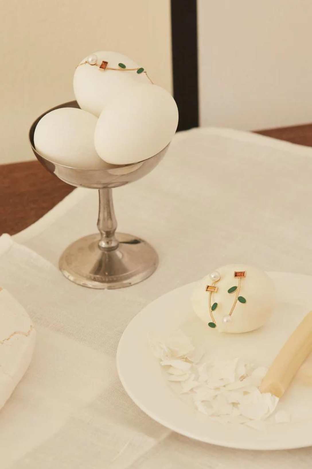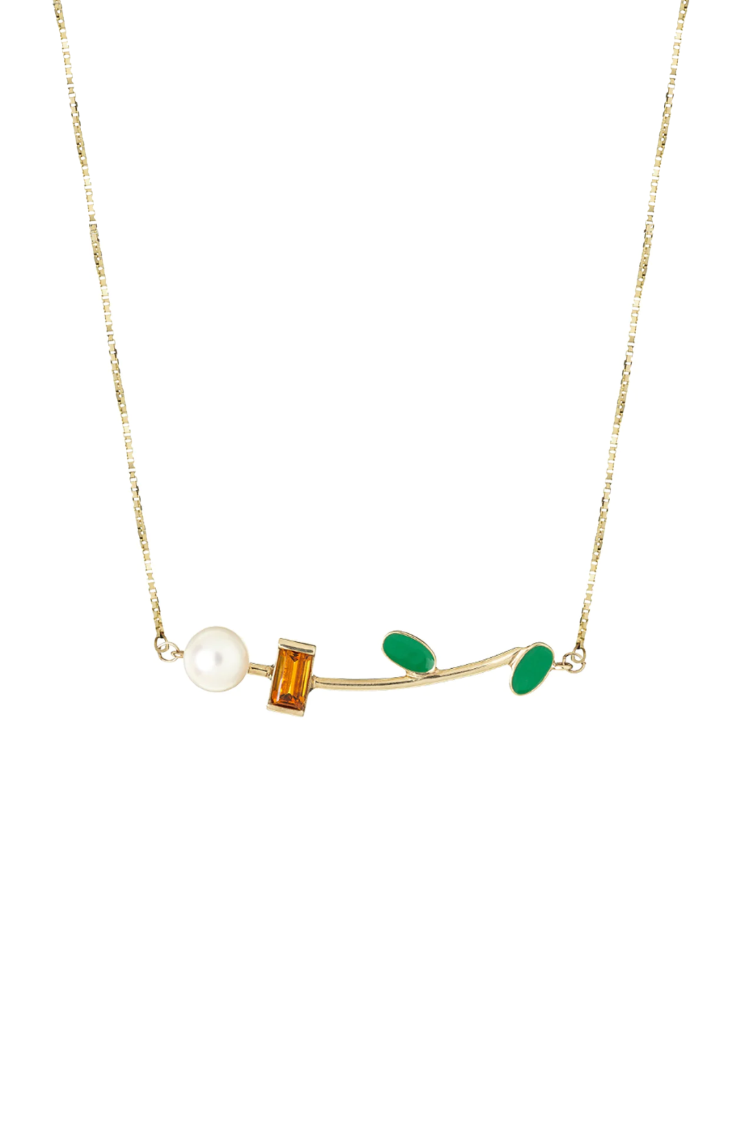 - Material: 18K Yellow Gold, Freshwater pearl, Citrine in baguette cut, Hand-painted in pistachio green enamel