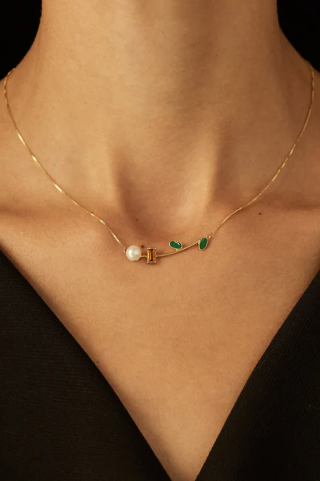 Petalos Flor necklace is Aliita's abstract interpretation of a delicate flower, with pearl and citrine baguette stone.