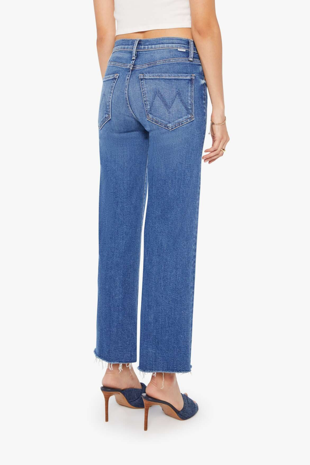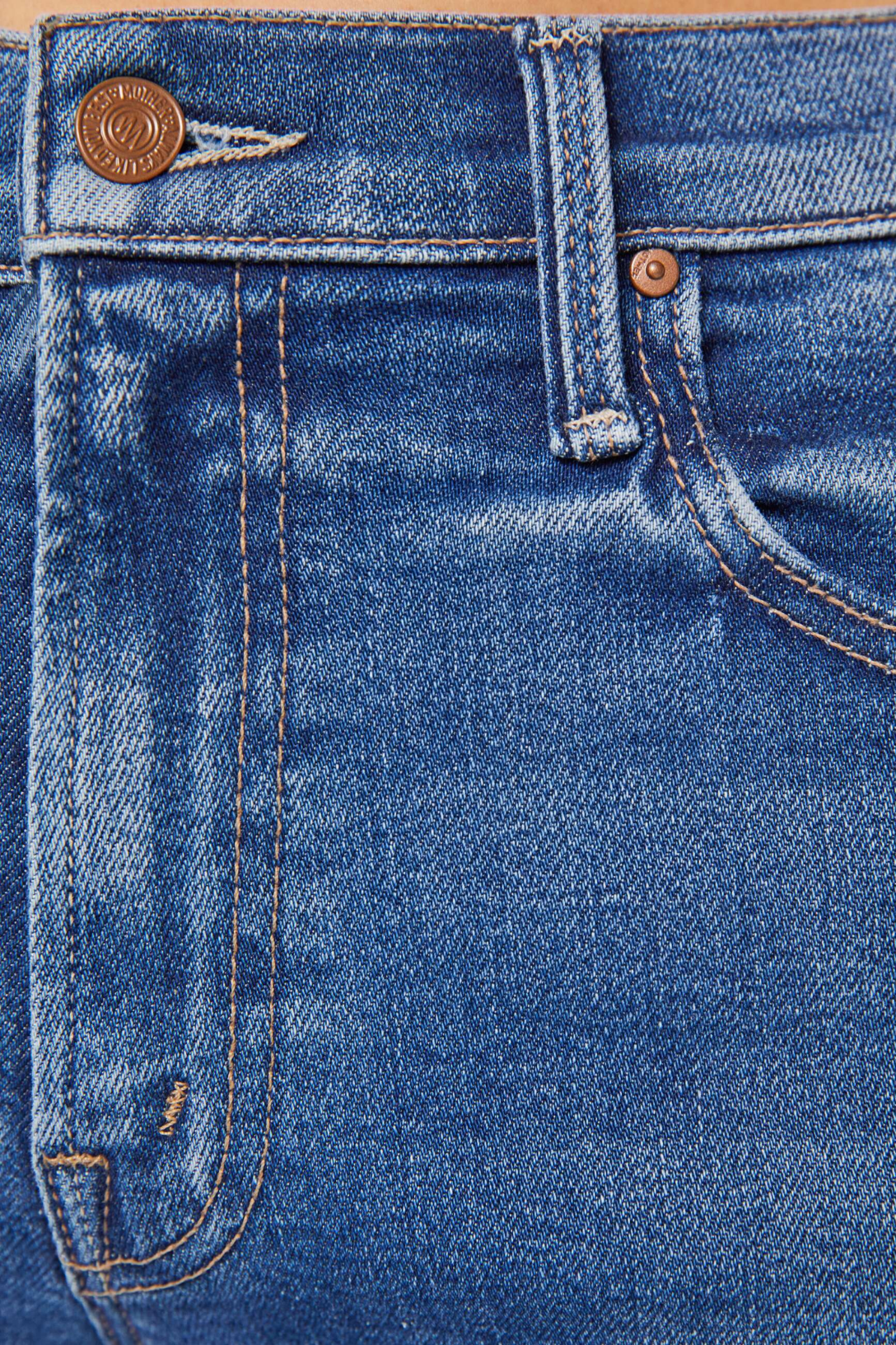 Bench warmers. Mid-rise jeans with a wide straight leg, zip fly and frayed ankle-length inseam. Made from stretch denim, Dugout Doobies is mid blue with whiskering and fading at the knee.