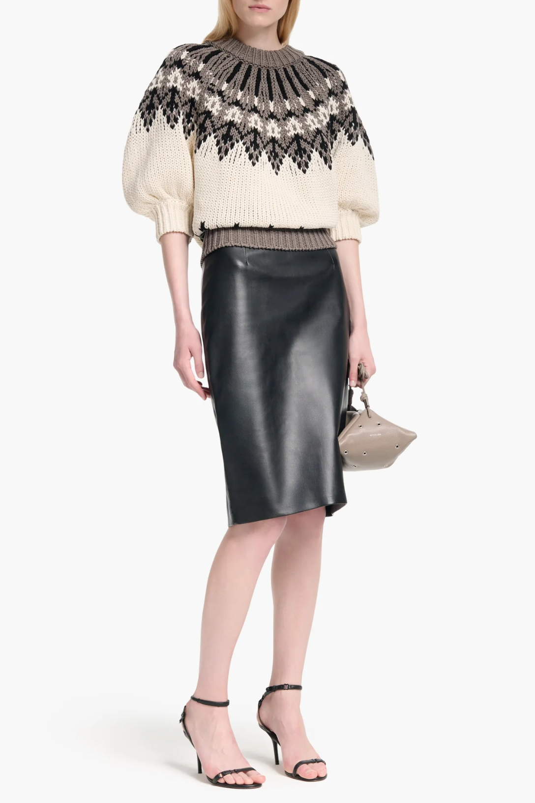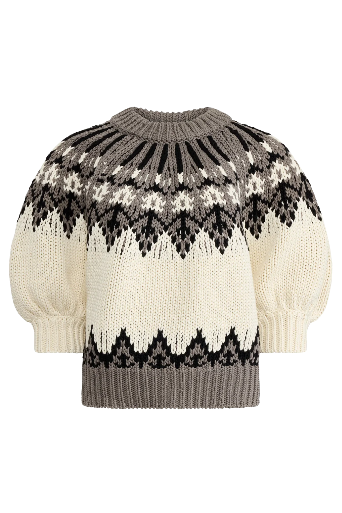 The Marty sweater is designed with a traditional Fair Isle pattern. Knitted from a soft Mako cotton, typically used for its exceptional fineness and silky feel, it's shaped for a looser fit with half balloon sleeves.