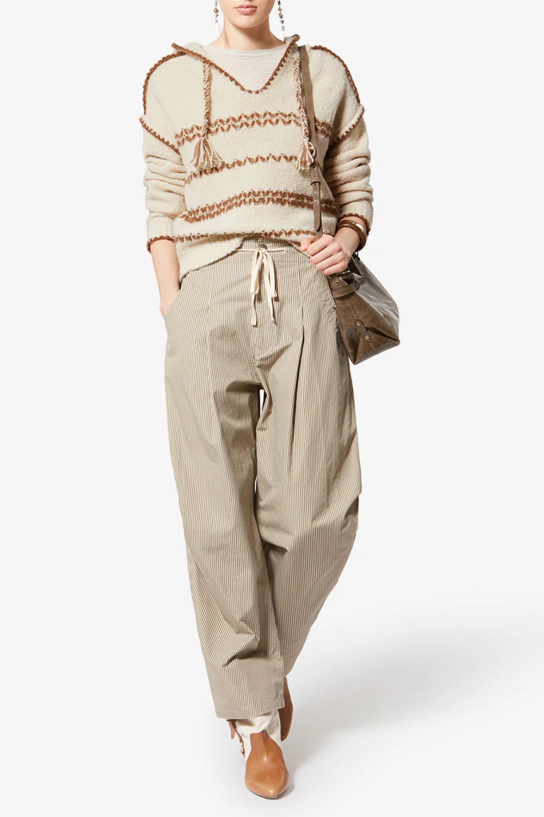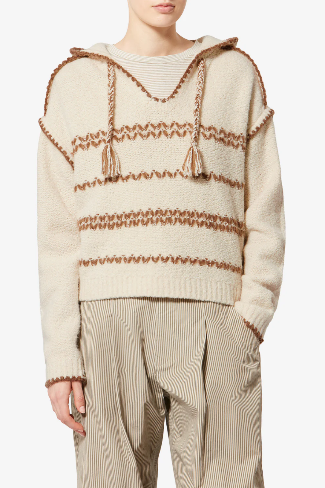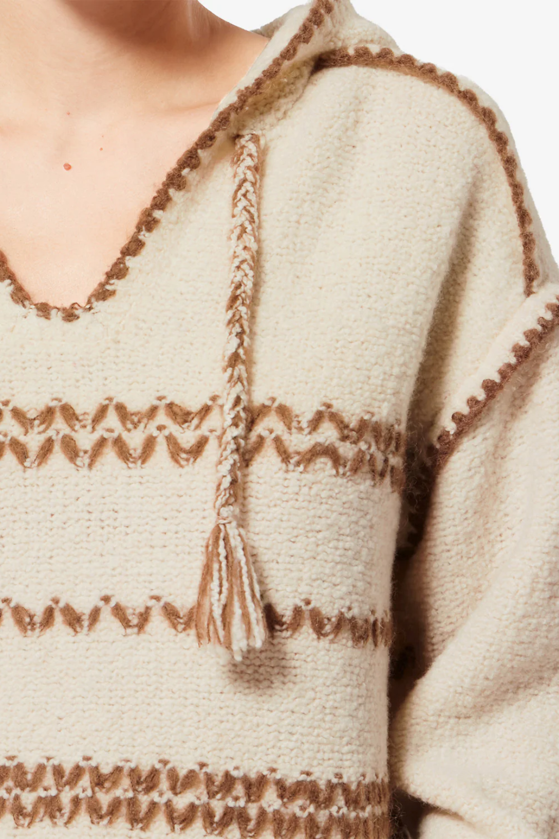 - Hood with drawstring and pompoms