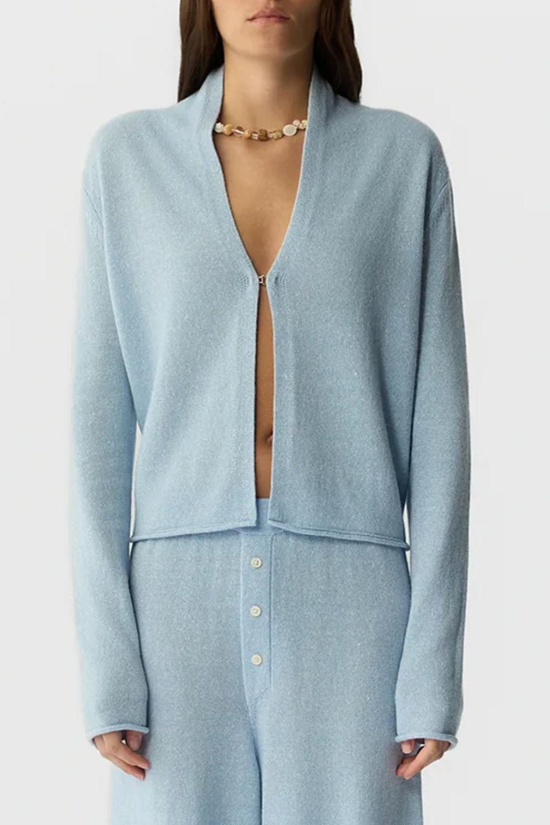 Guest in Residence's iconic Stealth Cardigan is reimagined in a light-weight cashmere–linen blend for warmer days. Designed with a shawl collar and discreet hook-and-eye closure, this women’s cardigan layers effortlessly or wears beautifully on its own, transitioning easily from daytime to evening.