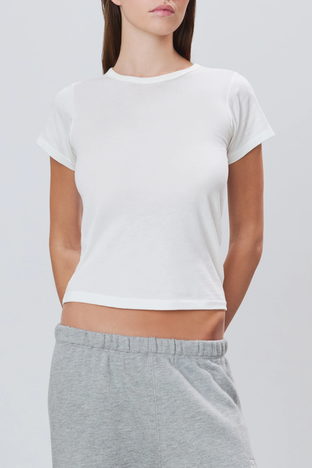ÉTERNE's Fitted Crewneck Short Sleeve T-shirt is crafted from their soft cotton modal blend, offering a slim fit and full length—a versatile essential for everyday wear.