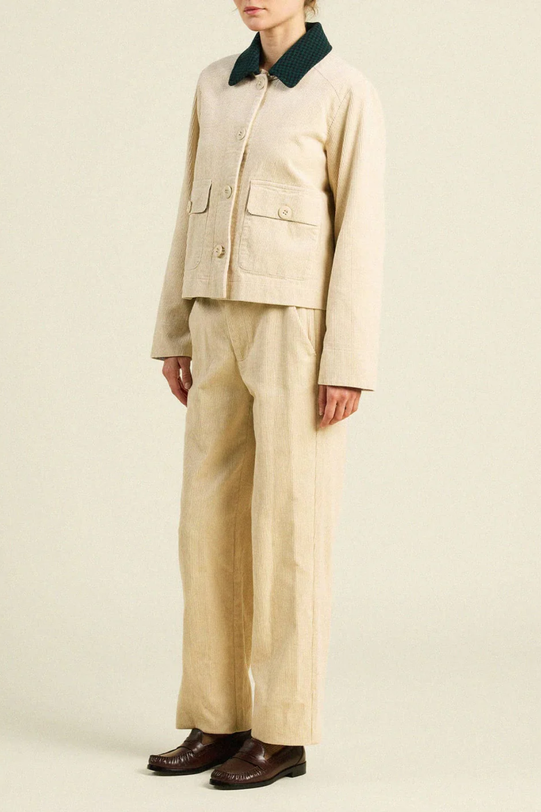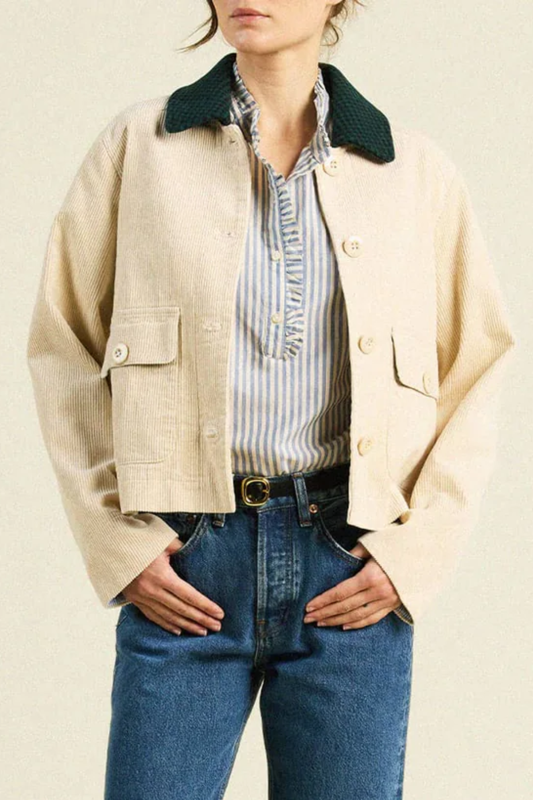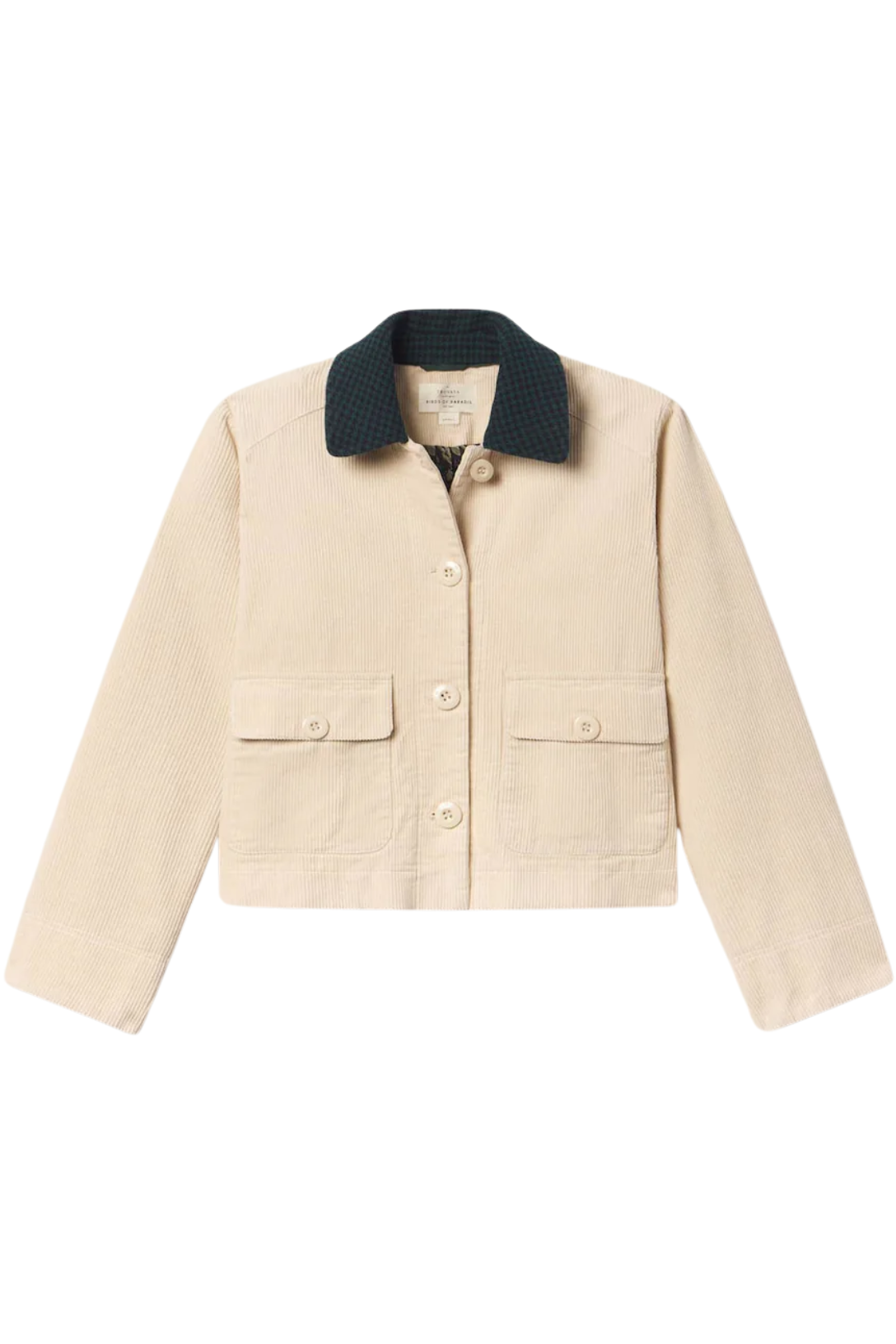 The Atlas Jacket is cropped chore jacket in soft cotton twill. Paired with petersham ribbon detail throughout, signature antique white buttons and large front patch pockets with buttoned closures. Shown here in Oat Corduroy and made from cotton.