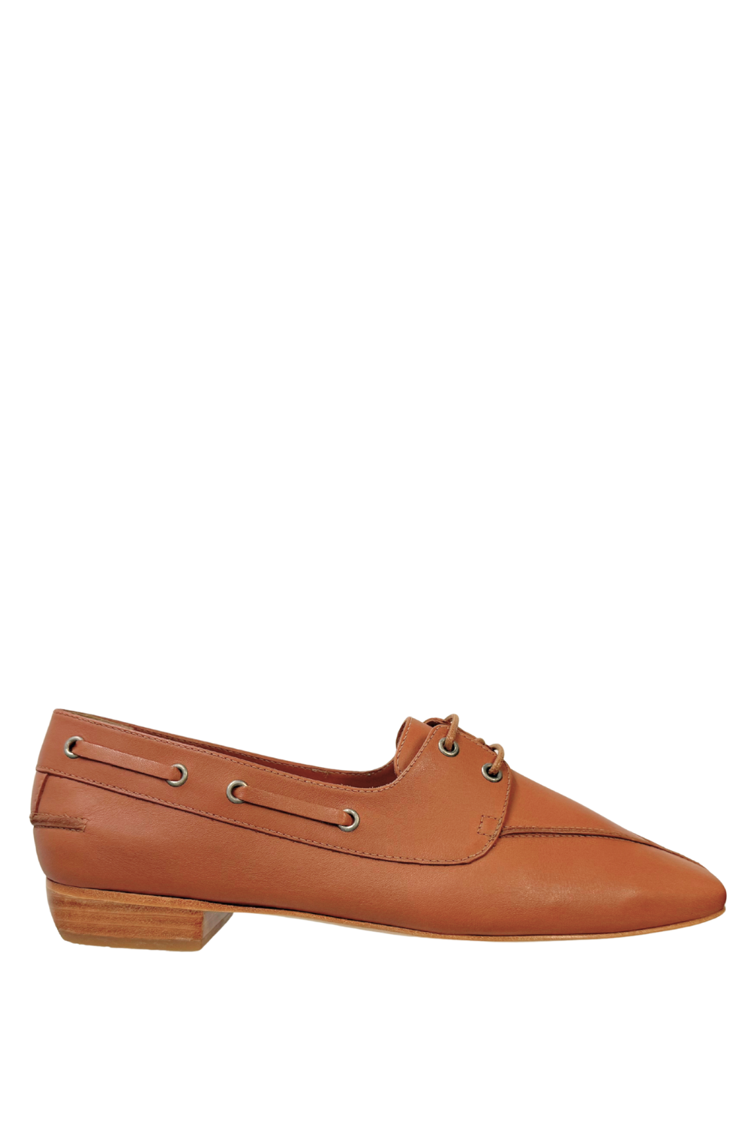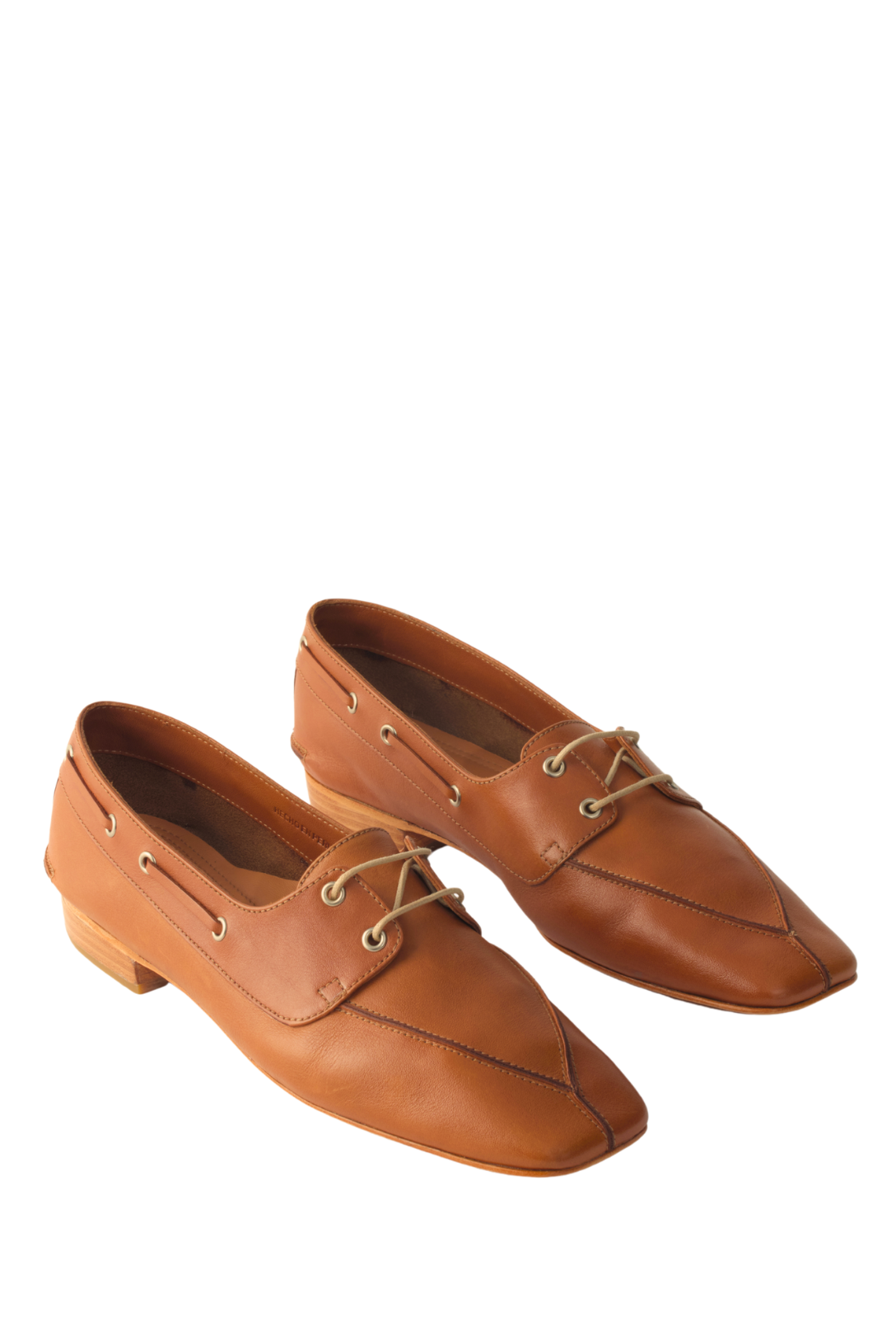 The Barata Moccasin has a soft square toe, low wood heel, and seam-detailed upper. Features tonal leather lacing on the collar and contrasting cord laces at the tongue.