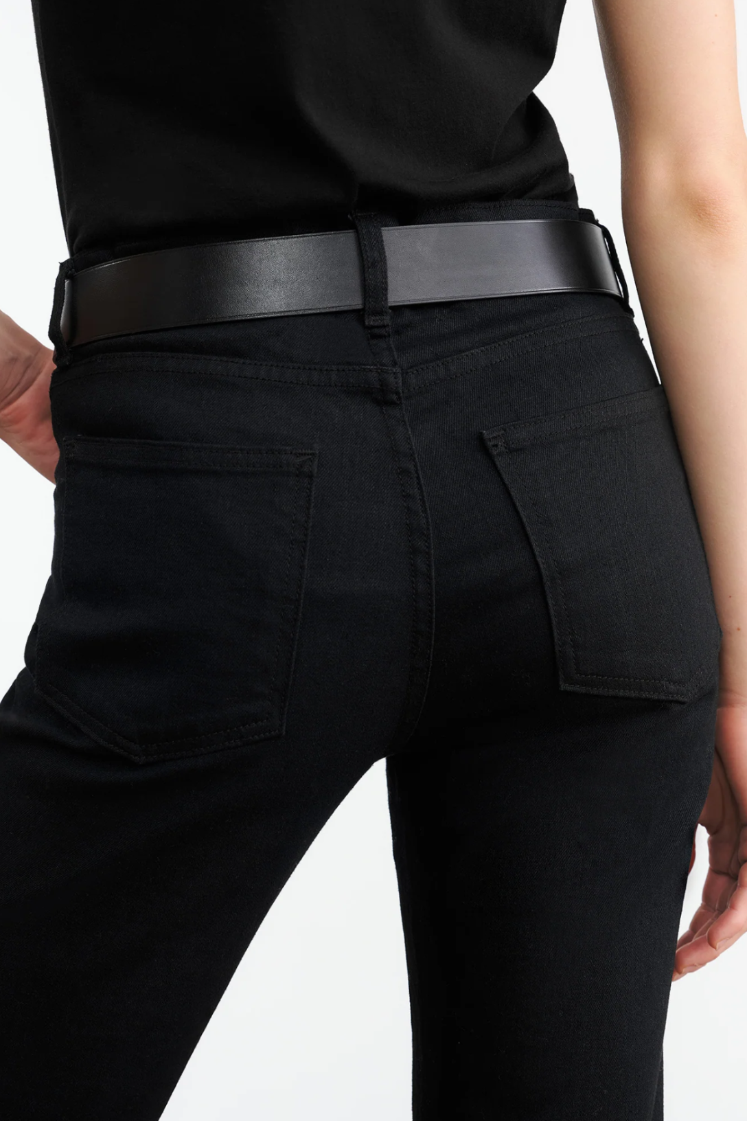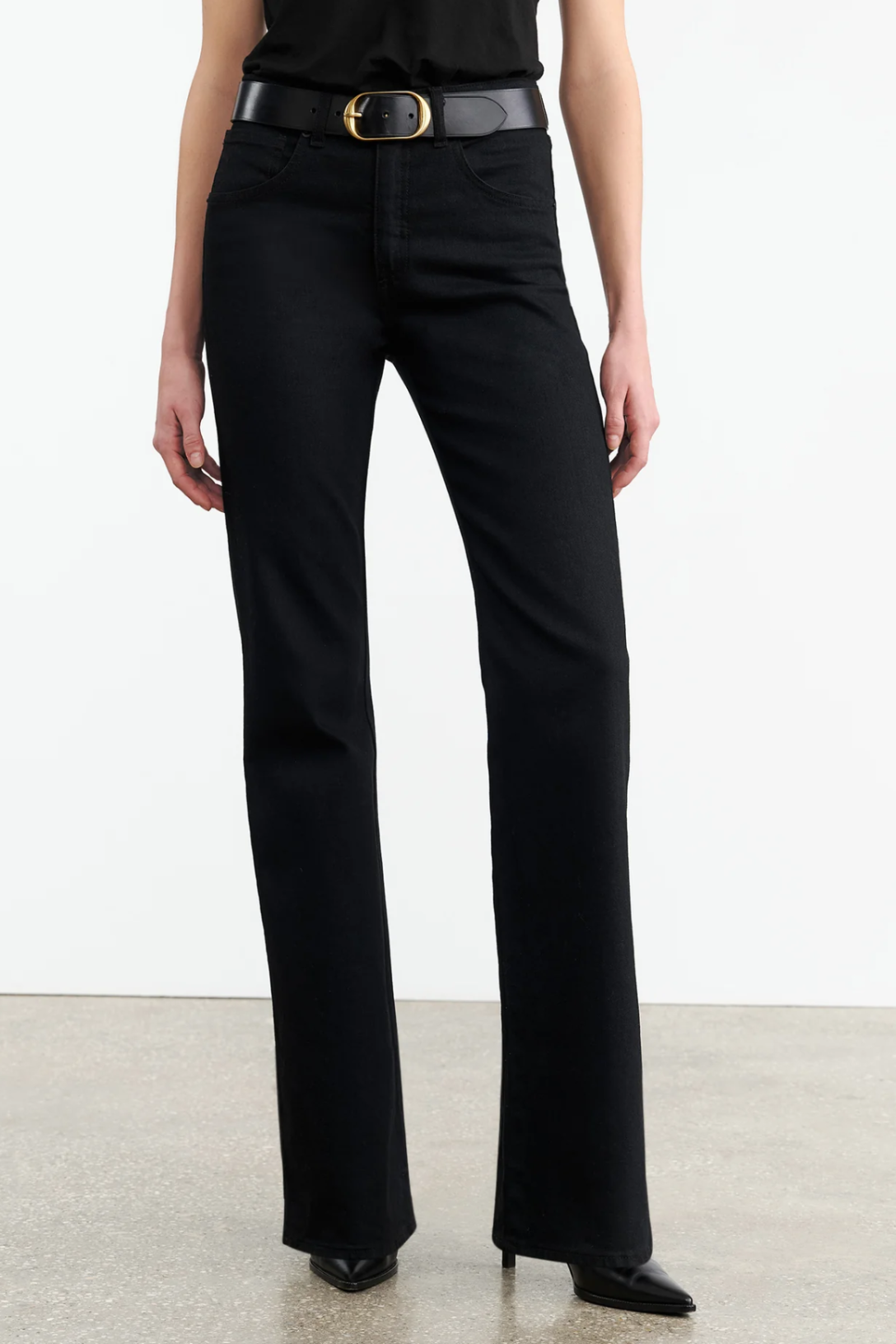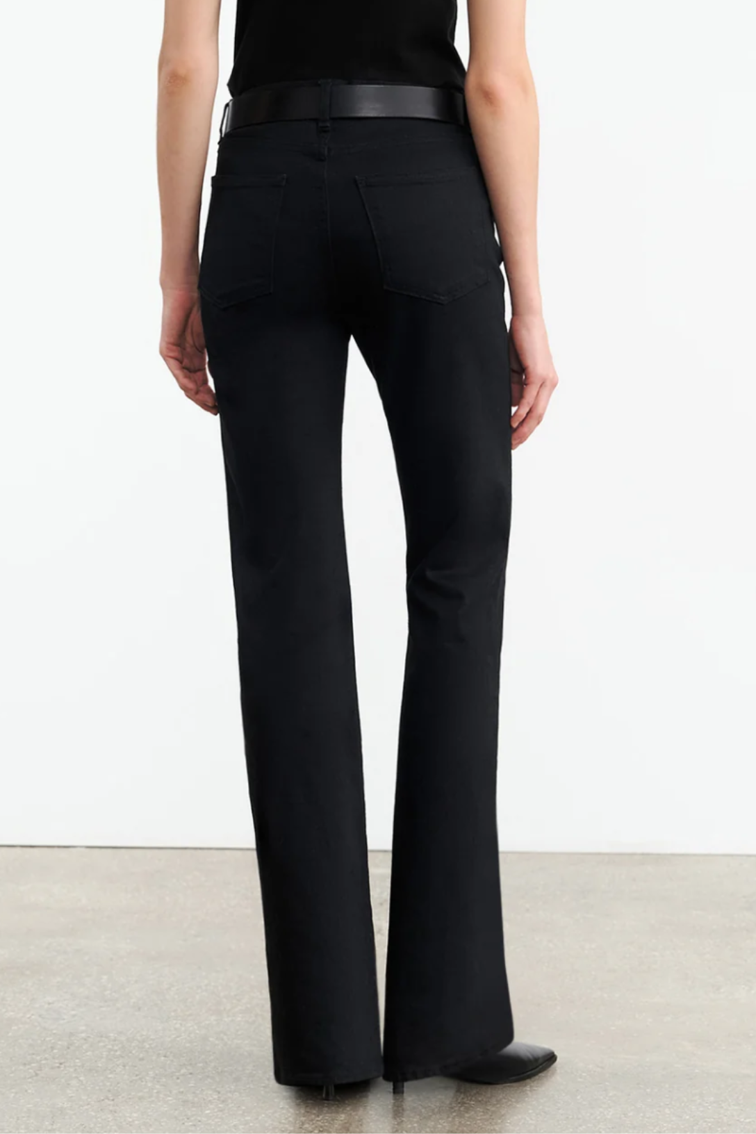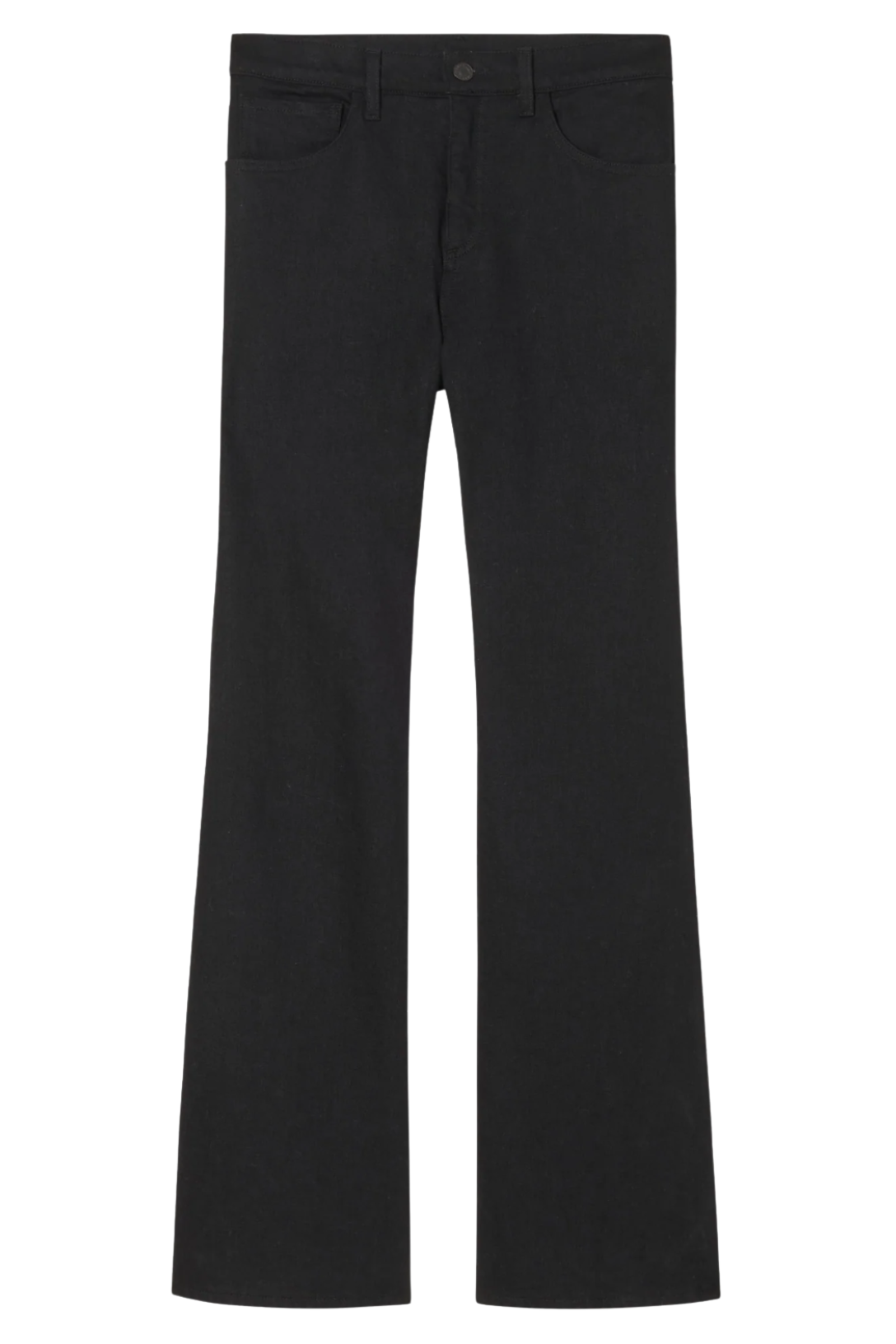 Mid-rise flare leg jean in Japanese stretch denim. Five pocket details. Zip fly. Shank closure. Belt loops.