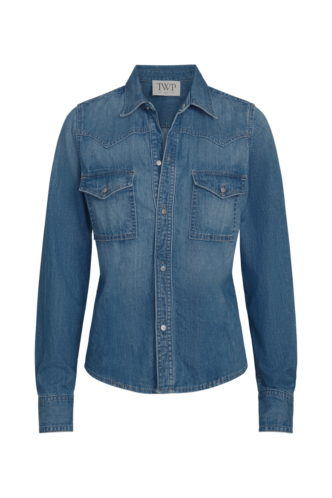 Western Shirt in authentic cotton denim, manufactured in LA. The Cowboy Take Me Away is a relaxed fit. Complete with utility details: a snap button placket, chest flap pockets, exposed yoke and custom applied rivet hardware.