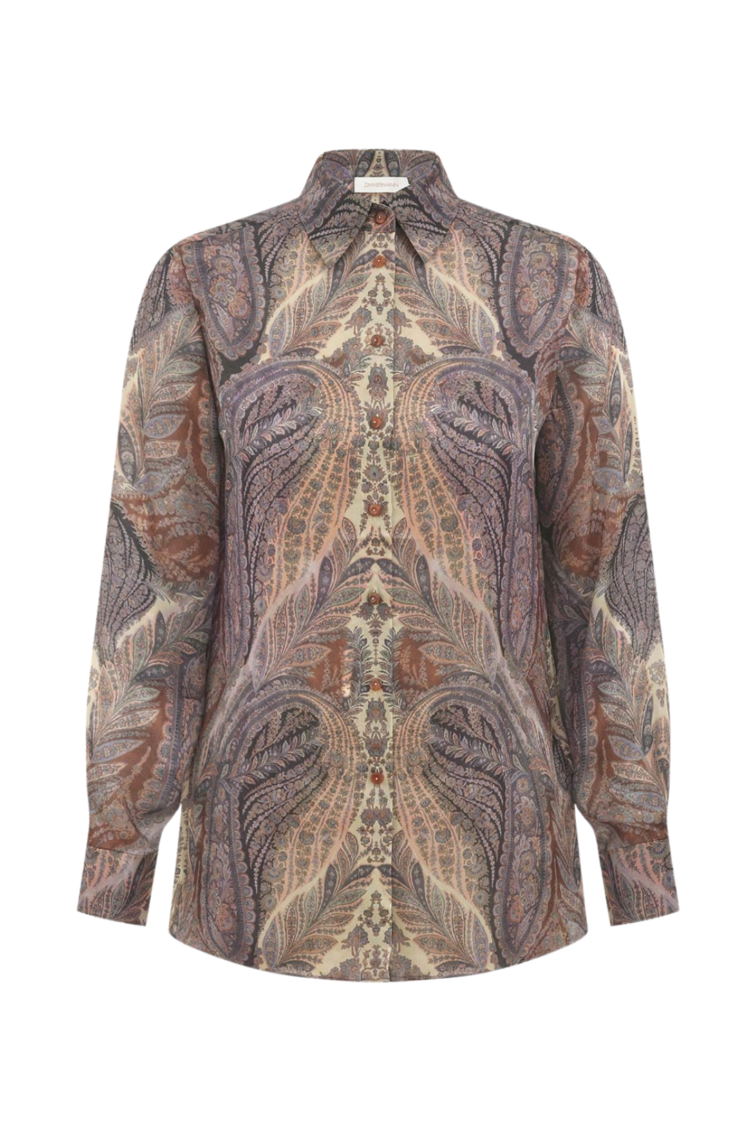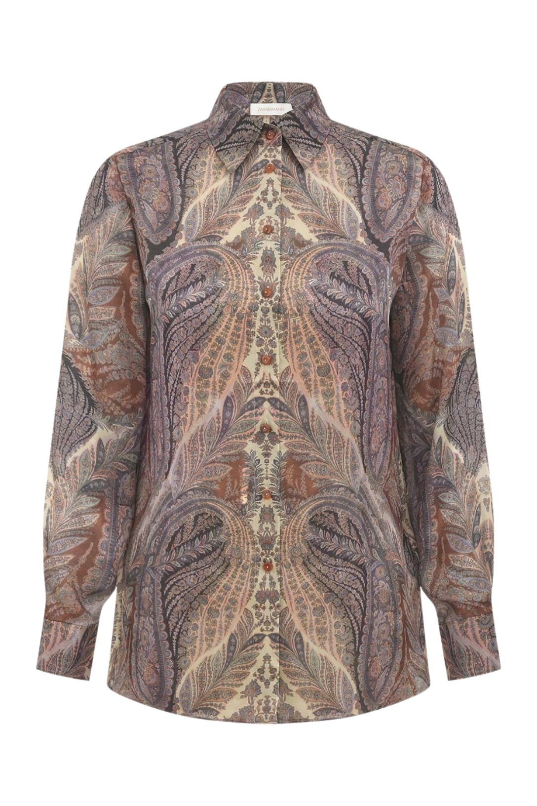 The Hypnotic Satin Shirt in Denim Paisley from Zimmermann's Fall 2025 Collection, Hypnotic. A silk shirt featuring long sleeves, embroidery detailing and a classic collar.