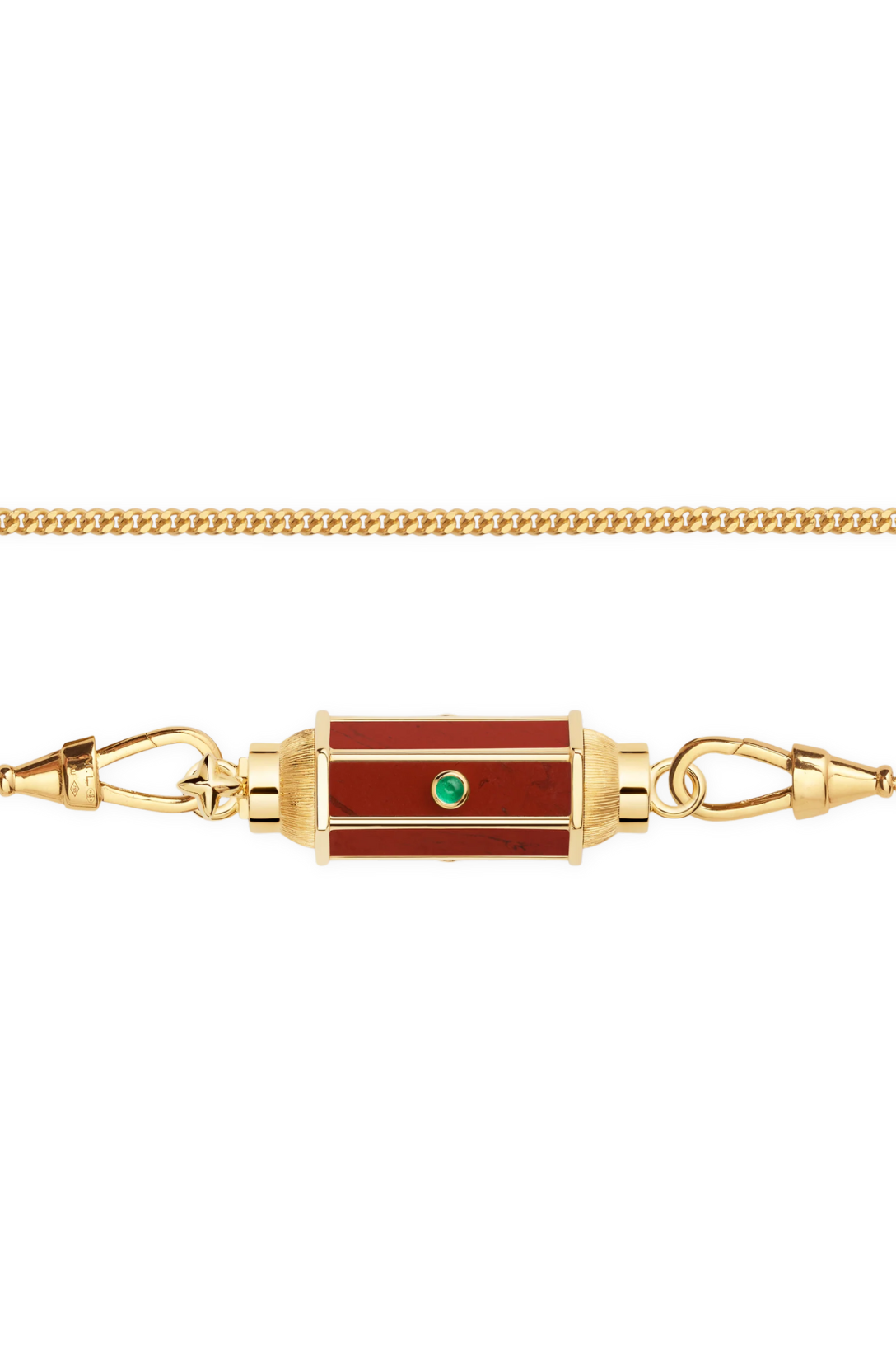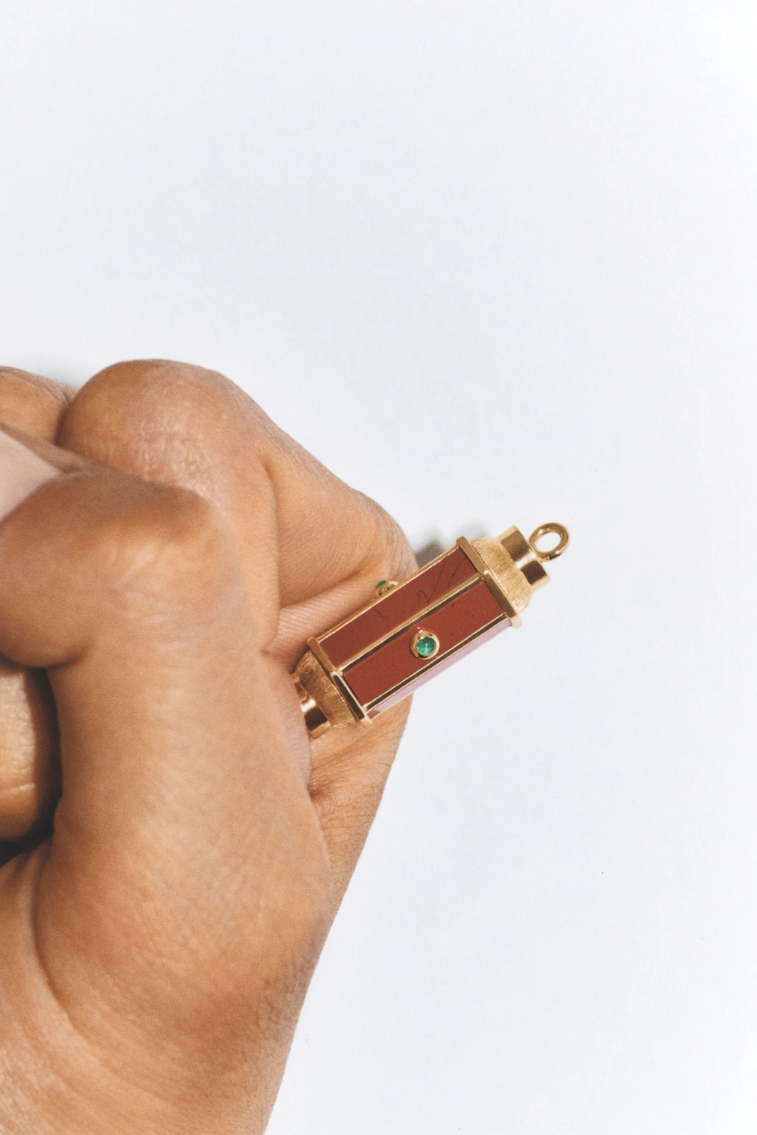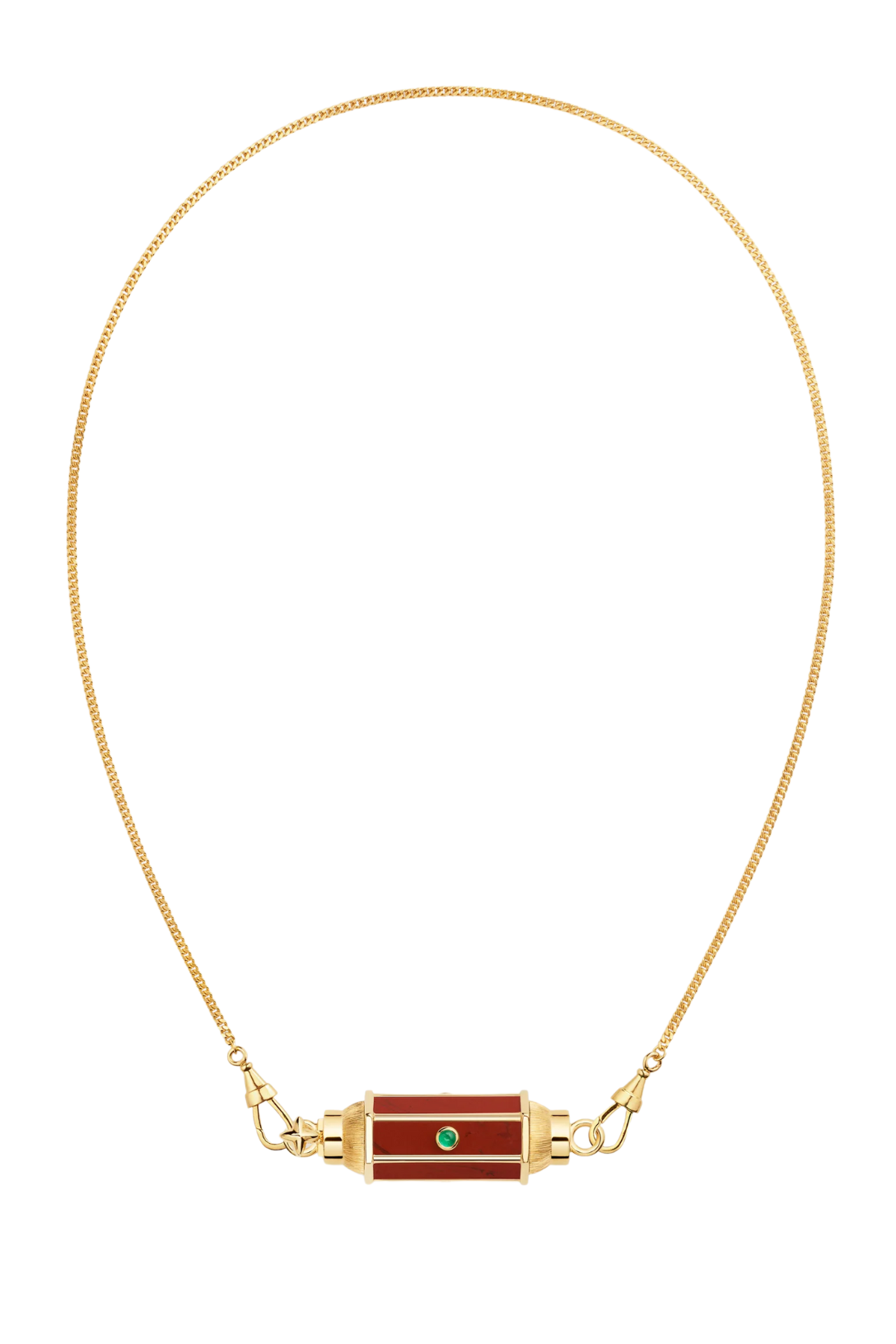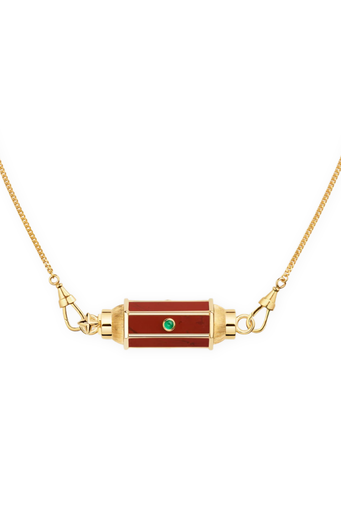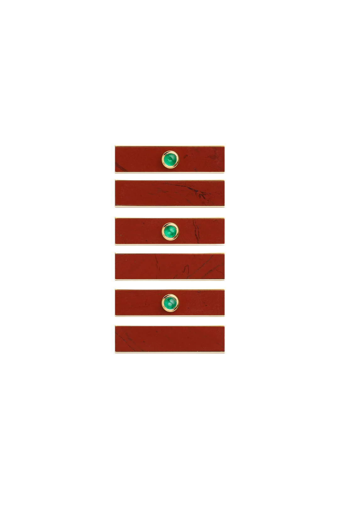 Thin hand-brushed gold pendant barrel, set with jasper and three emeralds.