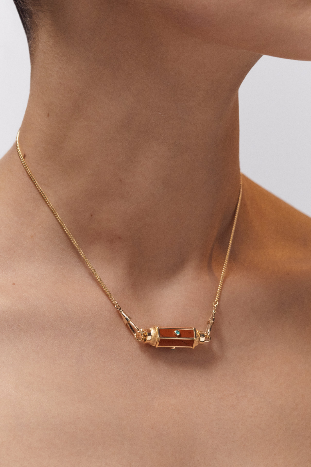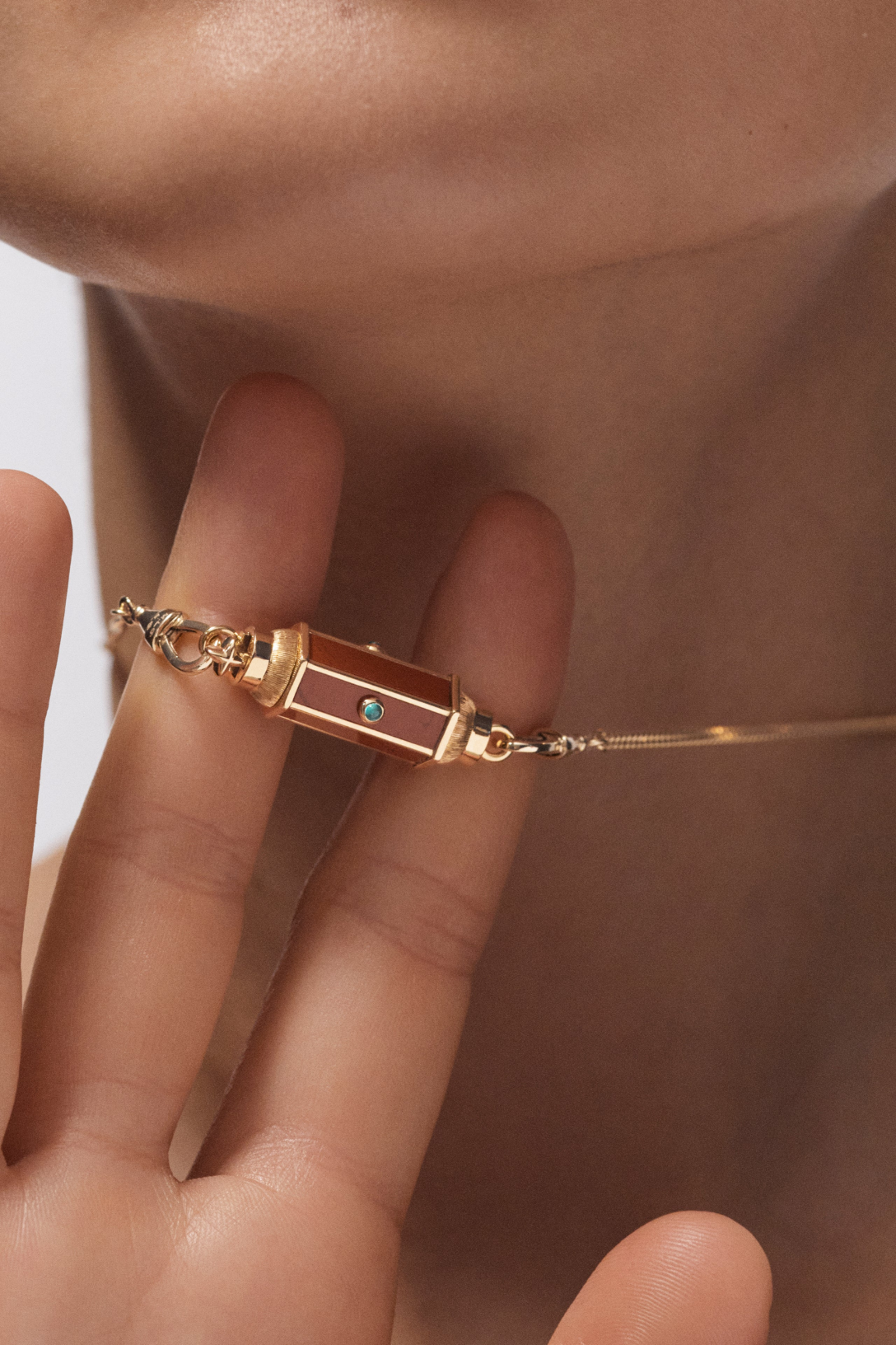 The emeralds are cabochon cut and the 6 sides of jasper are cut and set to perfectly fit the shape of the baby locket.