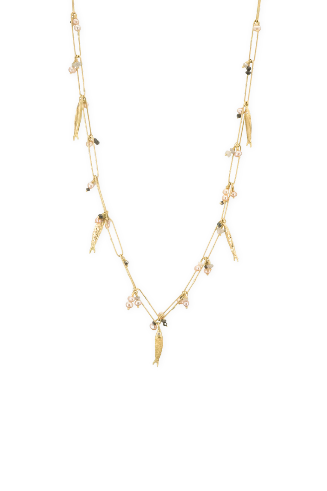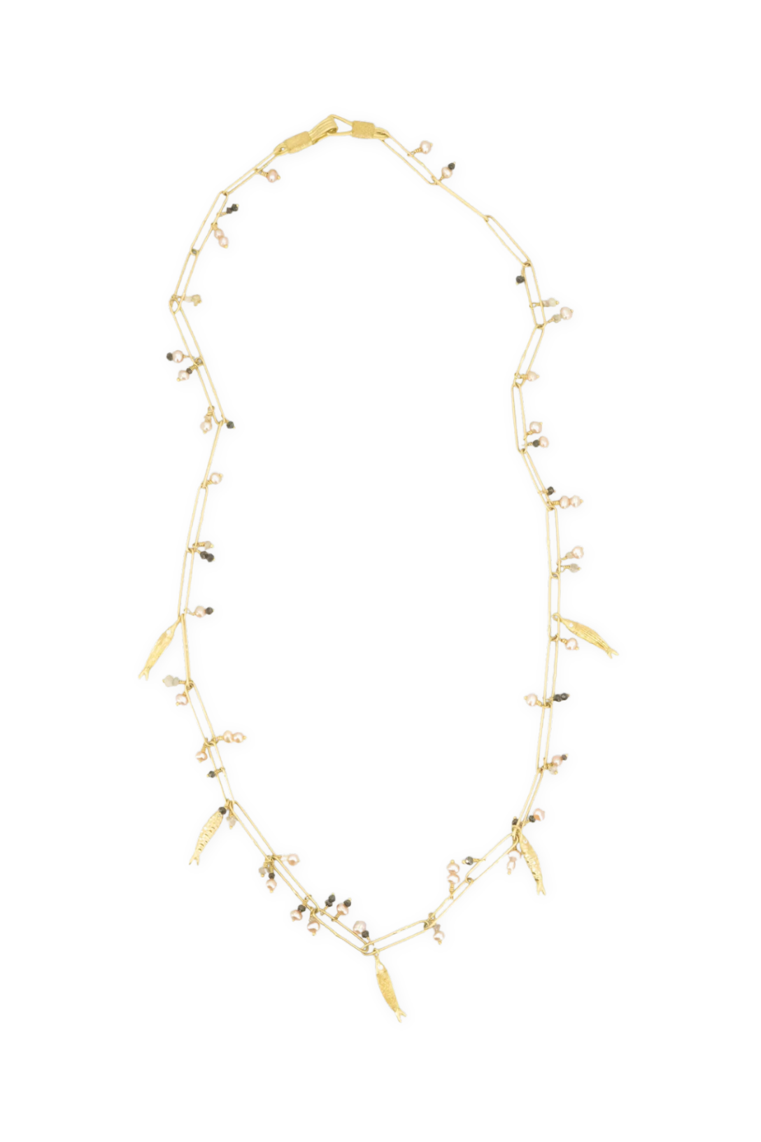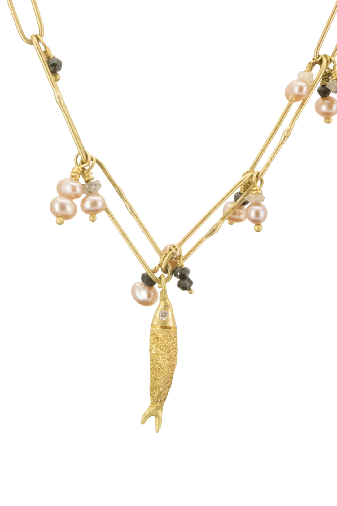 The most lux of all of the adorned, one of a kind, handmade paperclip chains in Erin's collection. Featuring black diamond and blush colored pearl beads, little hand engraved fish pendants with diamond eyes and finished with a signature hook clasp. One of a kind.