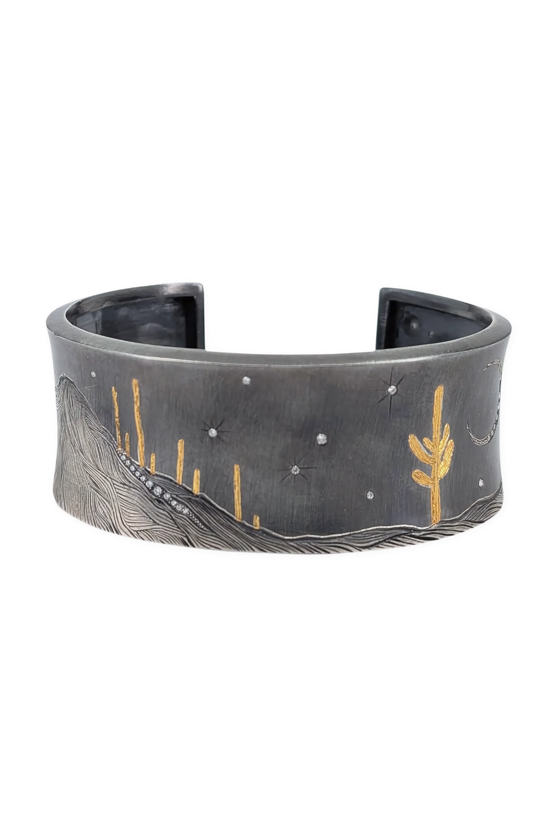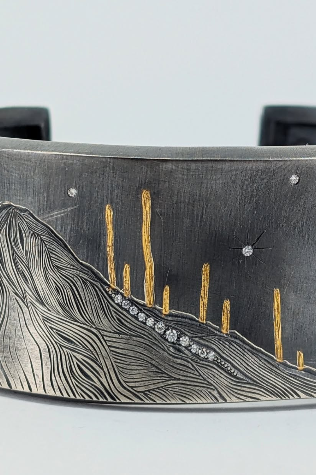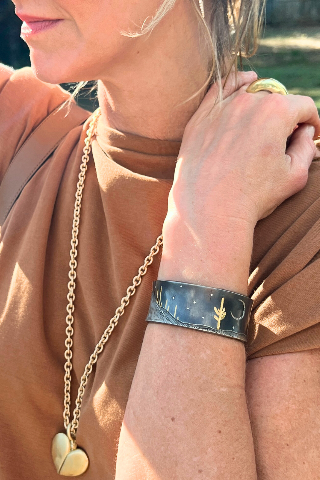The Petite Moonrise Cuff by Erin Cuff. This motif originated from the second piece of jewelry Erin ever made in metalsmithing school in Mexico back in 2015 and has been a steady through line in her work, morphing and changing with her progression as a goldsmith over the years. All fabrication, engraving, inlay and stone setting is done by her small team.