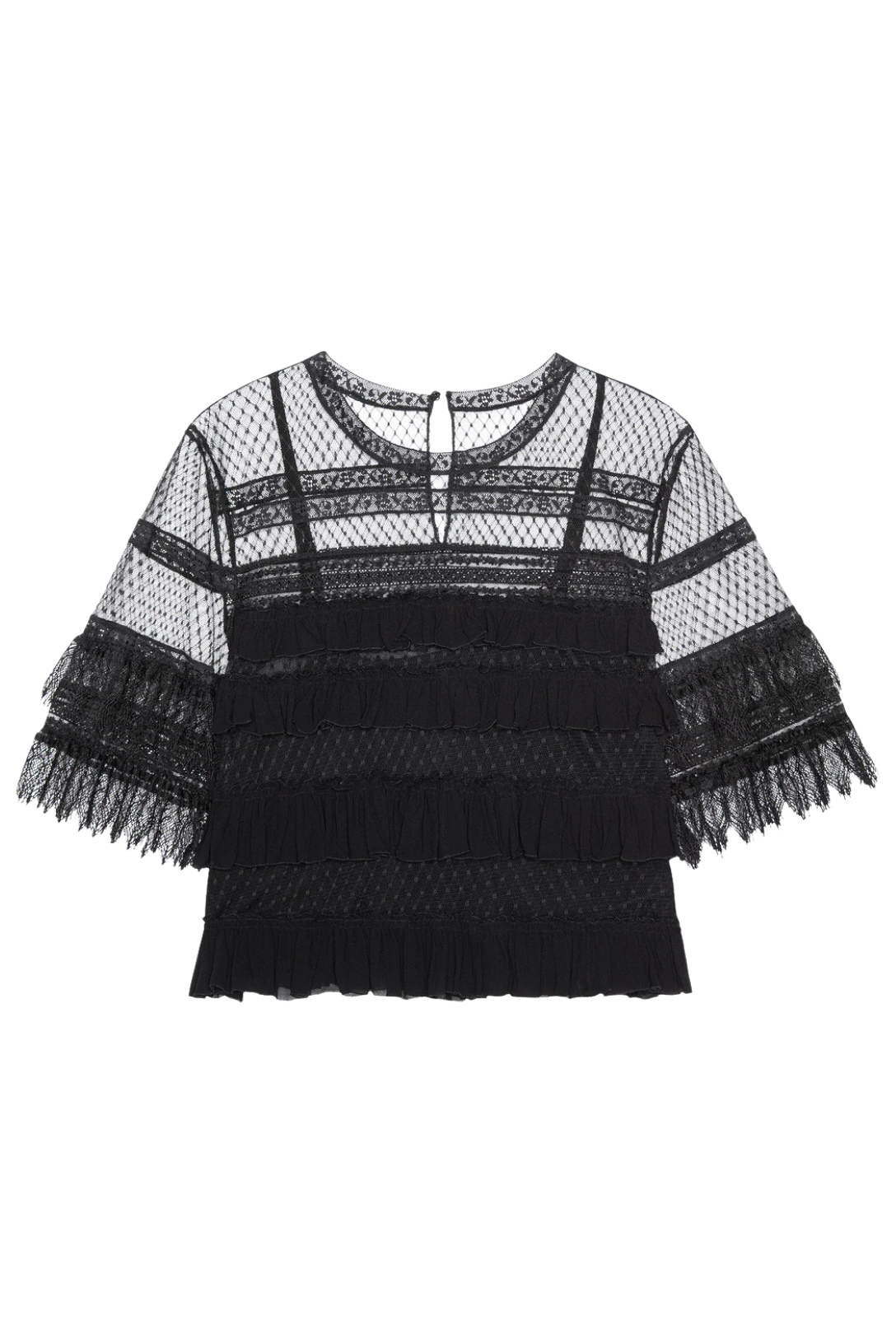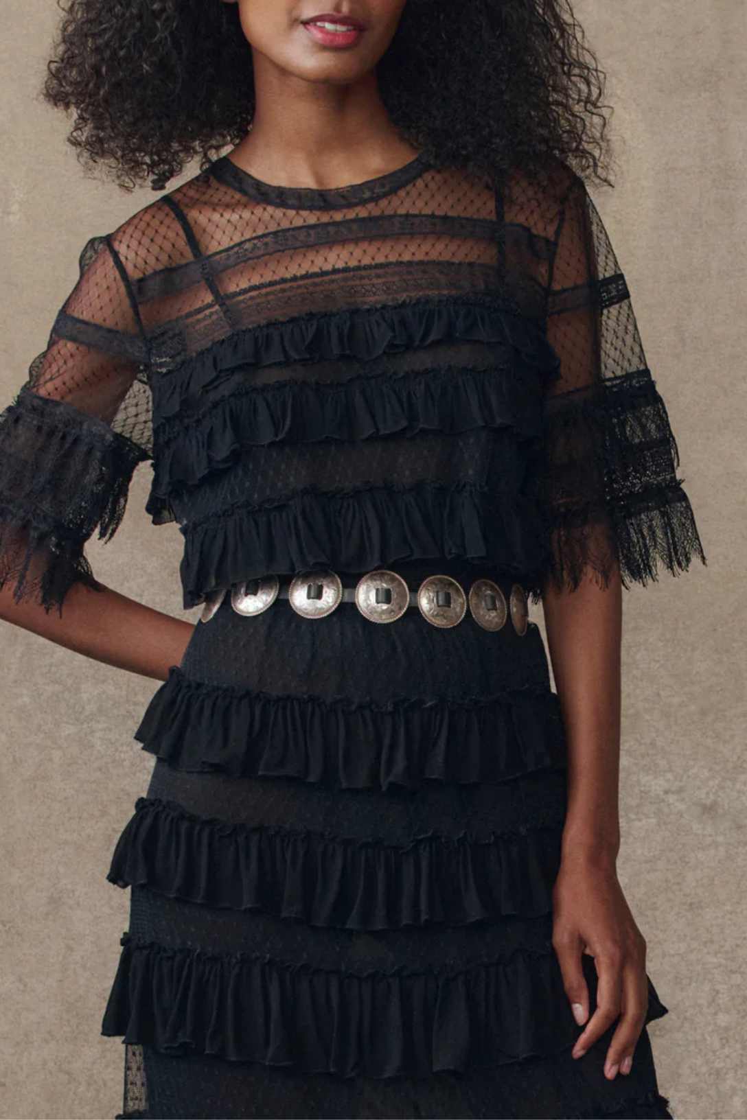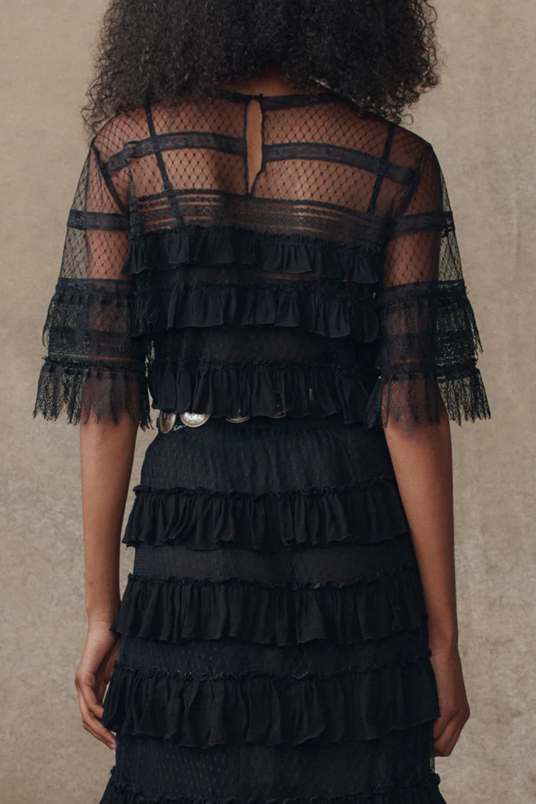 Whimsical and light, these top layers dotted mesh, bobbin lace, and tiers of soft georgette ruffles for a vintage-inspired feel. With delicate edges and a loose, boxy shape, it moves beautifully with every step. Sheer and airy, it’s finished with a button closure at the back and comes with a separate camisole.
