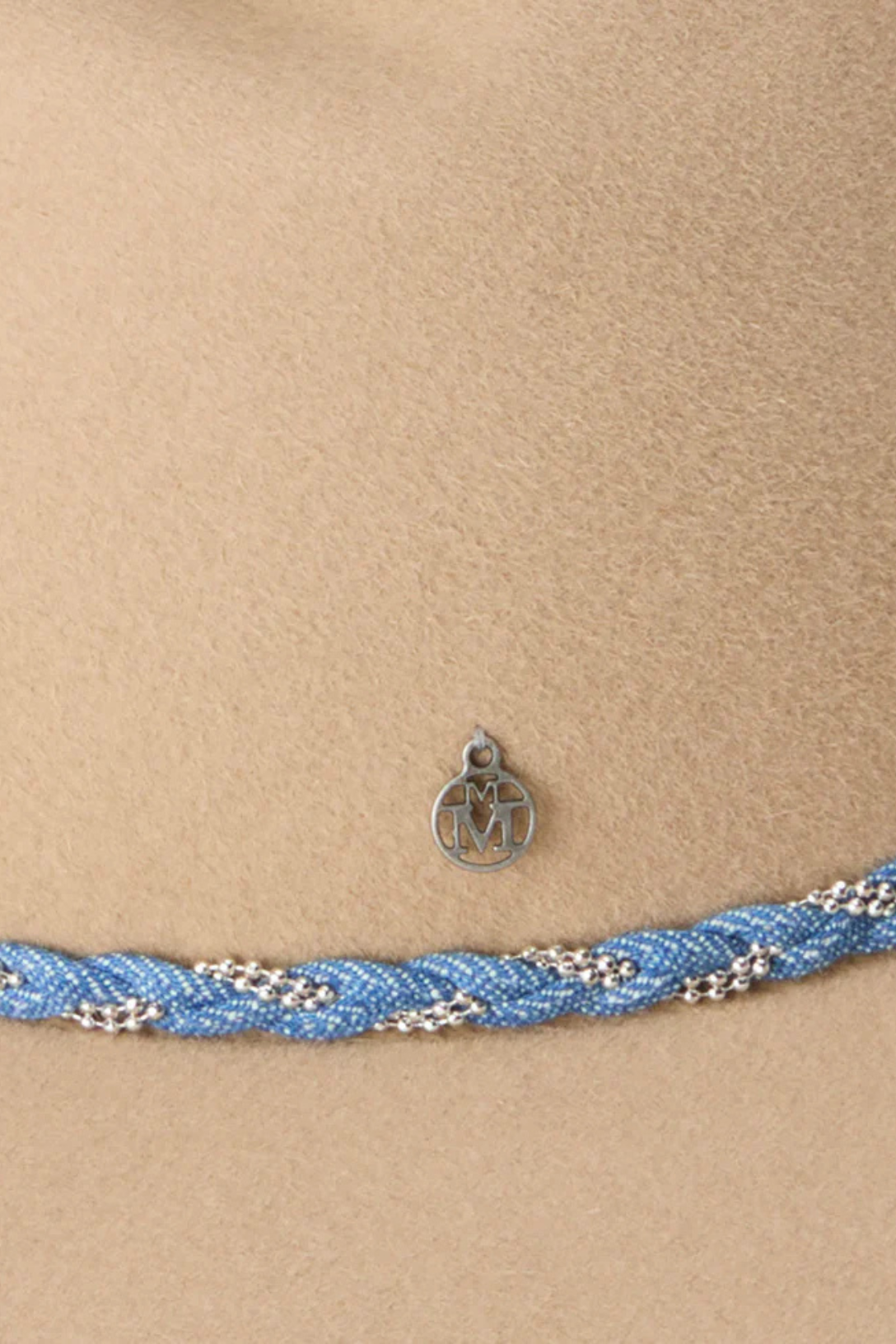 Discover luxury with the beige onyx felt fedora hat, featuring a unique braided denim and felt ribbon. Elevate your style with this sophisticated and timeless accessory.