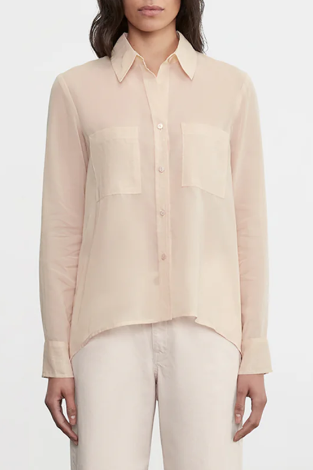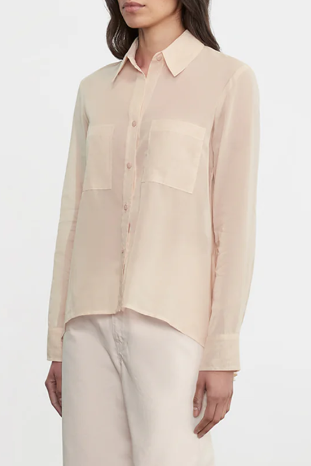 Semi-sheer shirt in a lightweight cotton organza with utility pockets and curved hem. Single box pleat for ease of movement.