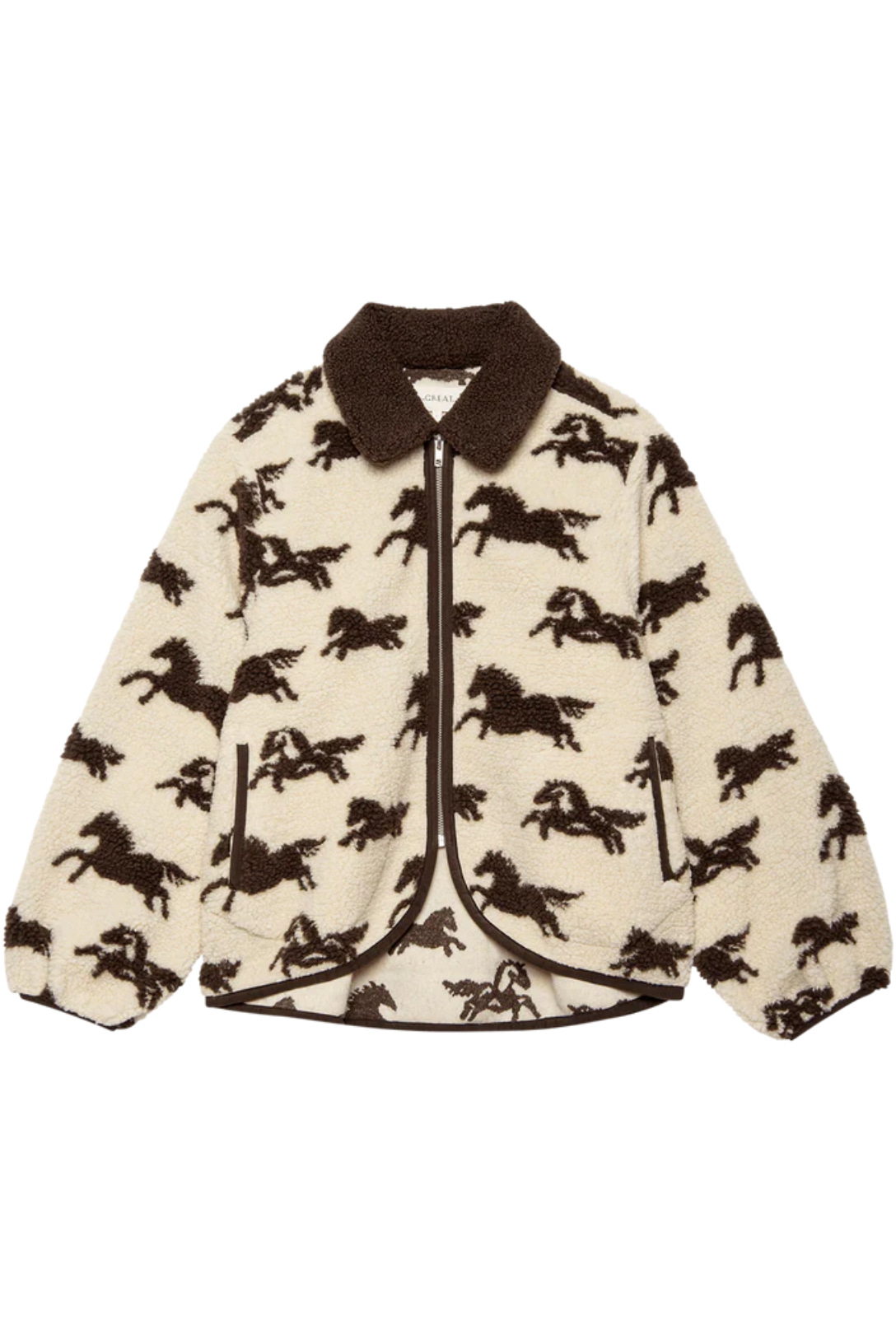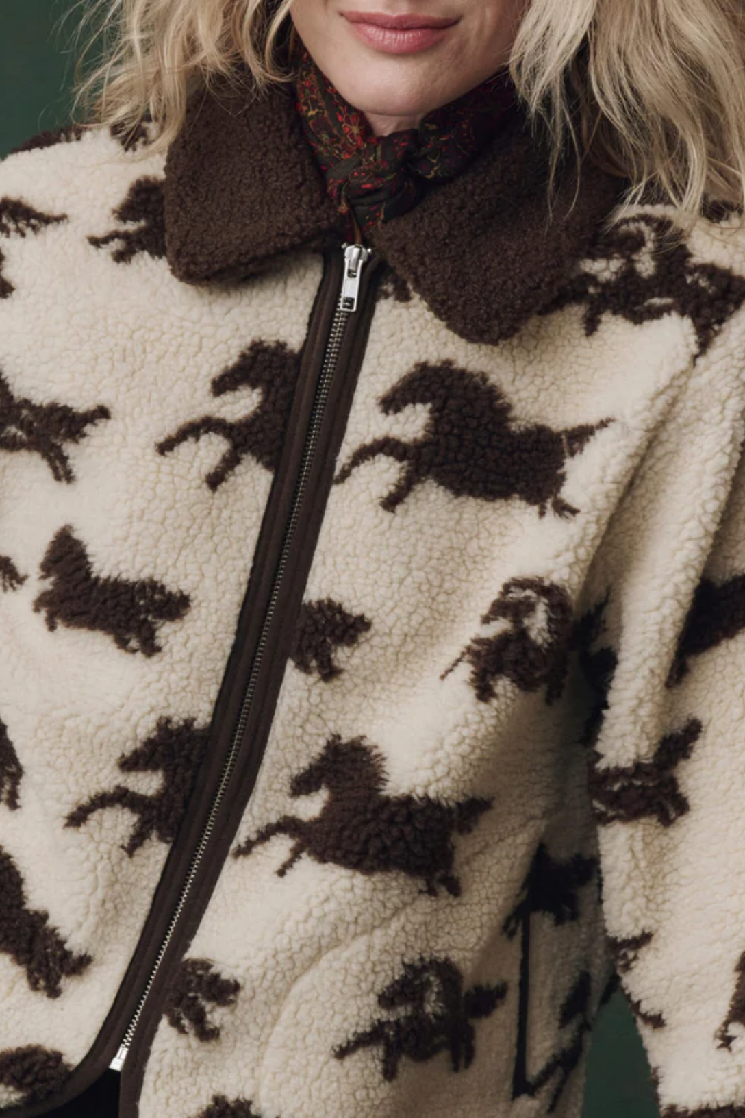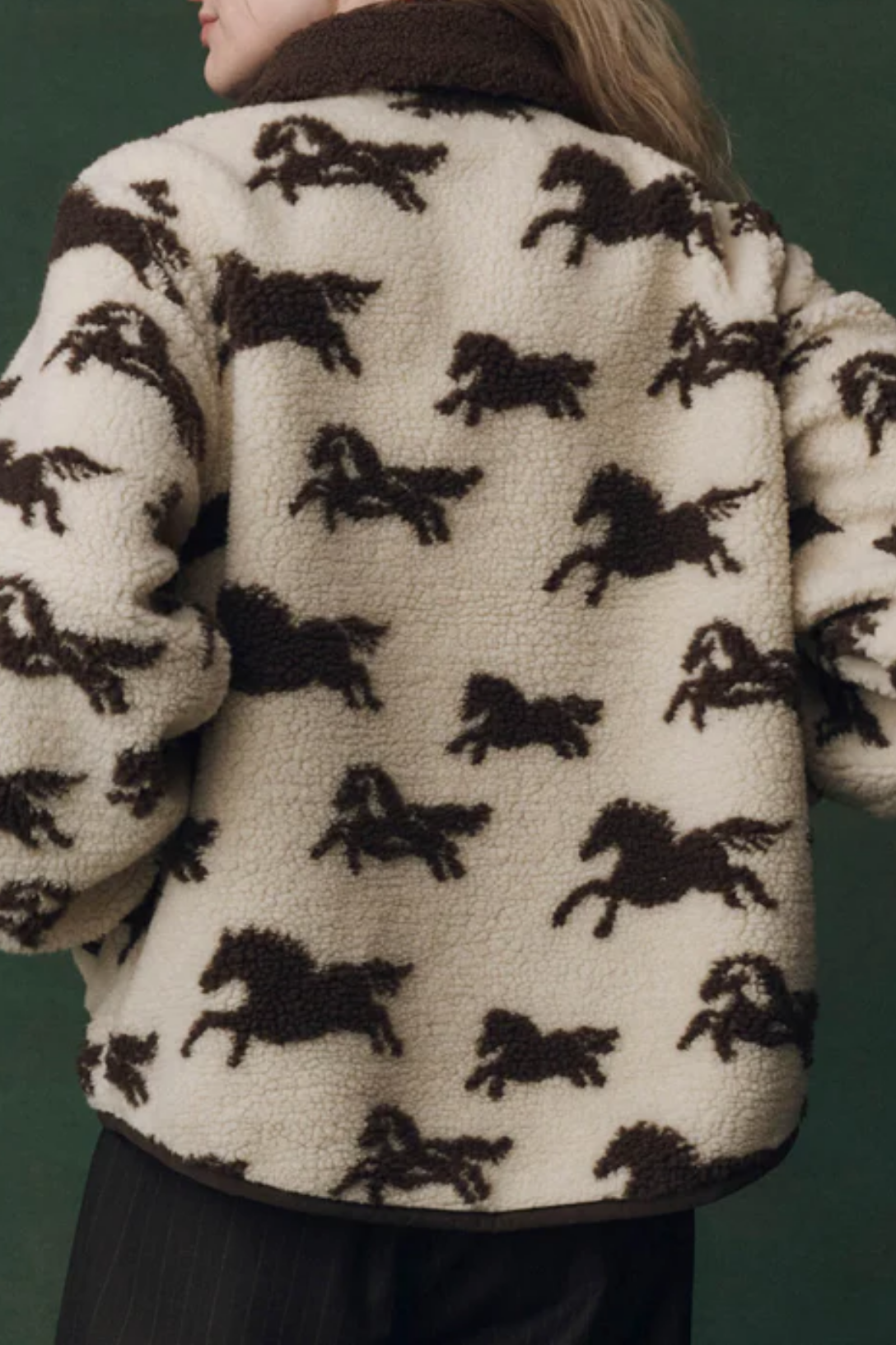 The Pasture Jacket is ready for outdoor adventures. The relaxed zip-up jacket is crafted from a plush fabric and tells the story of wild horses running across a meadow. Distinguishing characteristics include a charming shirttail hemline, contrast stretch binding around the edges, a fluffy plush collar, billowy sleeves, and welt pockets in an earthy brown that pairs with everything in your closet.