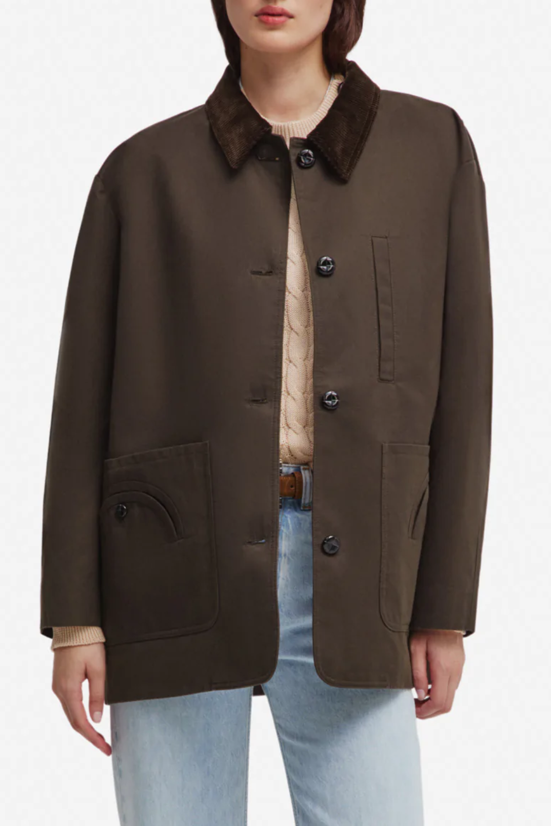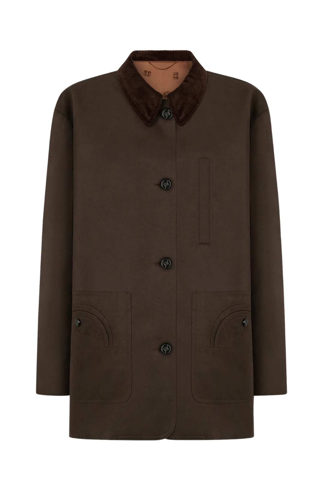 A slim-fitting mid-length jacket in cotton with a chocolate-brown corduroy collar, it’s enhanced by classic BLAZÉ Milano details: two large Smiley pockets, a small breast pocket and dark brown buttons.