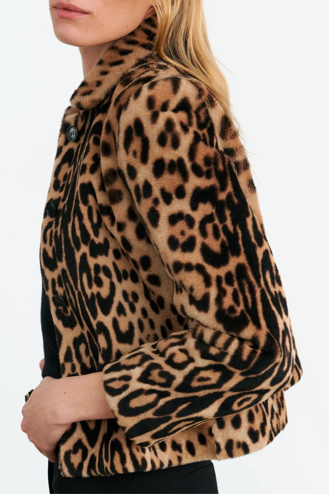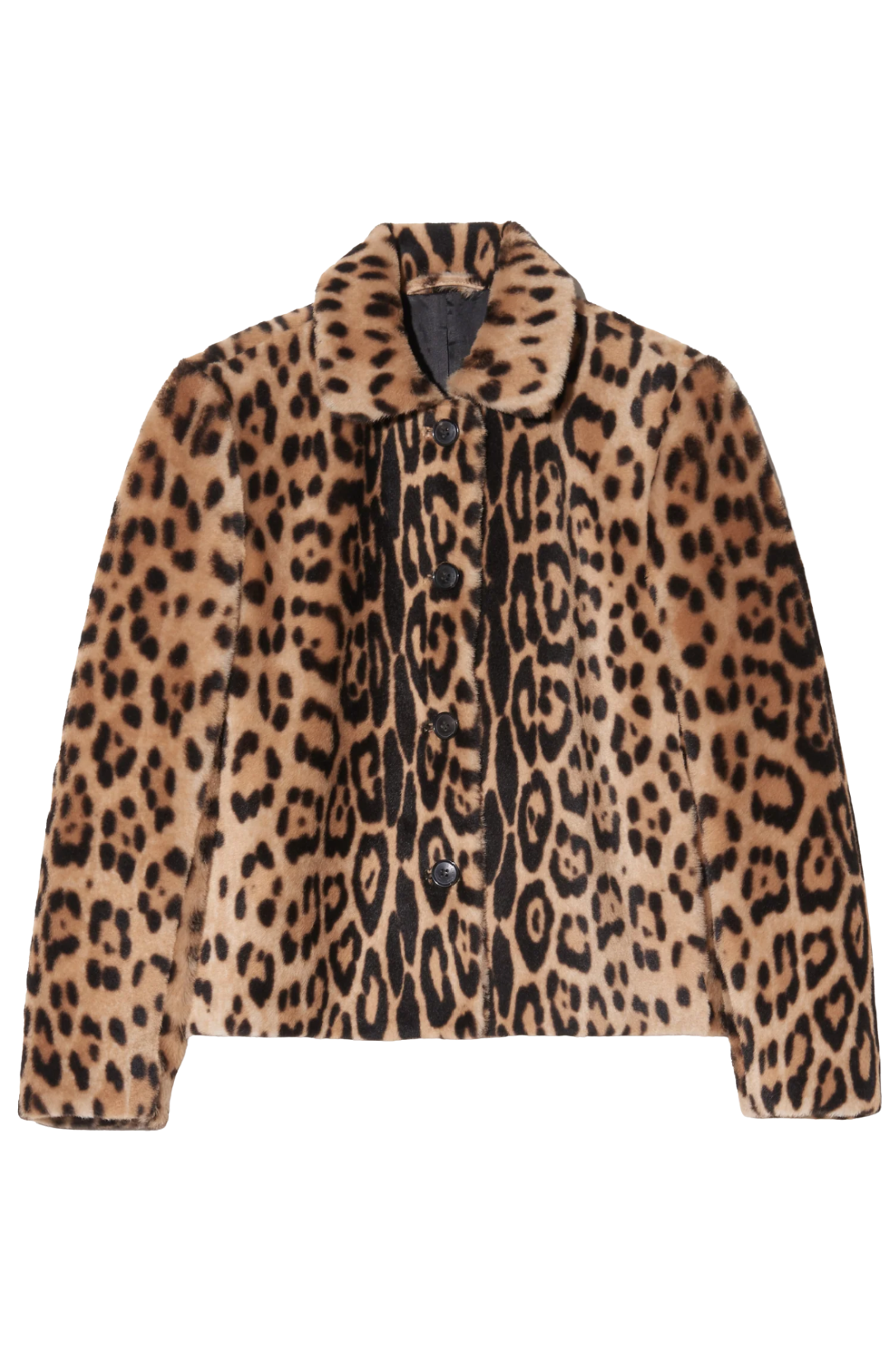 Shrunken fit shearling jacket in custom-printed merino shearling. Curved collar. Bracelet-length sleeves. Side seam pockets. Horn button closure. Shaved skin with straight hair finish. Center back seam. Fully lined. Interior chest pocket.