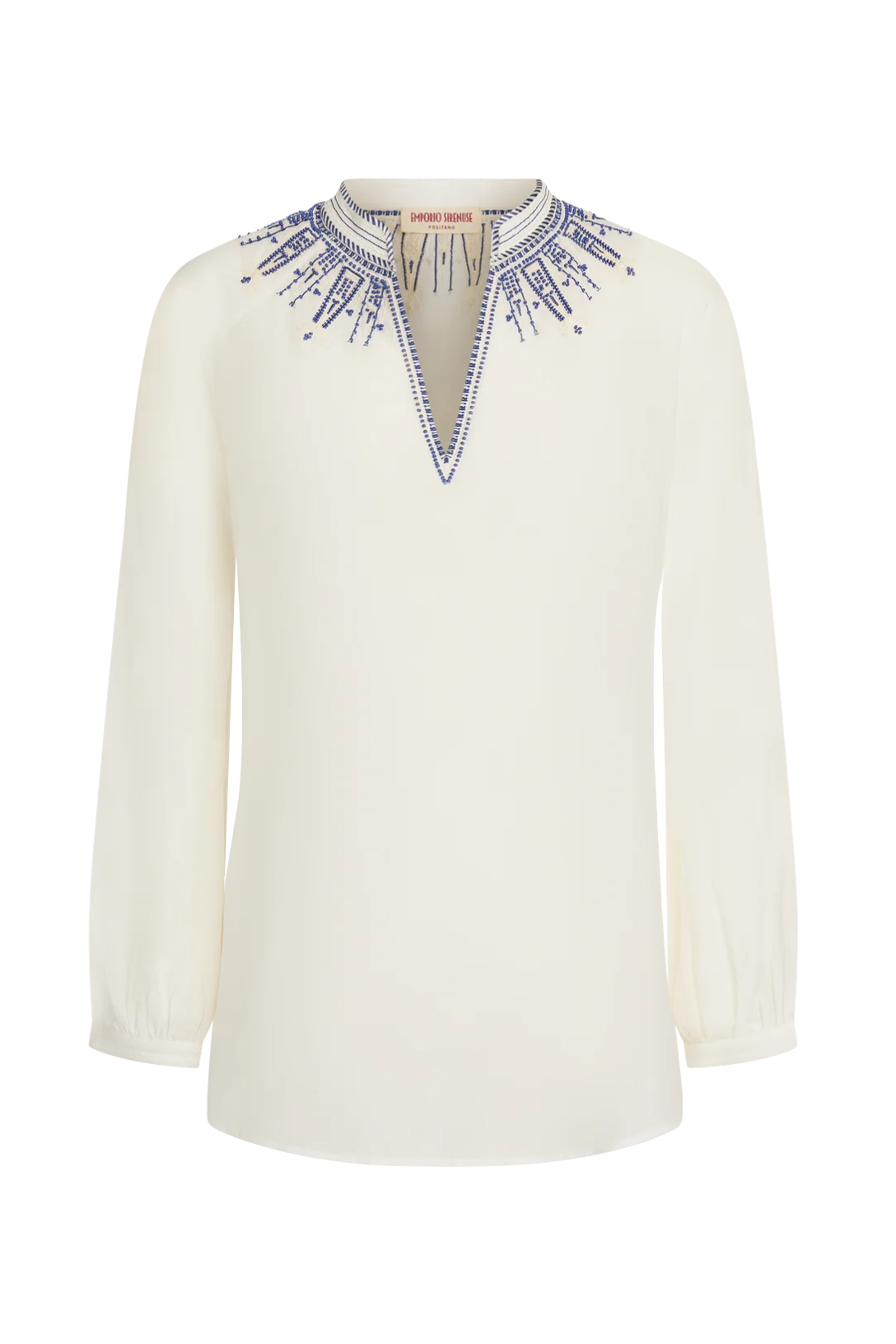Cut from a soft cotton-silk blend, the Ilizia Blouse features hand-finished embroidery and beading along the neckline and collar—a subtle nod to the Iris motif.