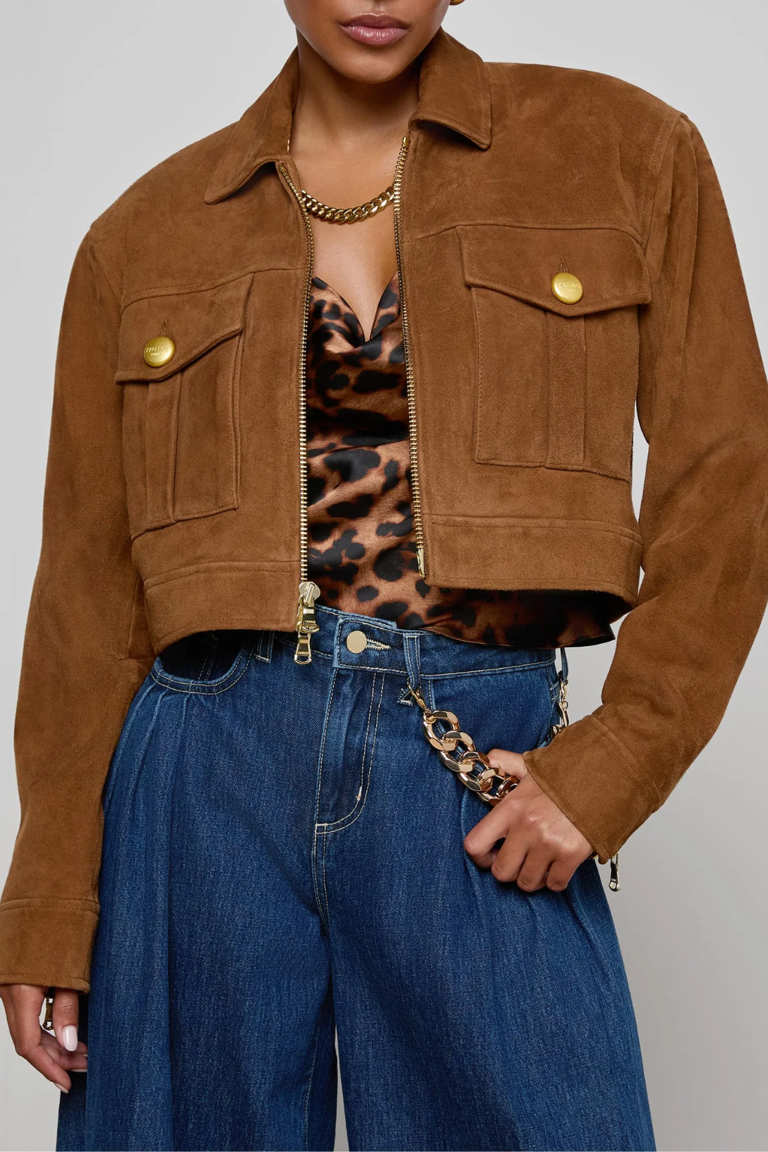 Crafted in substantial suede, the Micah jacket delivers effortless luxury with its cropped cut, sharp collar, oversized fit, and bold gold hardware. Throw it over denim for weekend cool or style it with a slip dress and boots for a refined edge. It's the ultimate upgrade to your everyday layers.