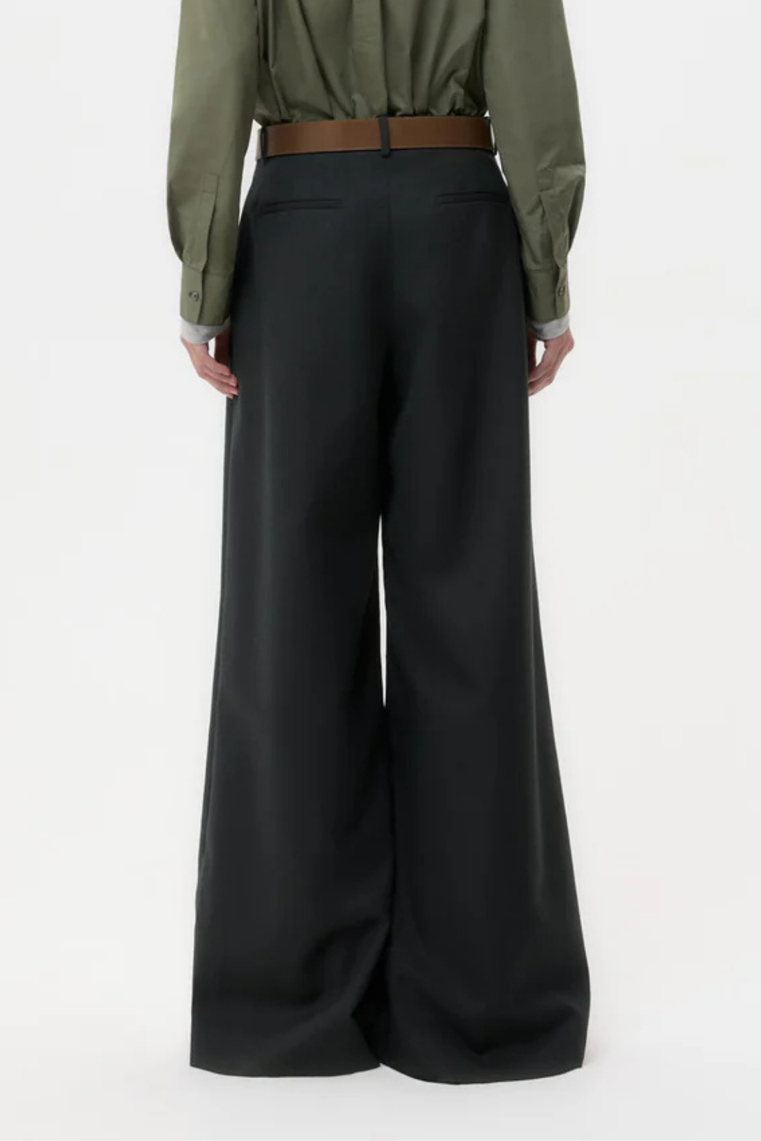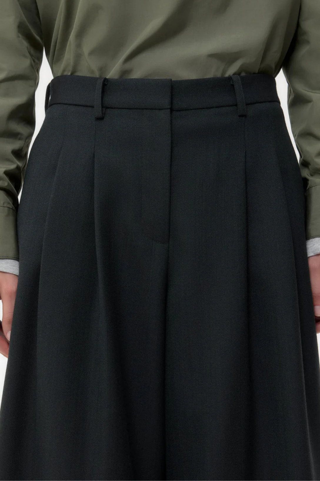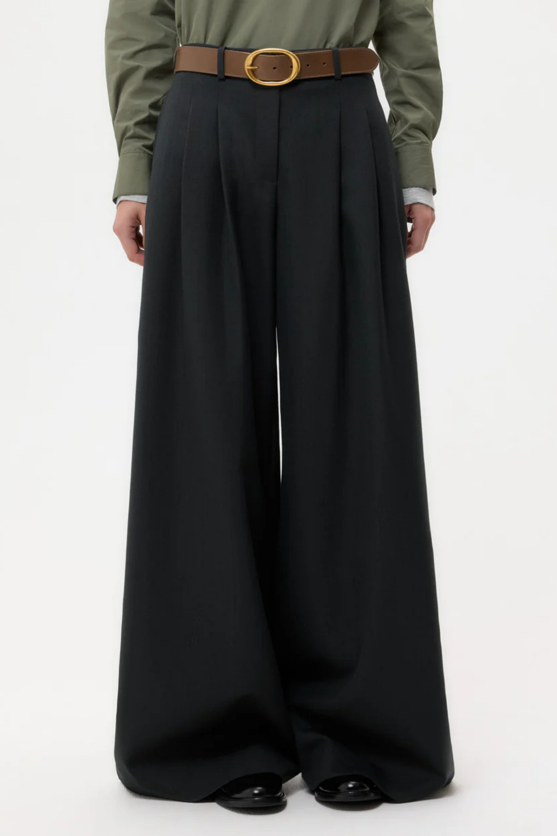 Mid-rise, wide leg pleated suit trouser in structured wool suiting. The Avery is relaxed through the hip and leg. Complete with side pockets, back welt pockets, belt loops, concealed zip, and hook and eye closure.