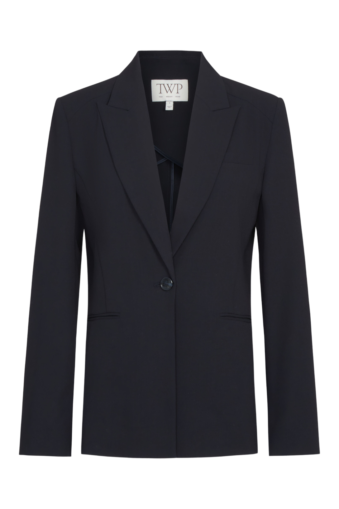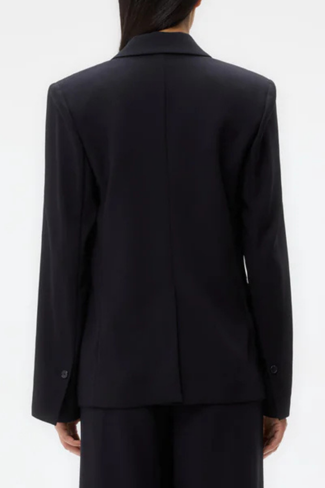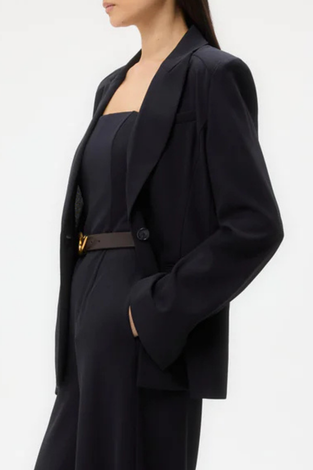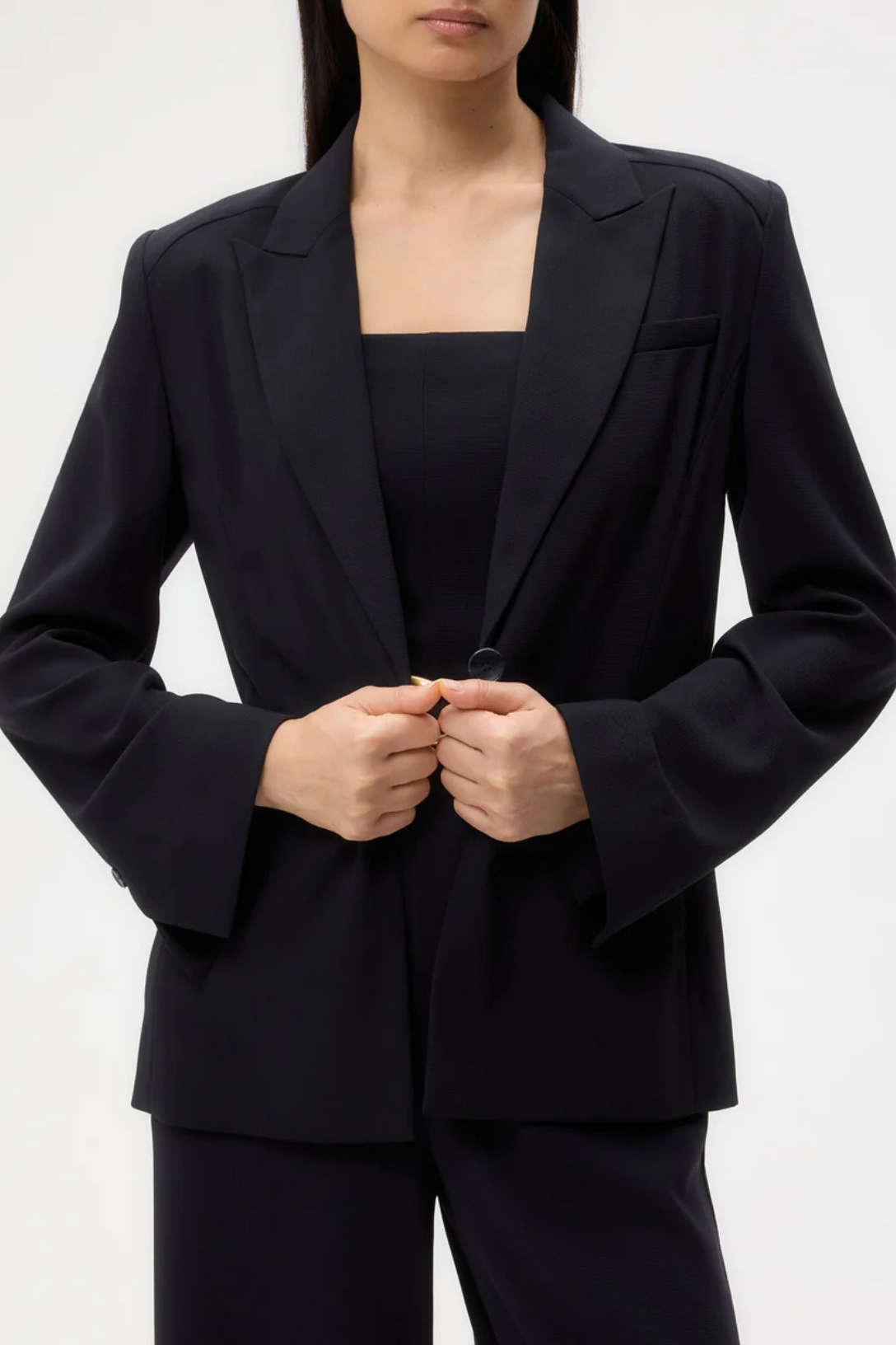 Oversized, one-button blazer tailored in drapey wool crepe. This wool suiting fabric has a natural elasticity and a crepe touch. The Boy Blazer is tailored with a peaked lapel and custom molded shoulder pads. Complete with side pockets, chest welt pocket and back vent.