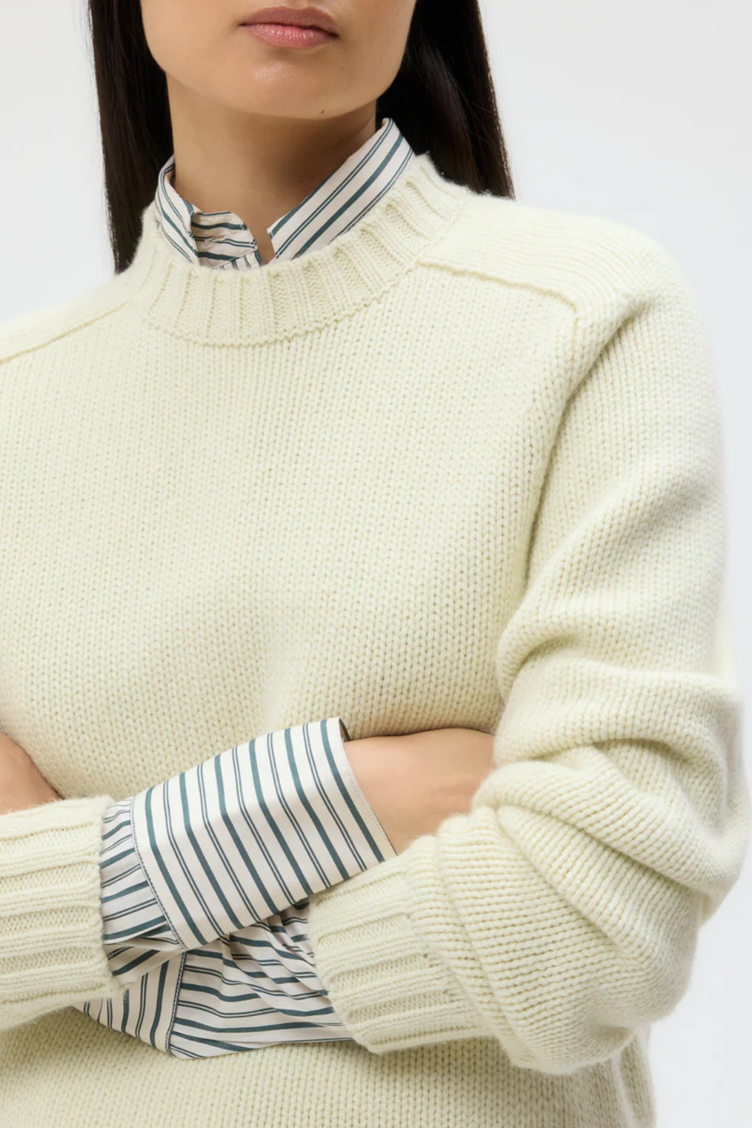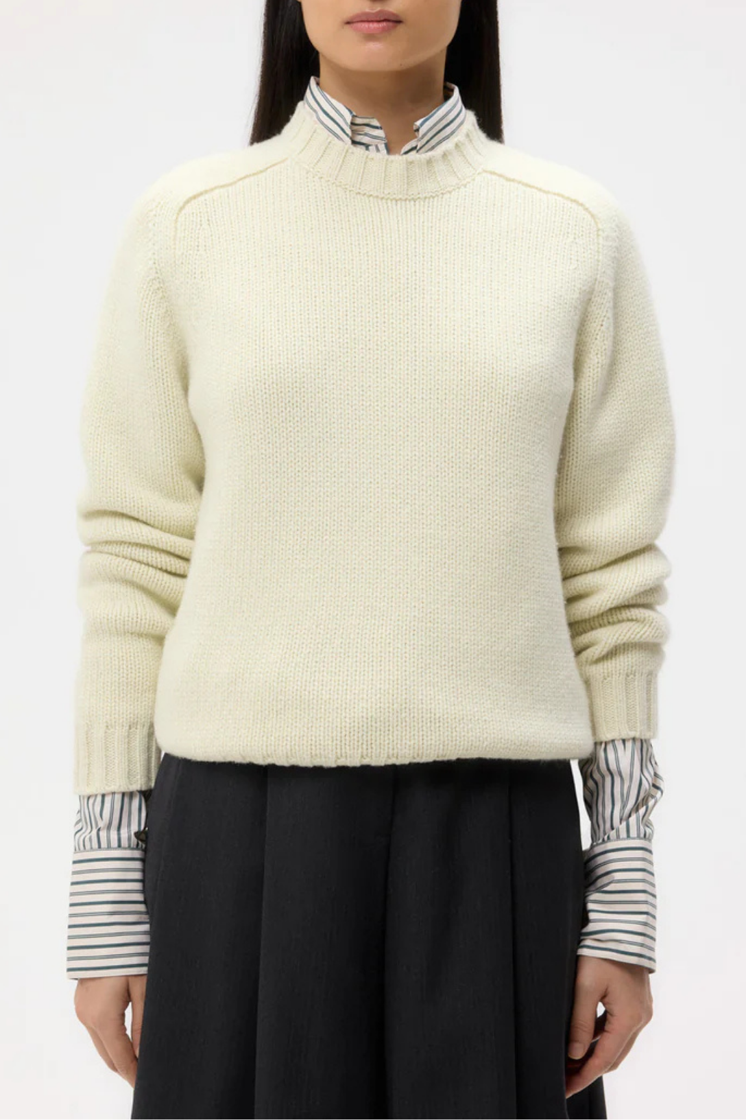Long sleeve, crewneck sweater knitted in five-gauge Italian cashmere. The cashmere is spun at an Italian heritage mill from single-origin yarns sourced for their unparalleled softness. The Jill Crewneck is a boxy fit, fully fashioned at the arm-holes. Complete with a ribbed finish at the collar, cuffs and hem.