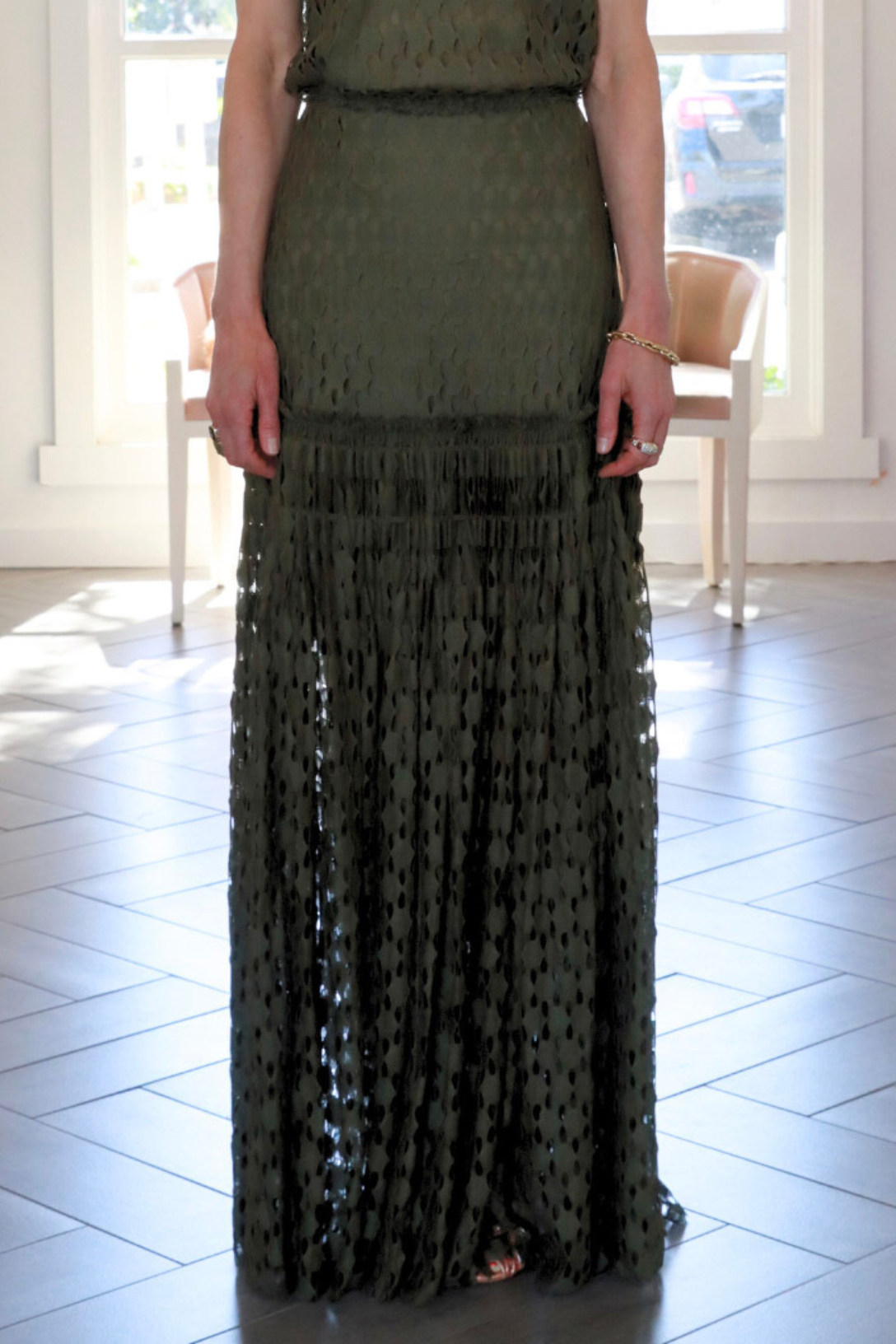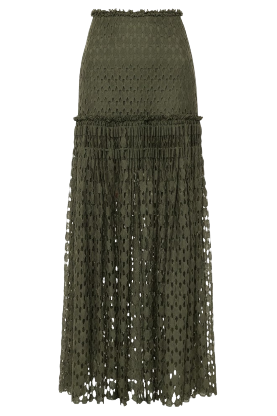 The Aris Skirt reinterprets lace traditions, inspired by a heritage needle lace from Alençon, France. Featured in Look 19 on the SS26 Runway, this Pine green skirt is alive in geometric openwork that references pointillism art and gracefully unveils at every step.