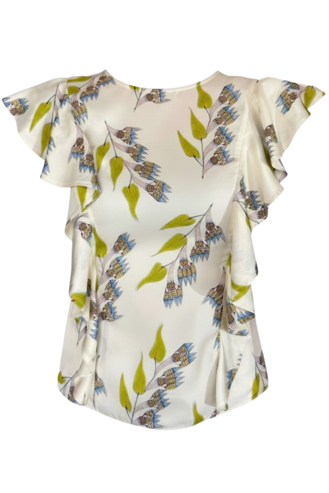 The Botanical Top is alive in poetic detailing—the florals are from the ethereal, fantastical work of Art Brut painter Anna Zemánková, while the cascading ruffles bring surface dimension to the silhouette. It is cut from pure silk twill sourced from Italy.