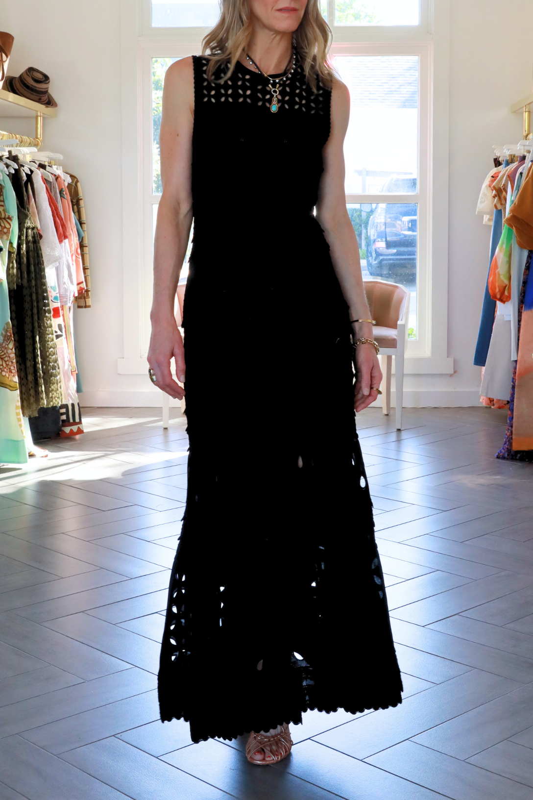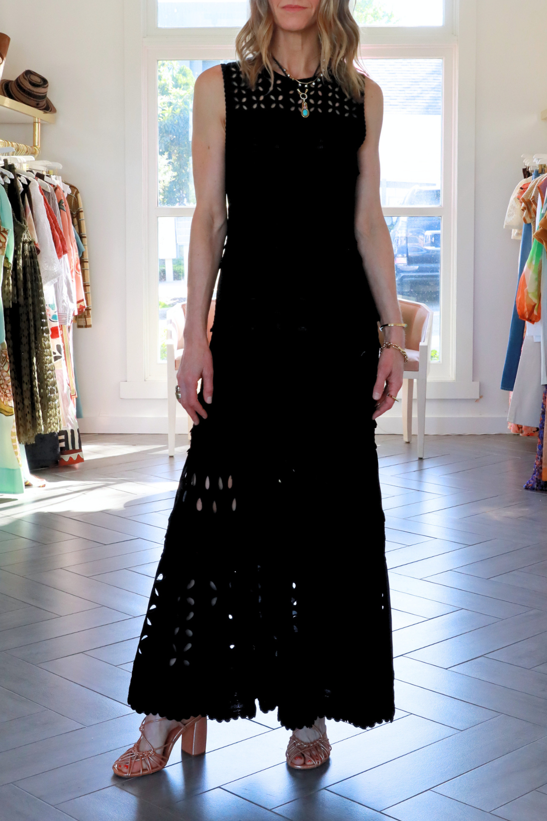 Softly alluring, the Lakshmi Dress is a rich combination of graphic eyelet embroidery and scalloped ruffles that add dimension to the silhouette. This maxi dress has full volume in the hem and arrives in black for endless versatility.