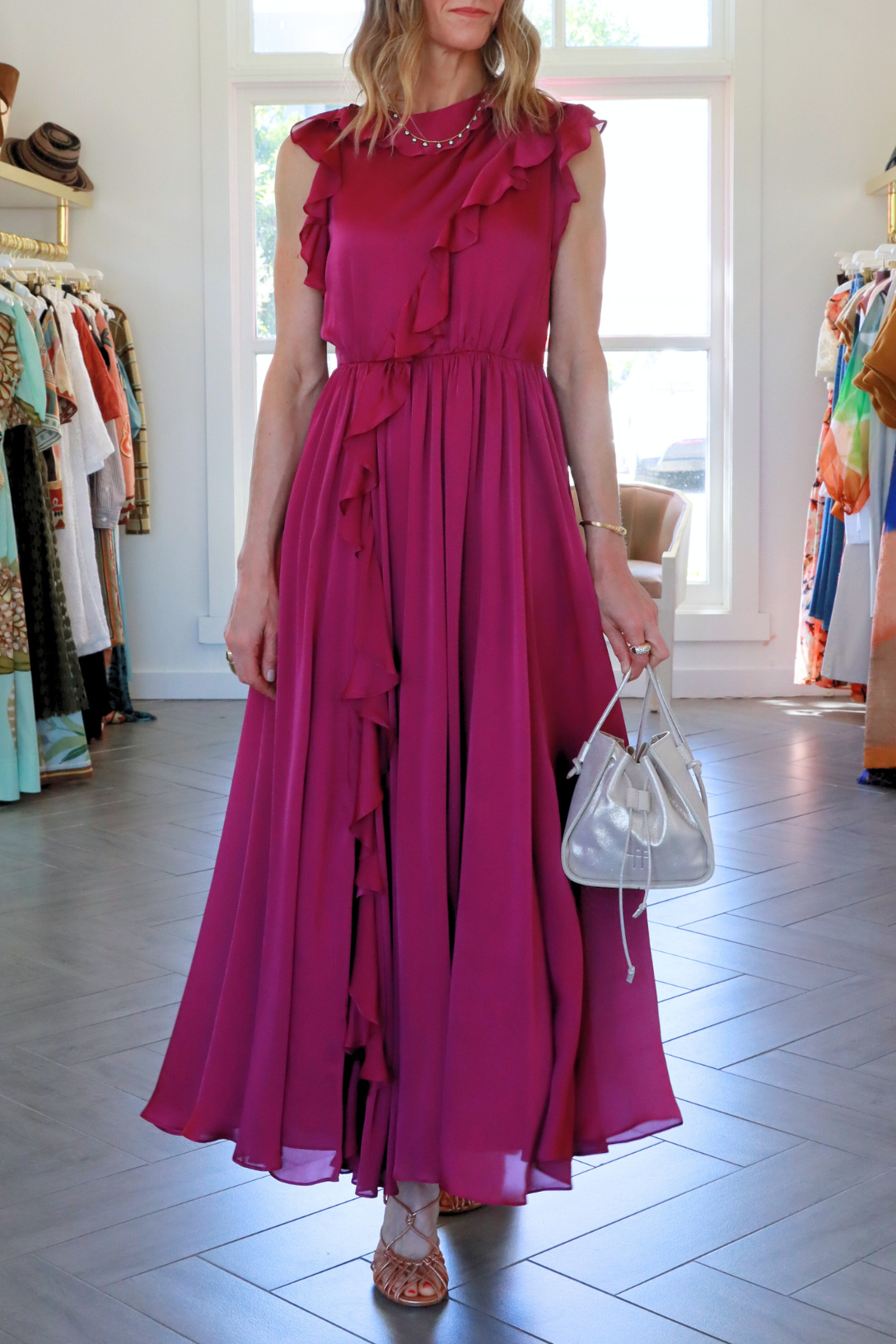 The Saanvi Dres whispers soft elegance—it is crafted from vivid pink silk chiffon with a satin finish and is artfully draped across the bodice and finished with cascading ruffles.