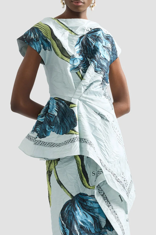 Floral Print Textured Satin Draped Midi Skirt | Etched Tulip Powder Blue