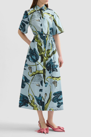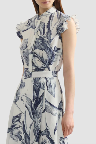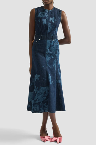 Printed Denim Sleeveless Midi Dress | Dutch Flower Painting Indigo
