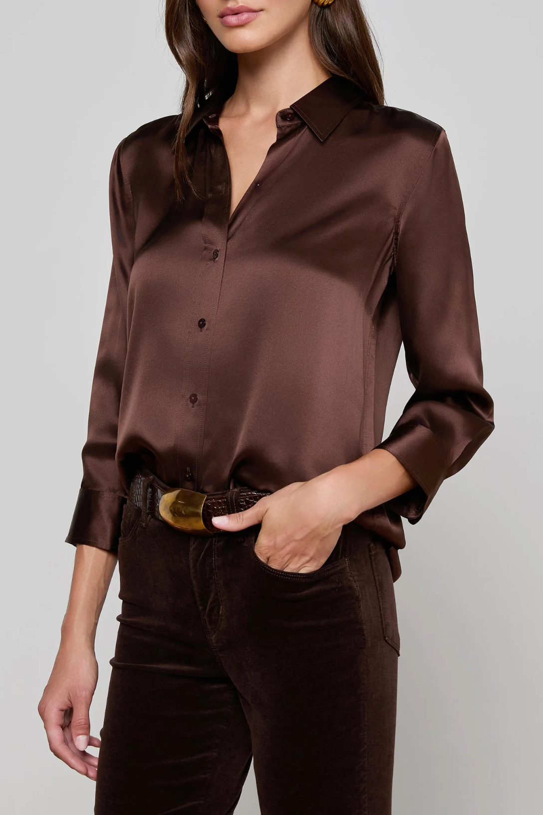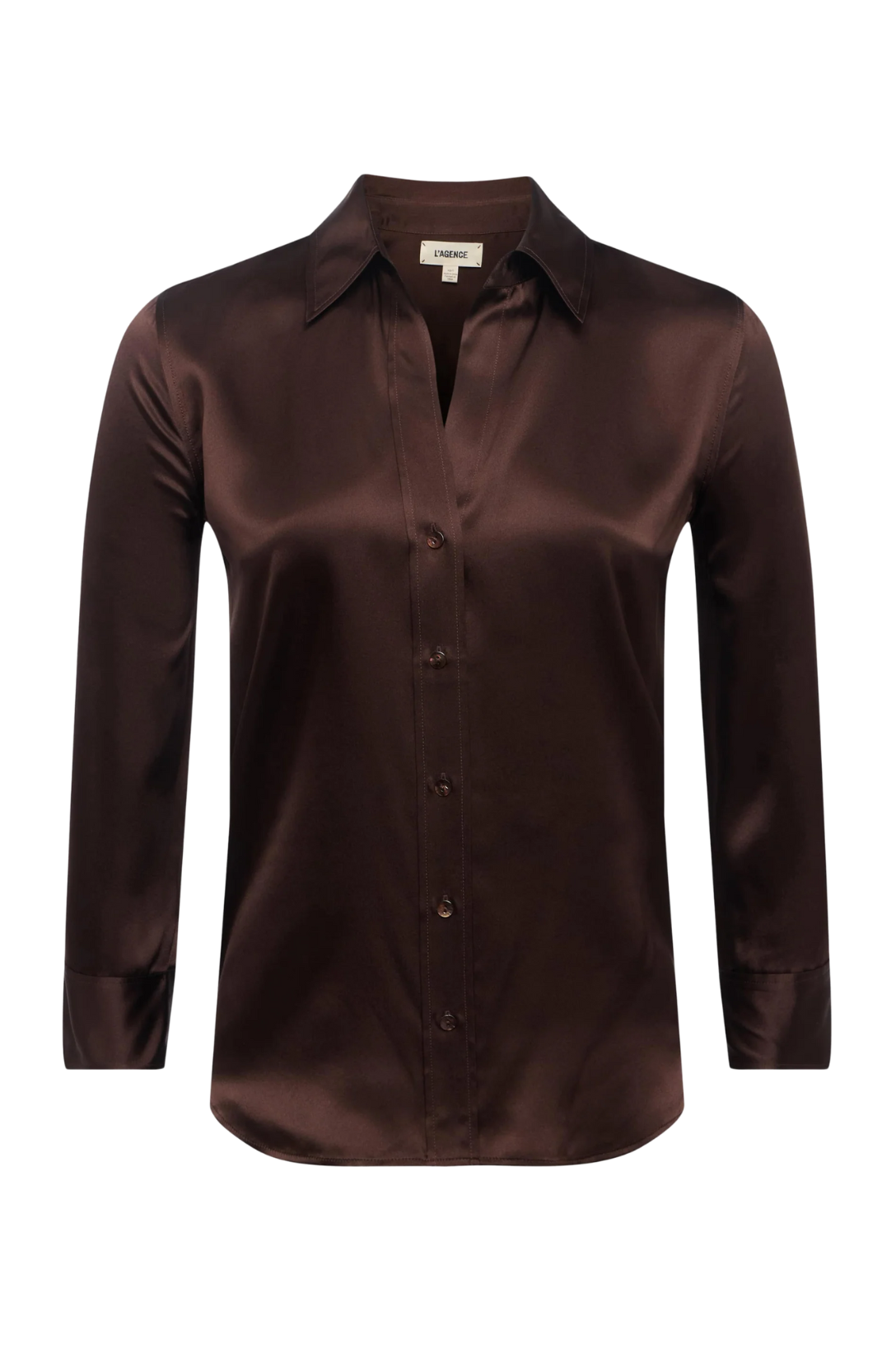 Meet the iconic silk button-down that belongs in every wardrobe. L'AGENCE's signature three-quarter sleeve shirt is available in rich coffee bean brown.