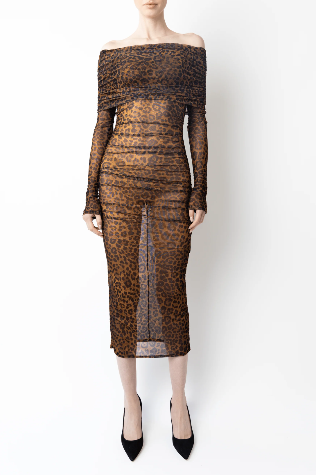 Stretch mesh off the shoulder midi dress in LAPOINTE's new custom leopard print. Features ruching throughout.