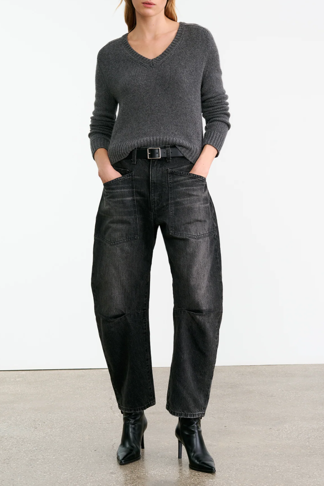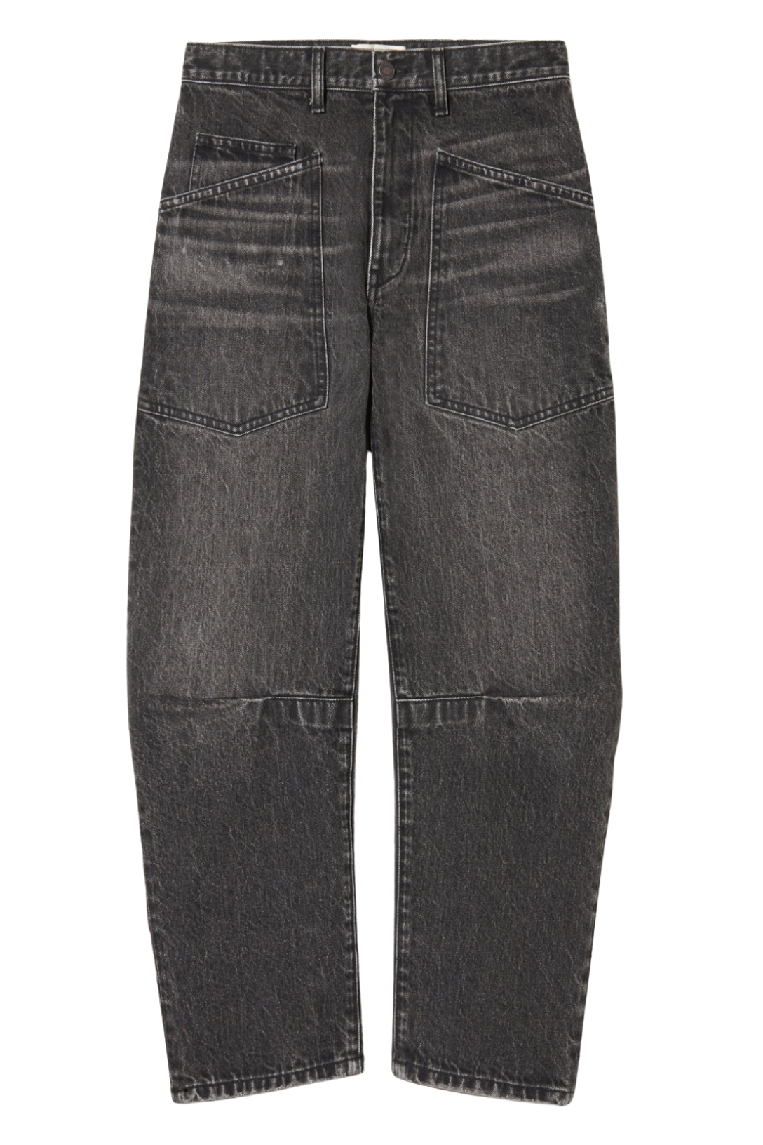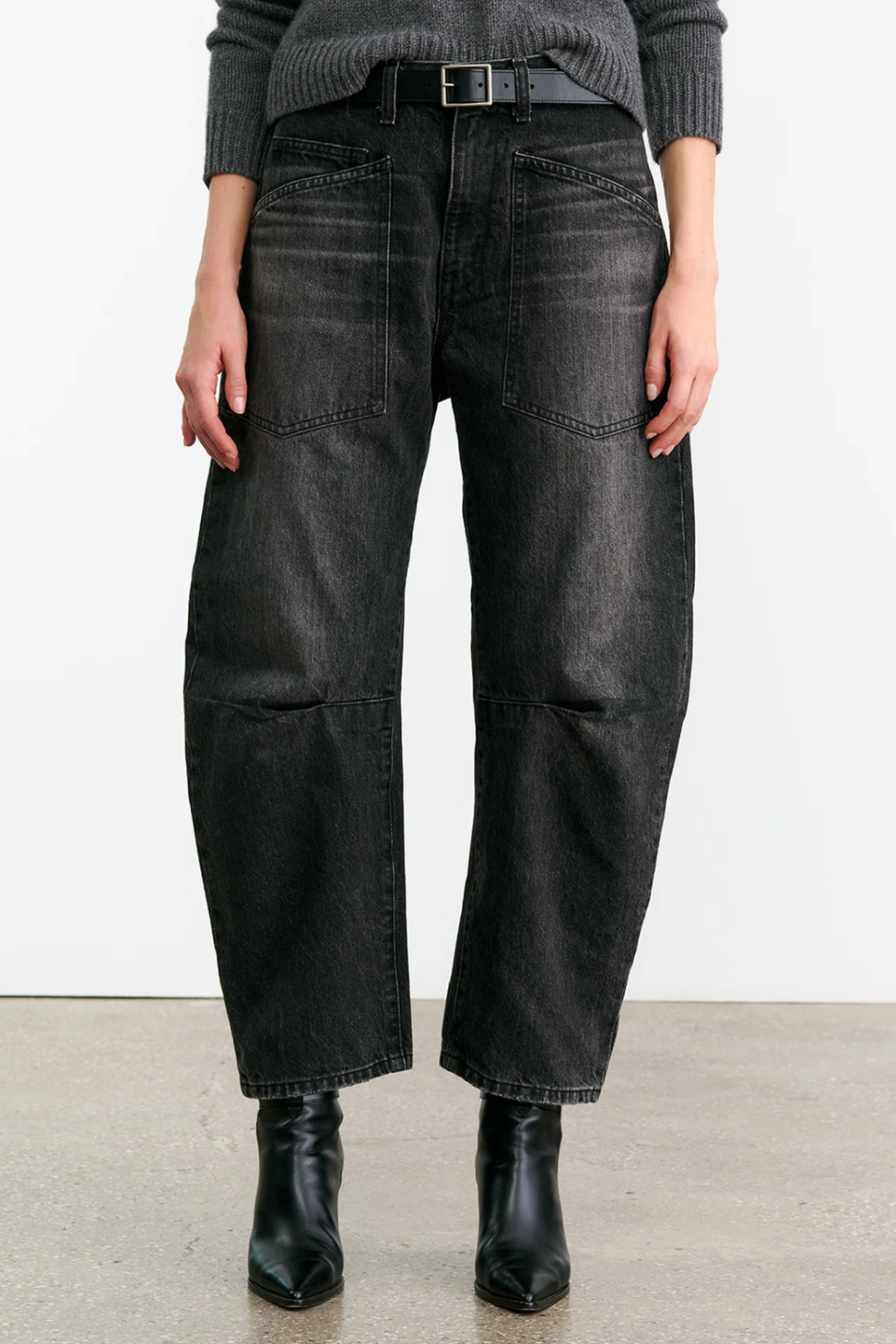 Mid-rise, relaxed fit barrel leg jean. Uniquely curved silhouette. Seam detail at knees. Gusset at inseam. Zip fly. Shank closure. Top-stitched front and back patch pockets. Belt loops.