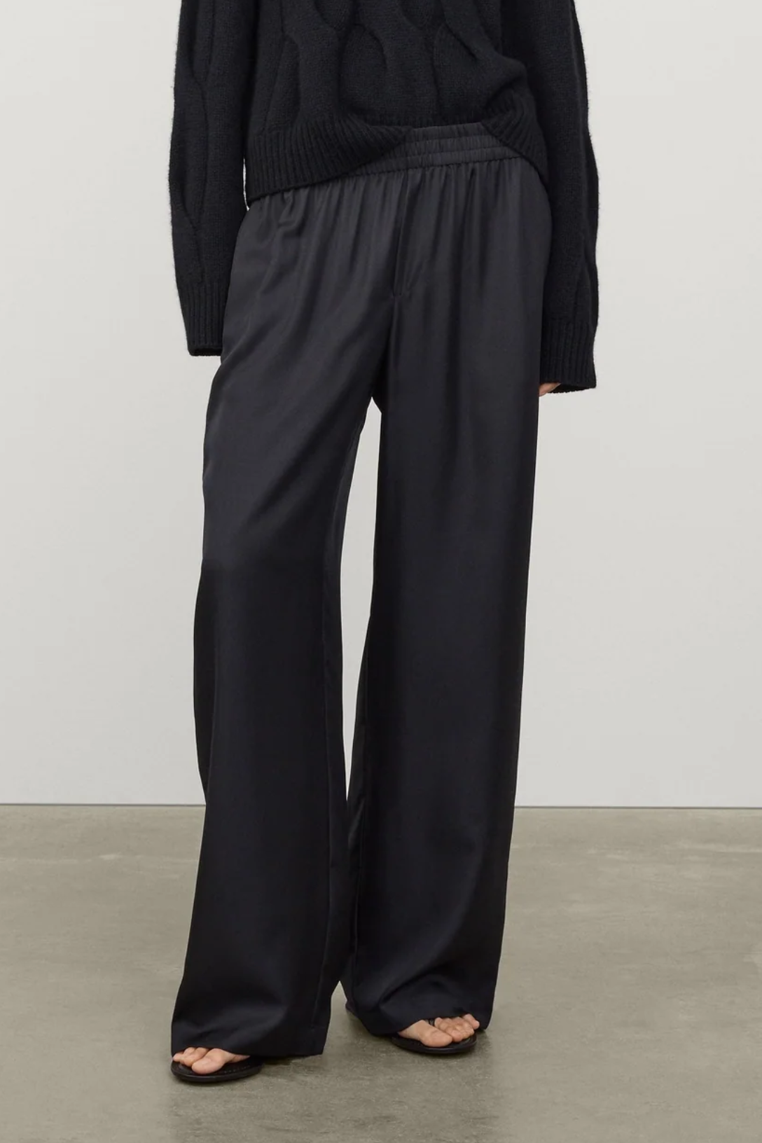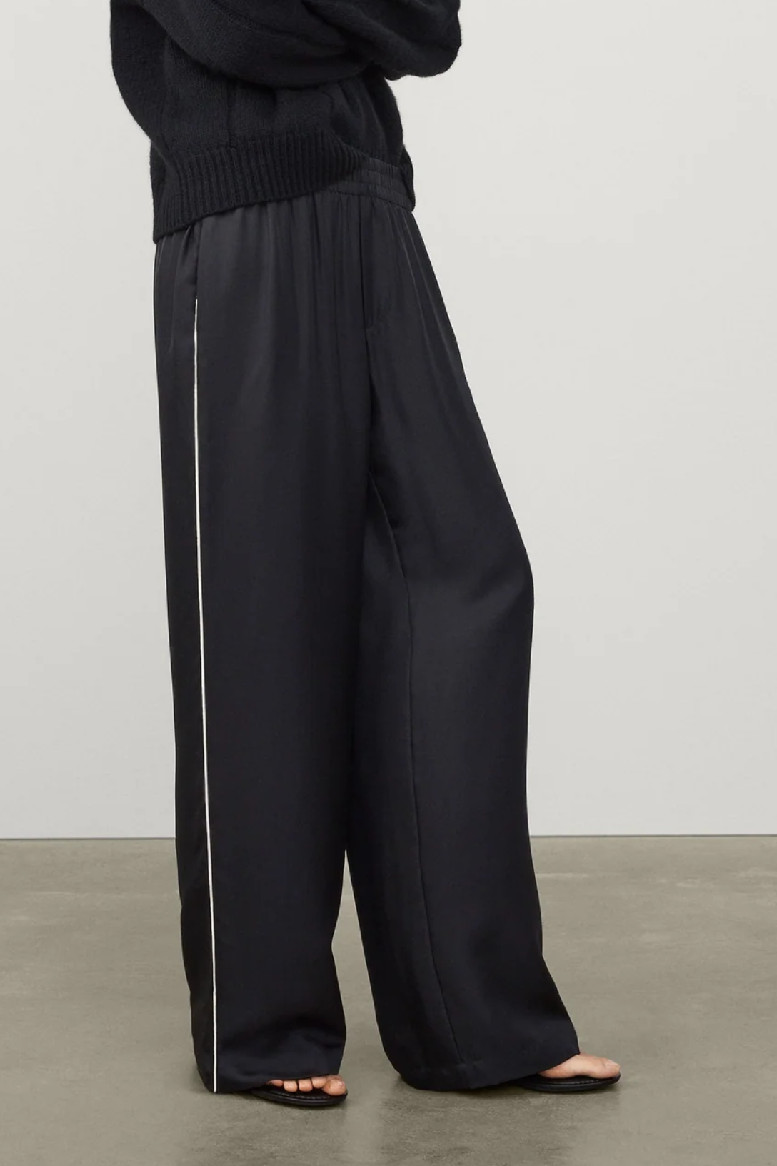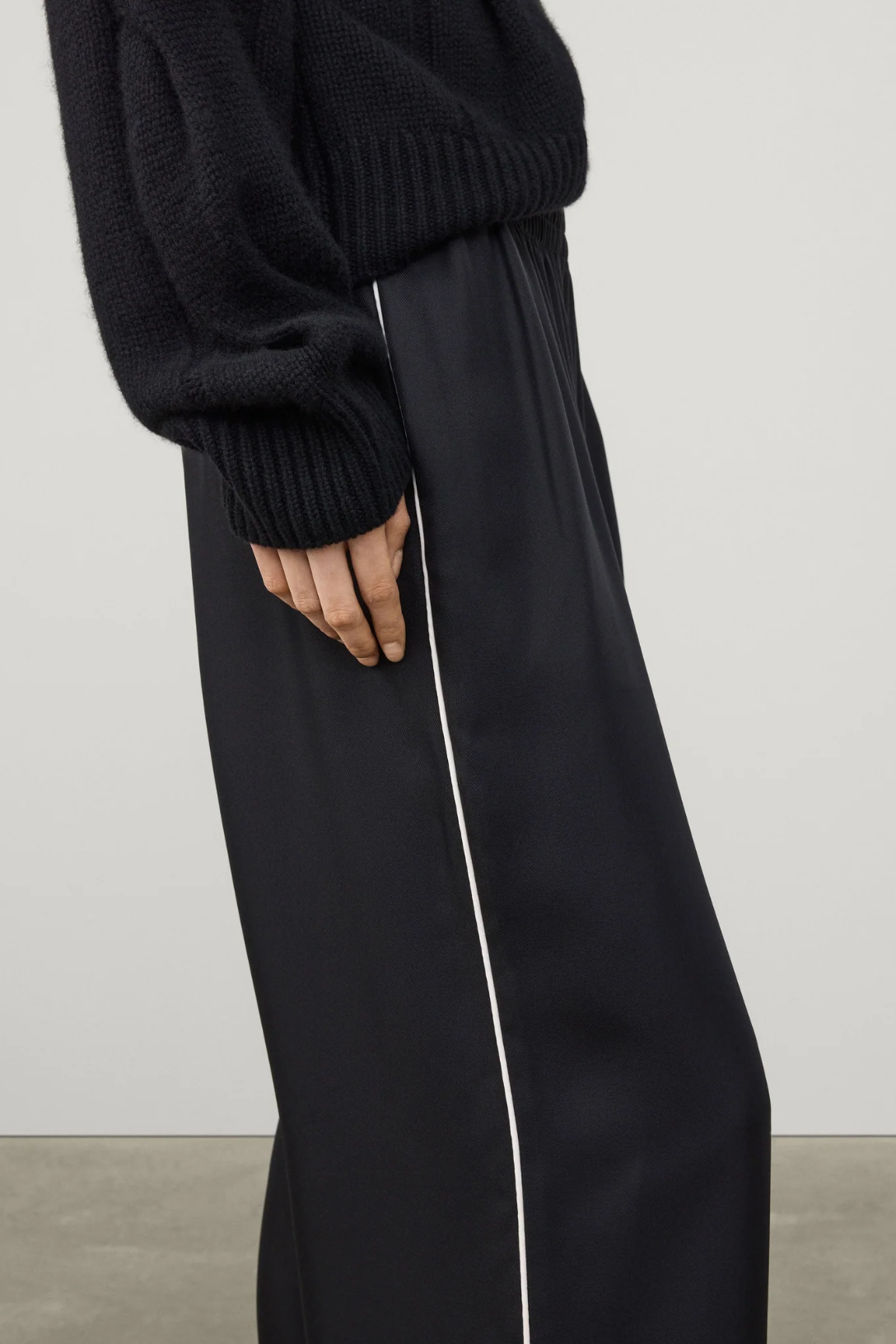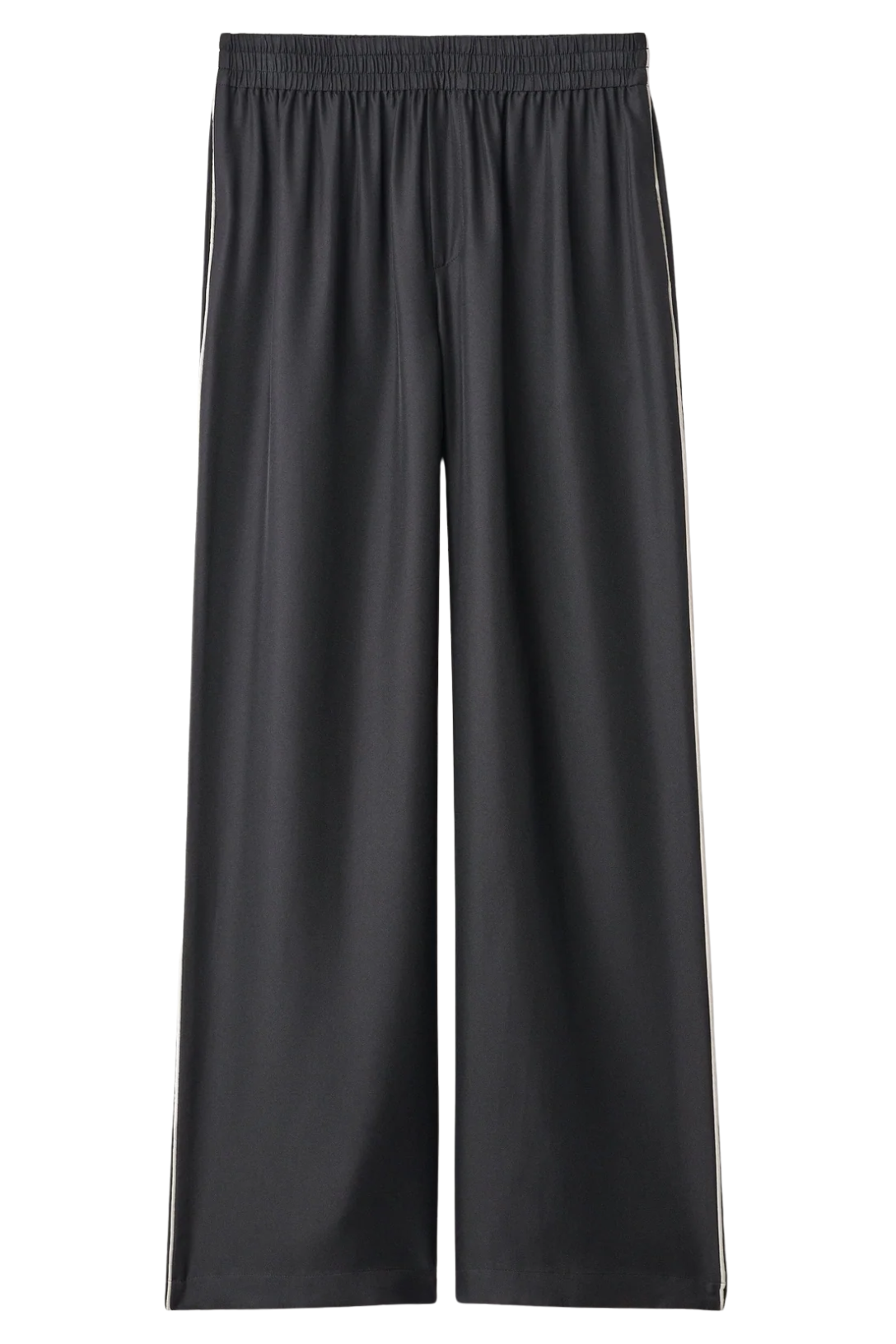 A sporty articulation of silk, the wide leg trousers are crafted in woven silk twill with a subtle shine. The relaxed fit, wide silhouette falls from an elasticated high waist into full-length legs and is finished with a contrast piping along the sides.